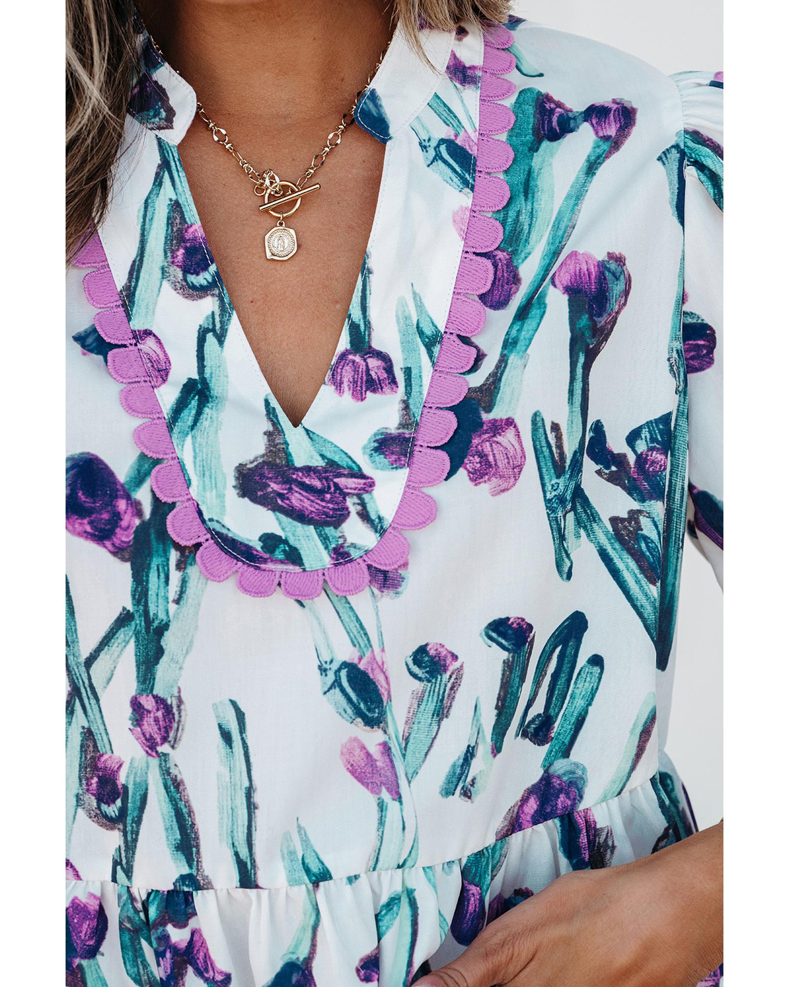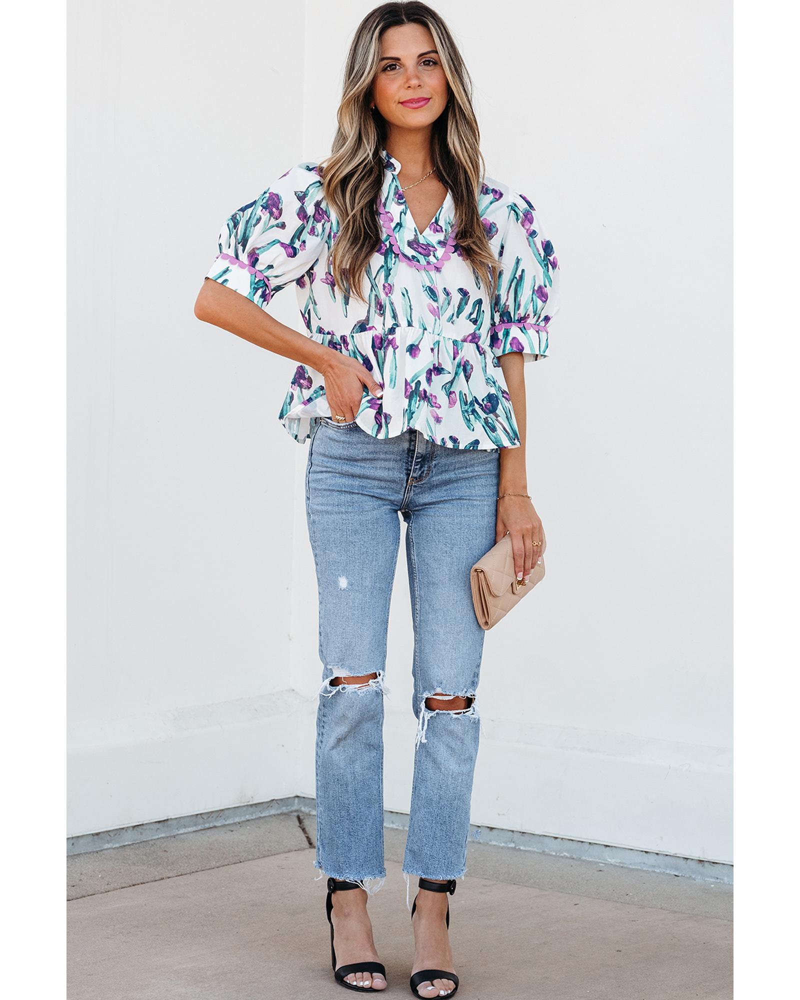 Purple Floral Ricrac Trim Half Sleeve Peplum Top – L