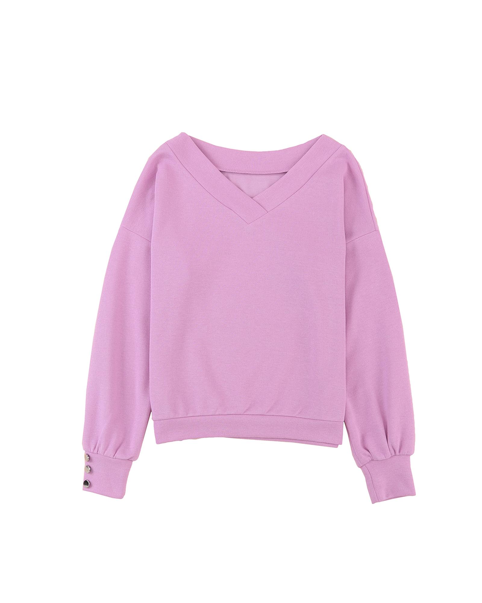 - Purple Knitted V Neck Buttoned Cuffs Sweater