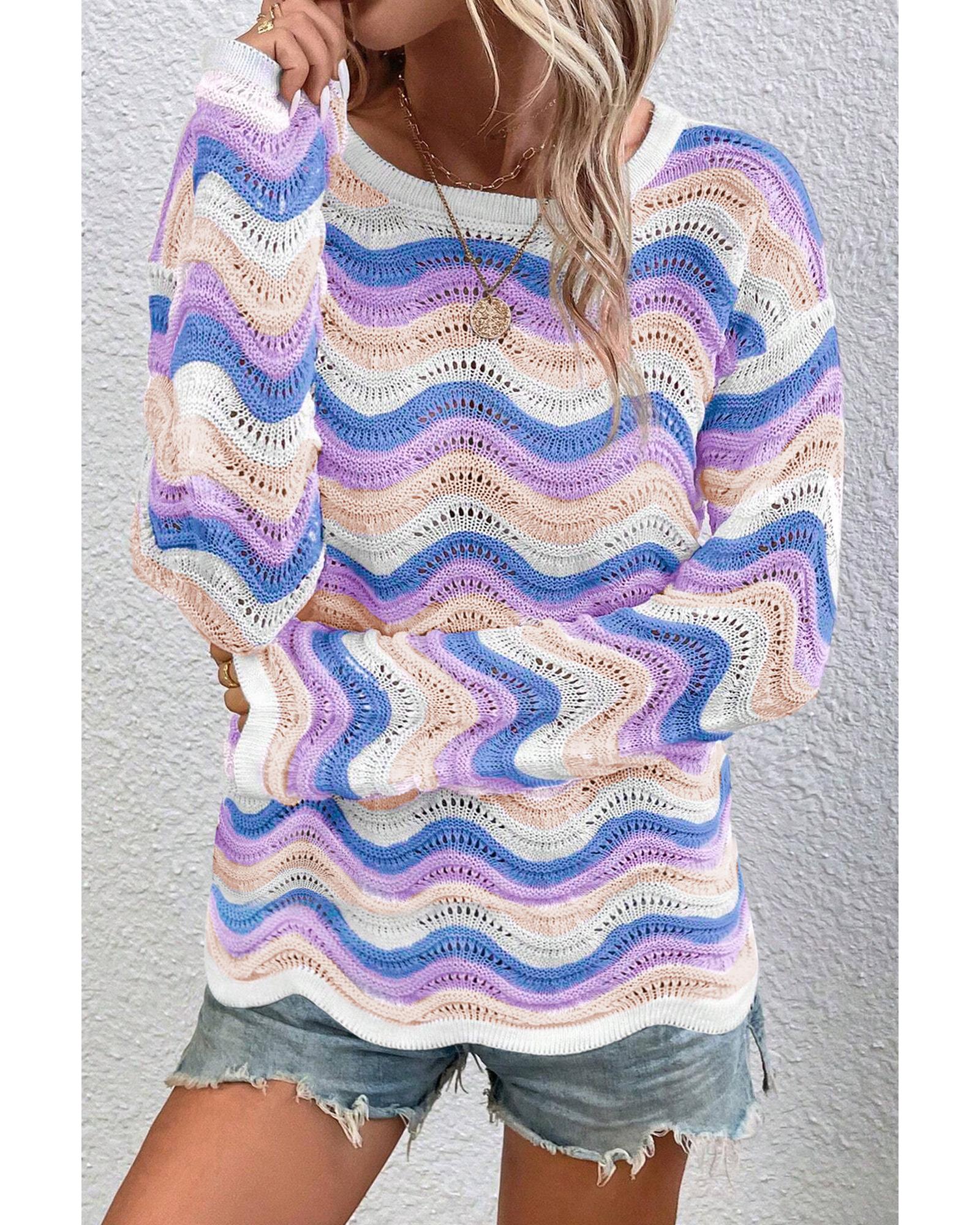 Purple Stripe Wavy Pointelle Knit Drop Shoulder Sweater – S
