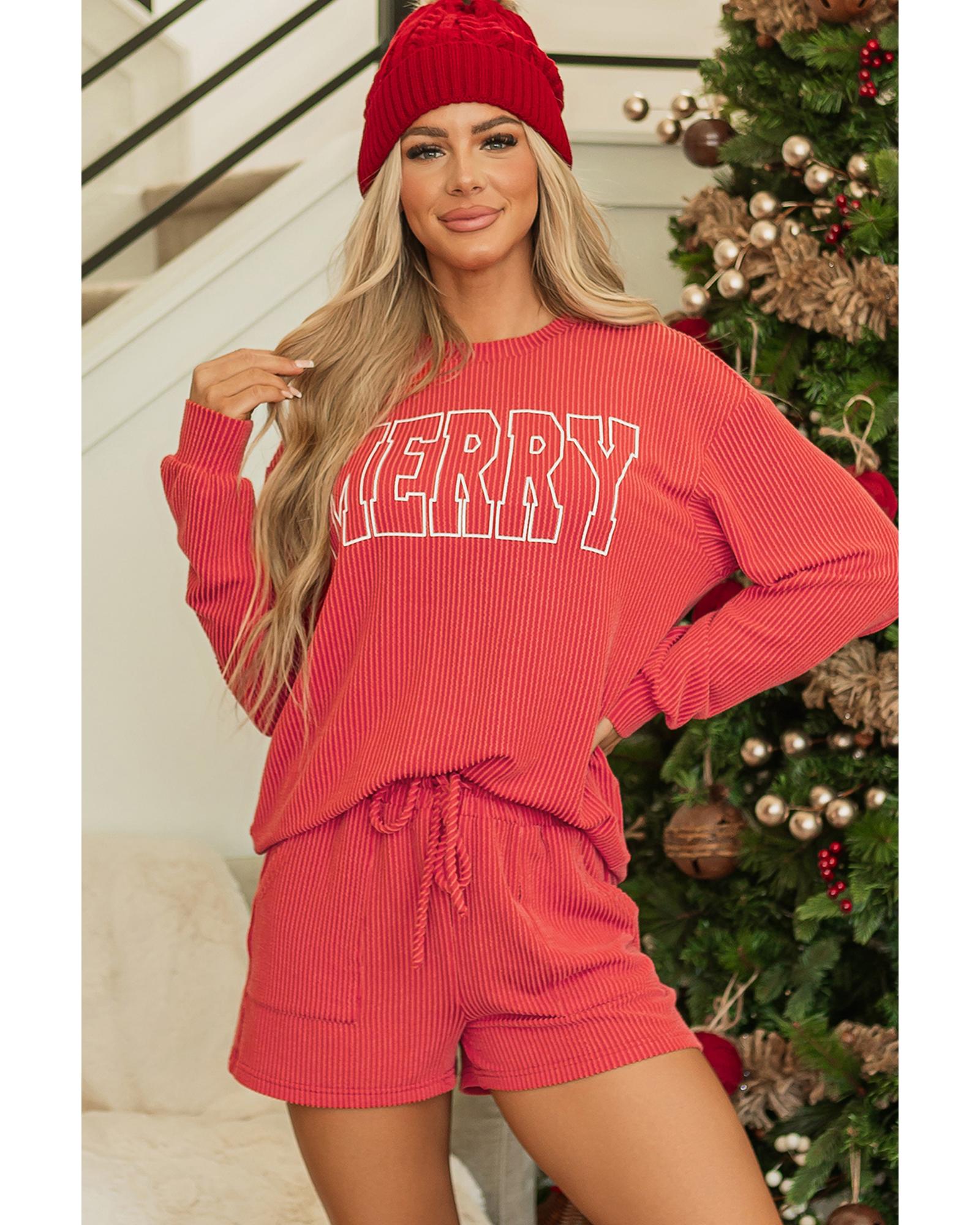 - Racing Red Corded MERRY Graphic Long Sleeve Top and Shorts Set