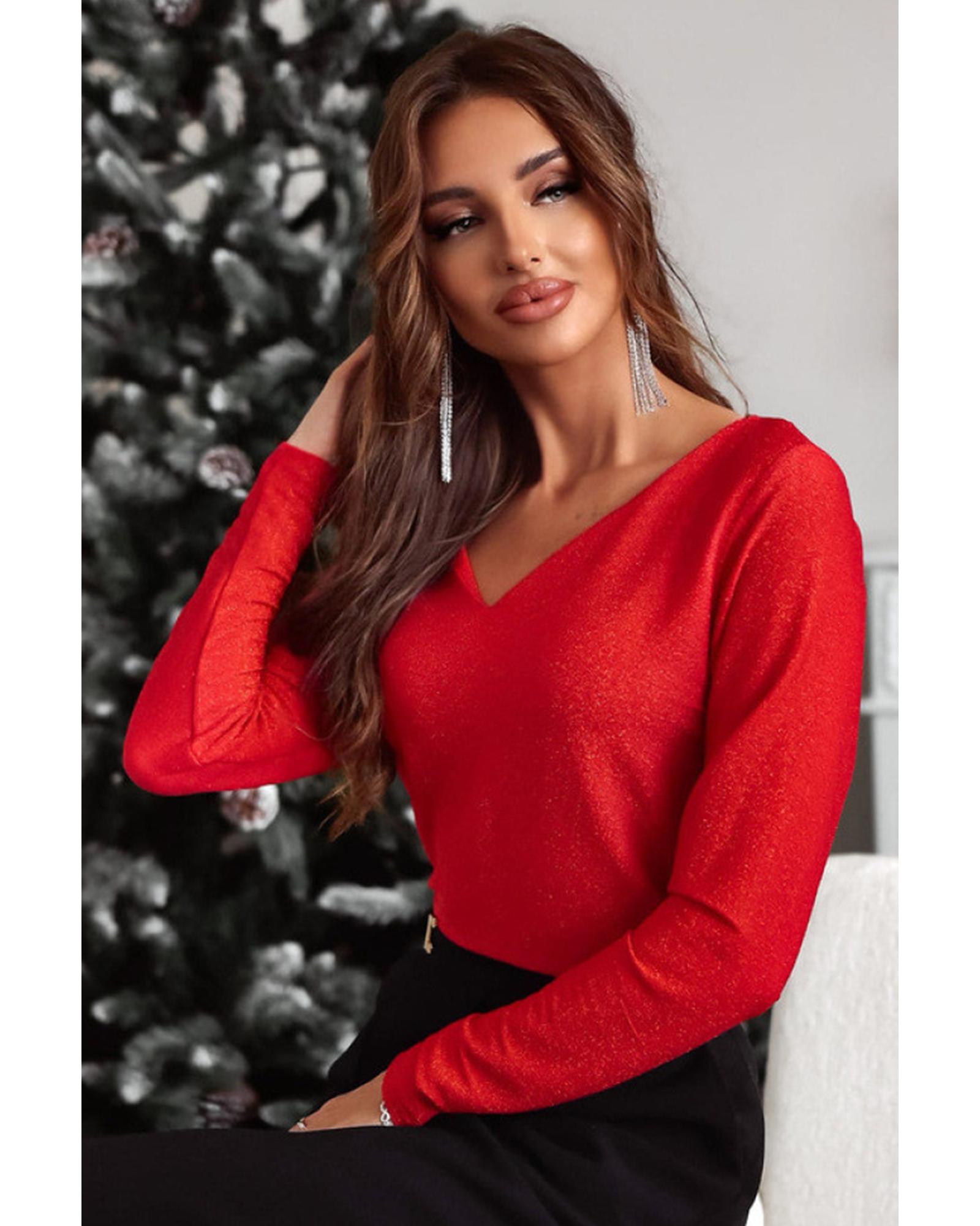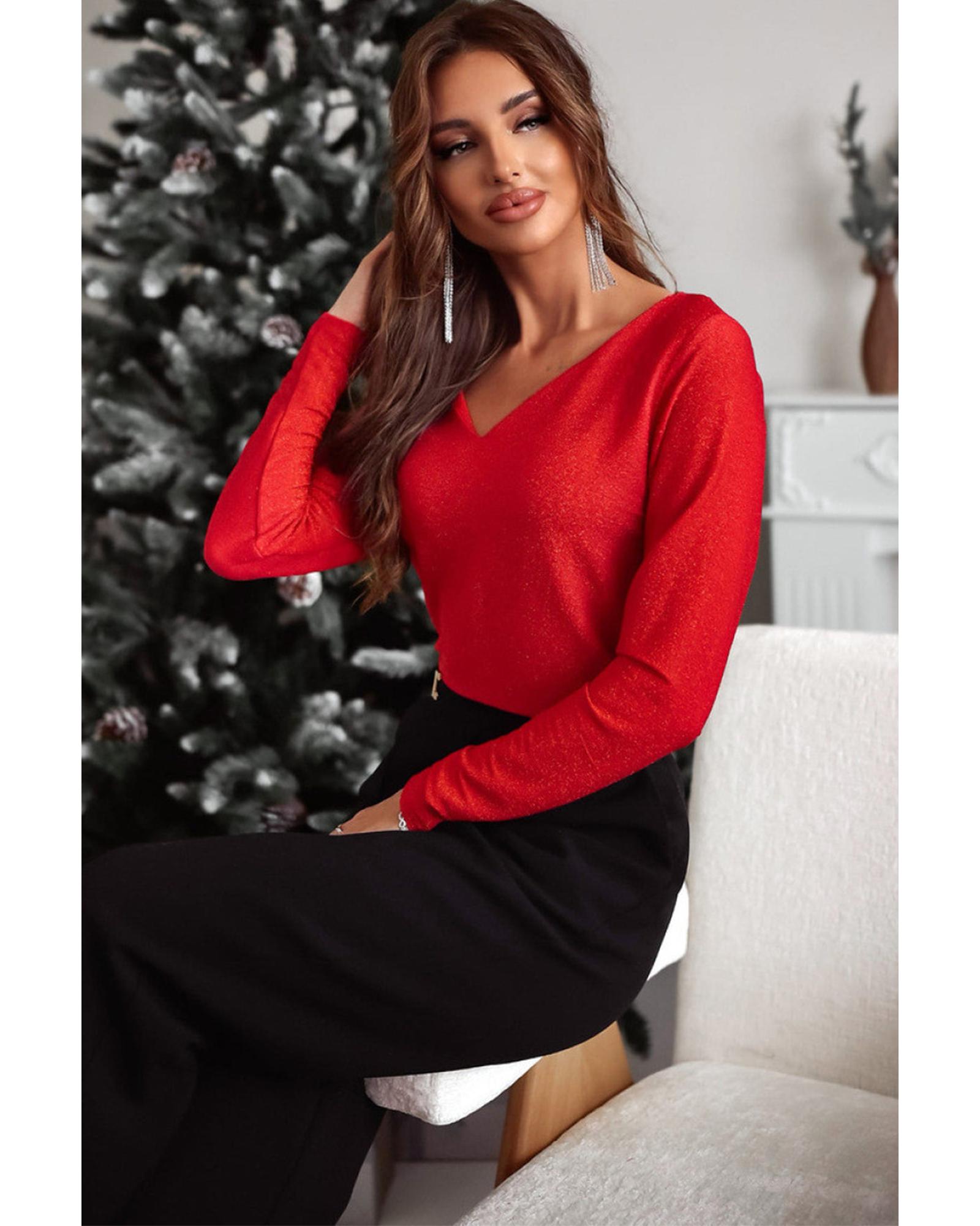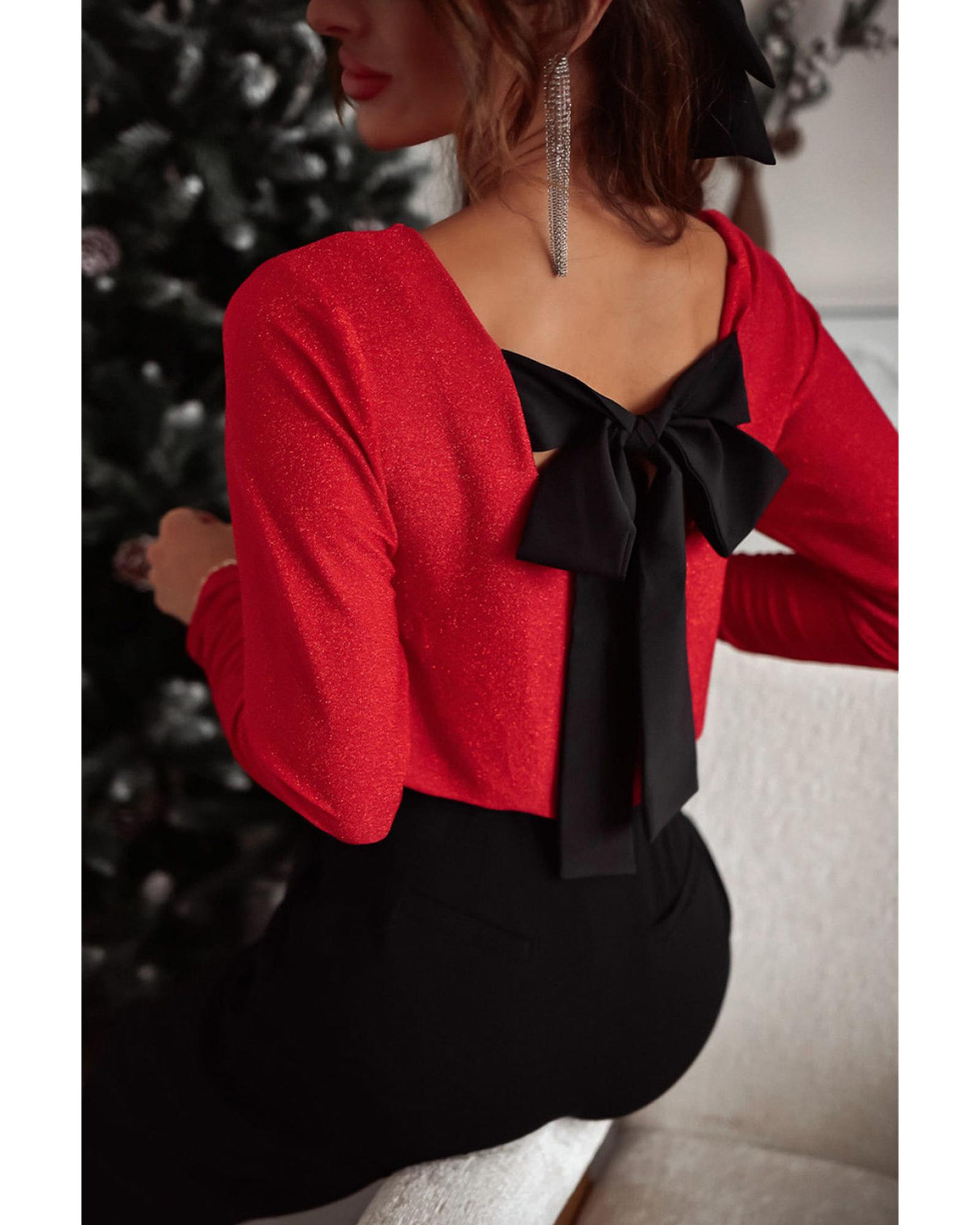 Racing Red Metallic Bowknot Open Back V Neck Top – L