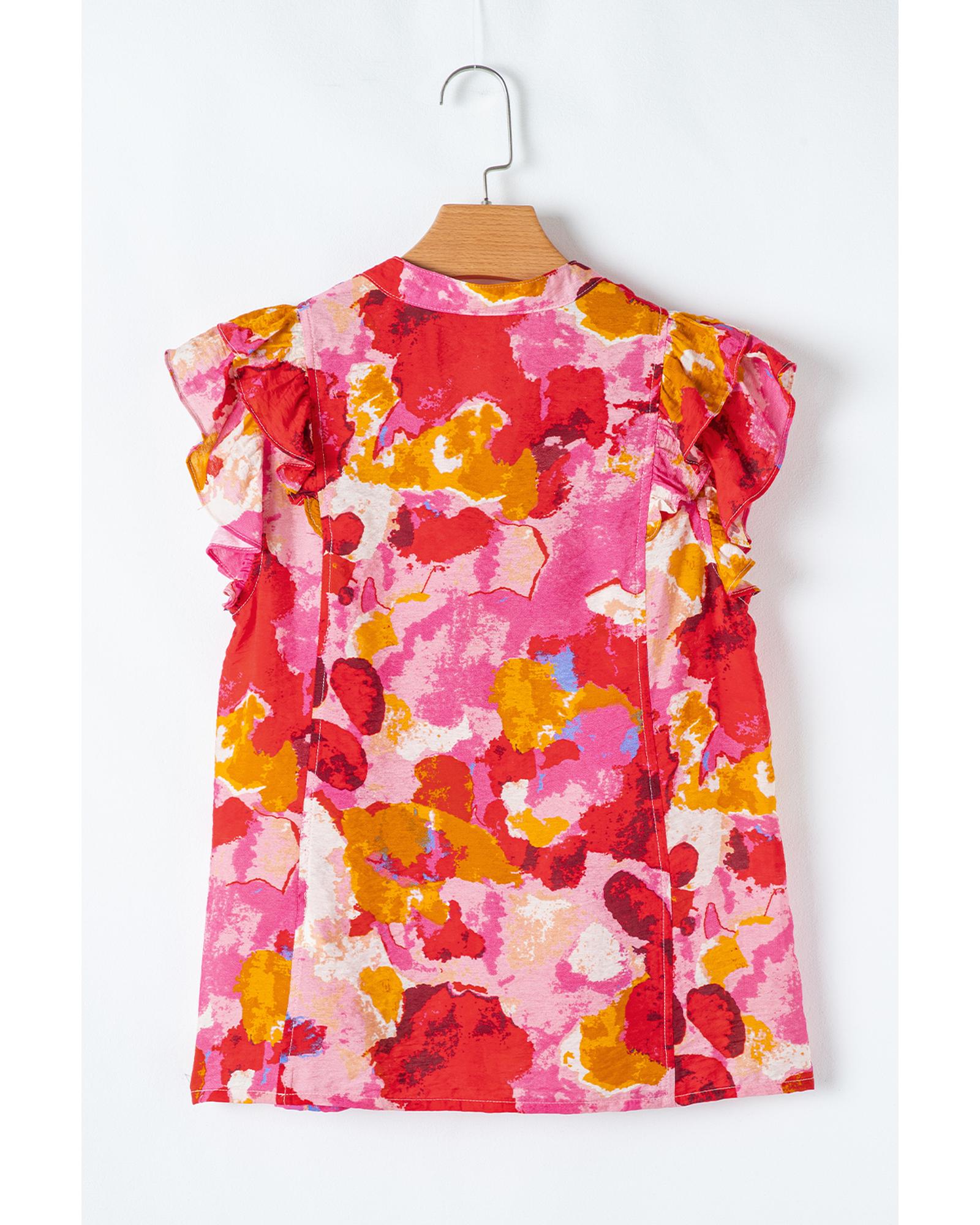 Red Abstract Print Split V Neck Ruffle Short Sleeve Blouse – L