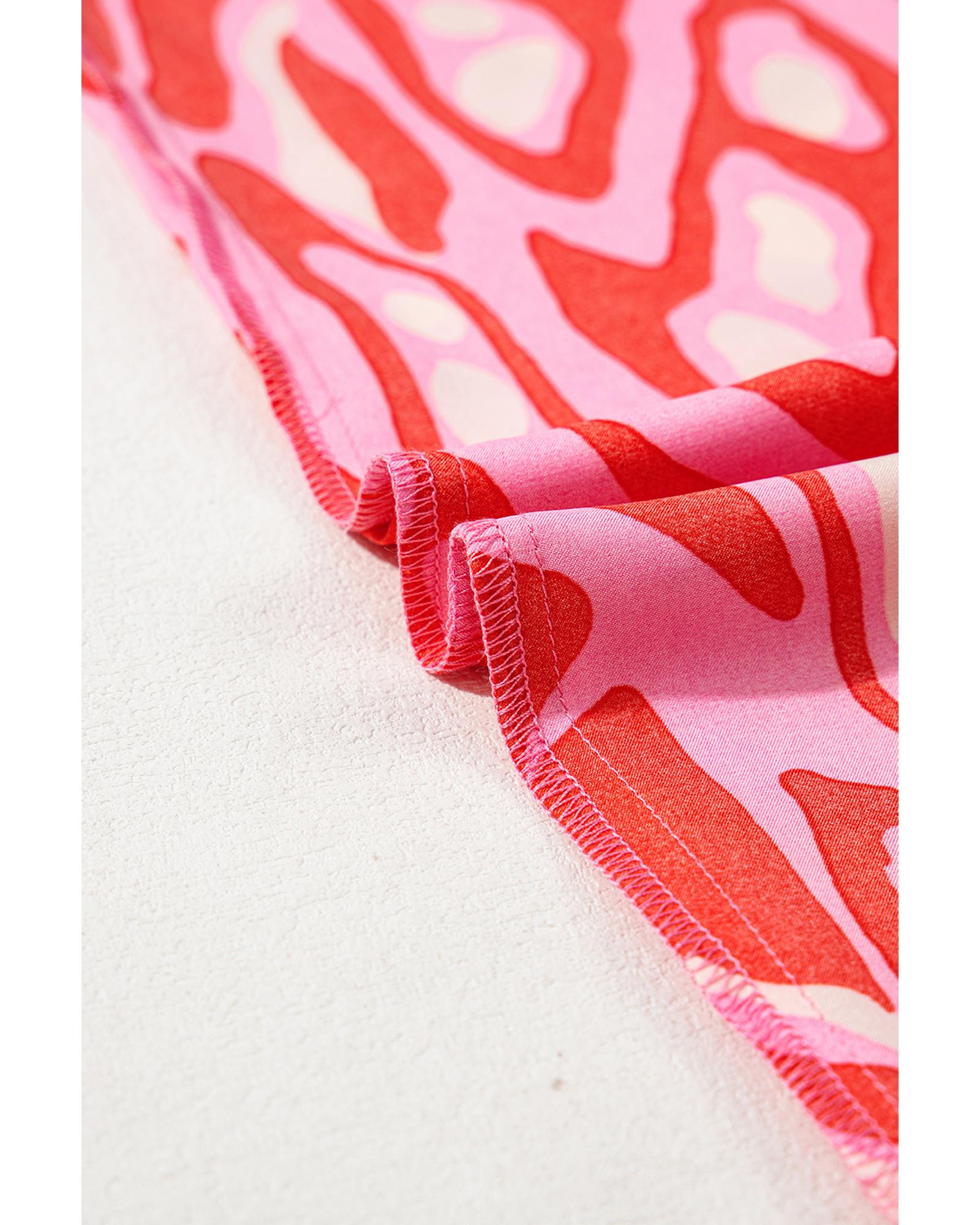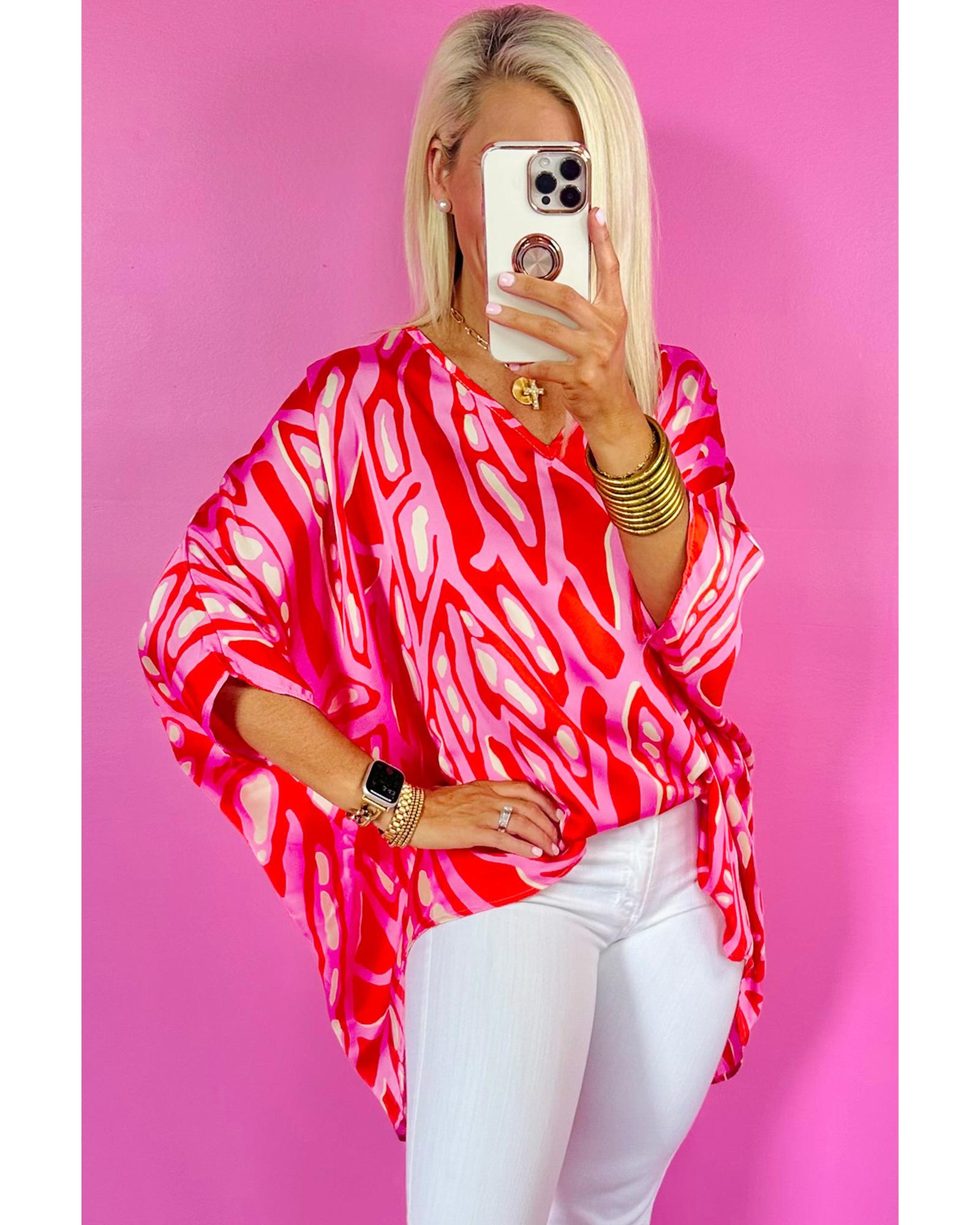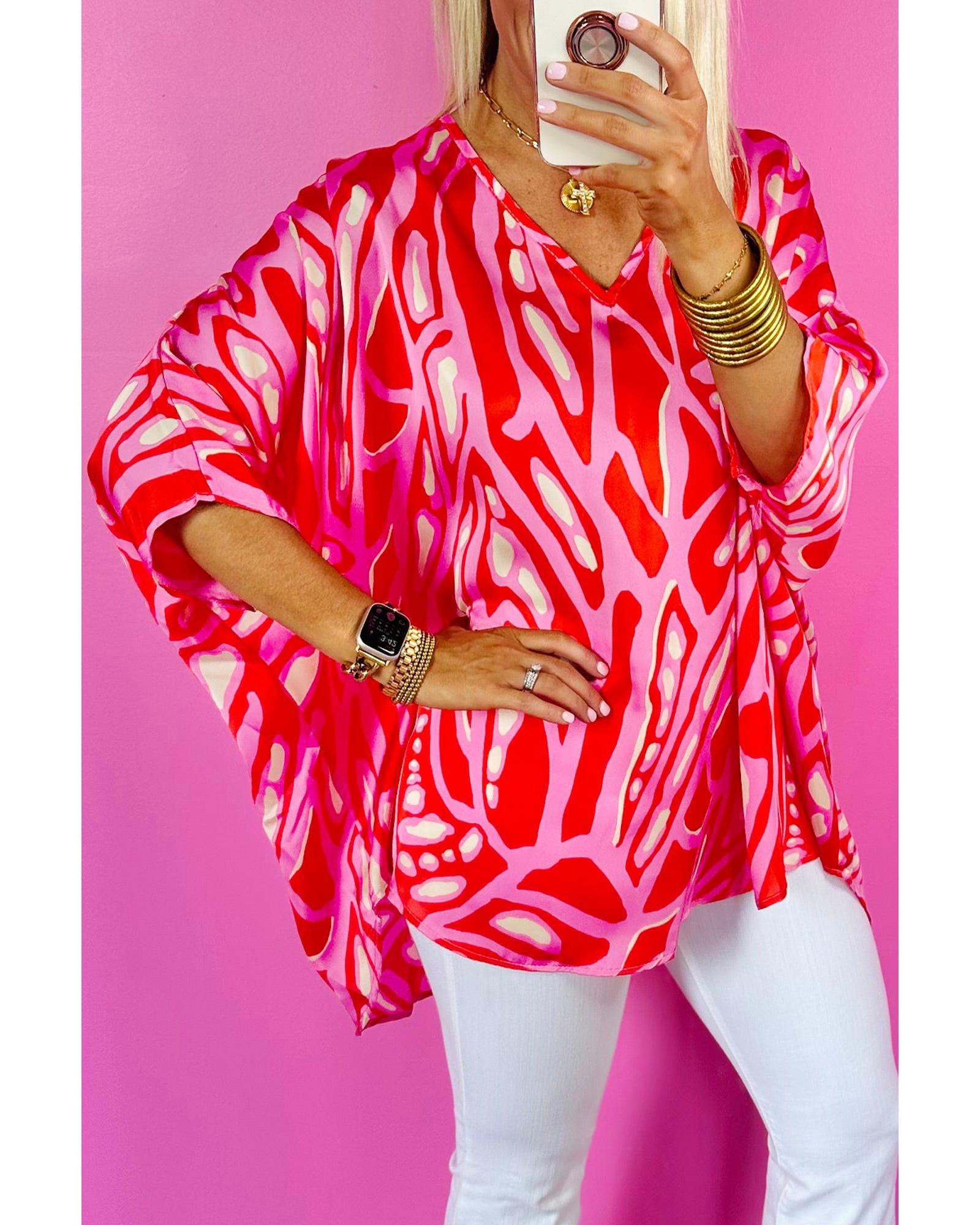 Red Abstract Print V Neck Batwing Sleeve Oversized Blouse – L