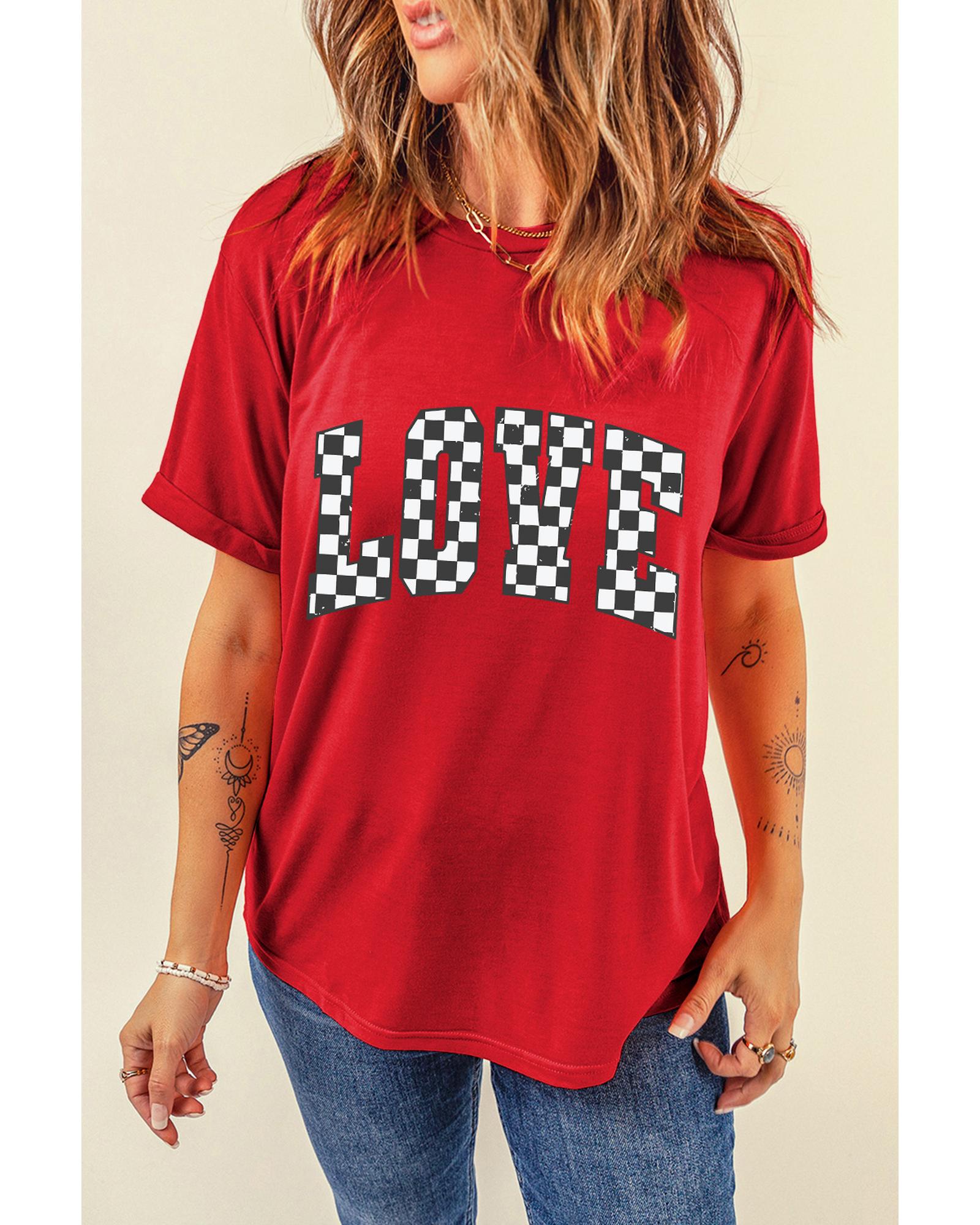 Red Checkered LOVE Letter Graphic Valentines T Shirt – 2XL