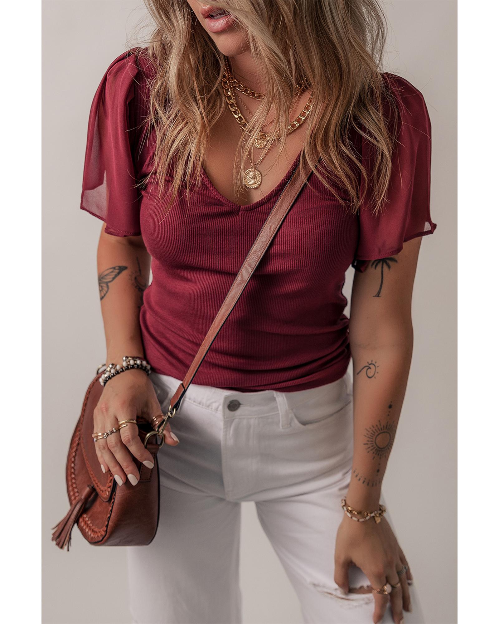 Red Dahlia Mesh Ruffled Sleeve Slim Fit V Neck Top – M