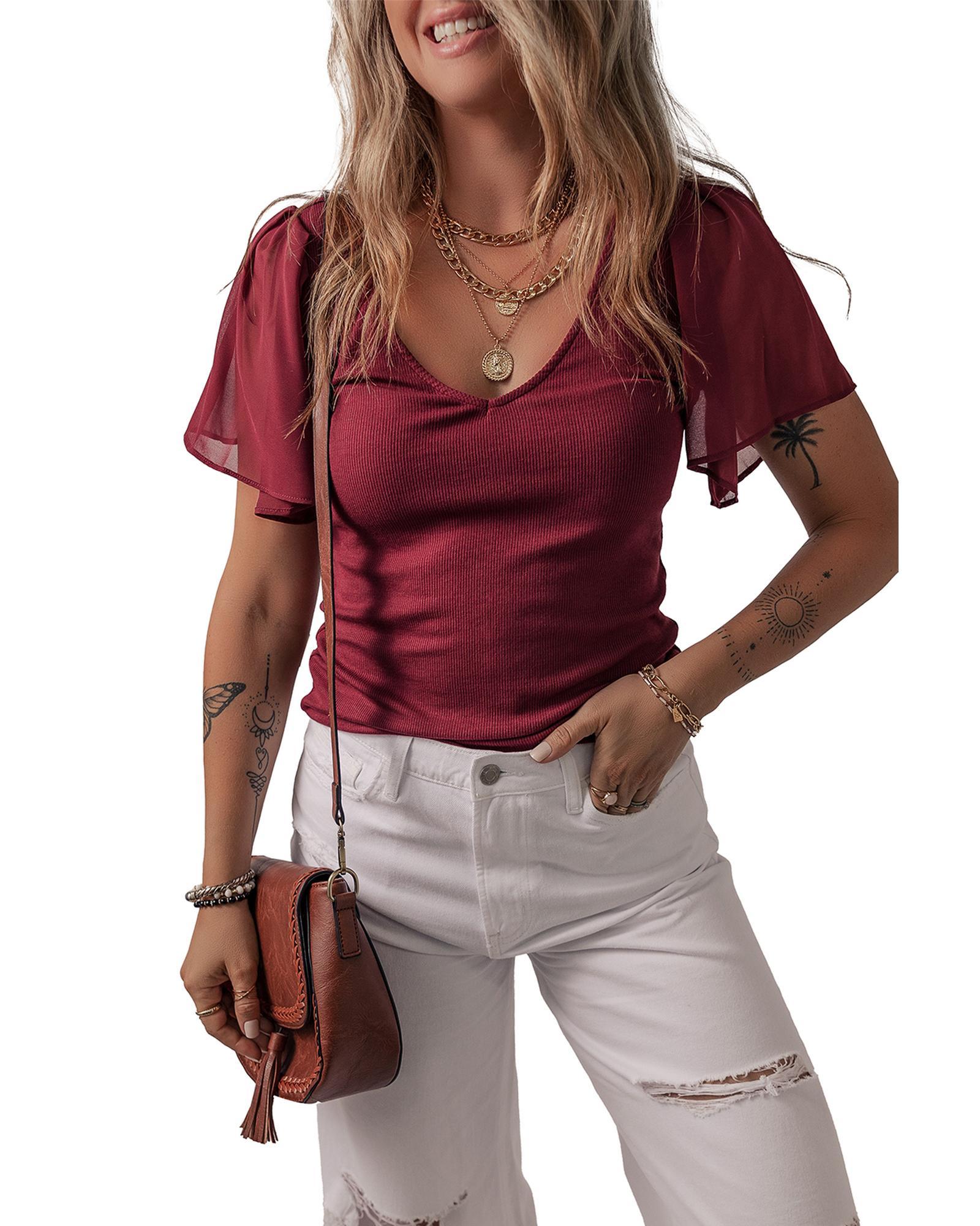 Red Dahlia Mesh Ruffled Sleeve Slim Fit V Neck Top – S