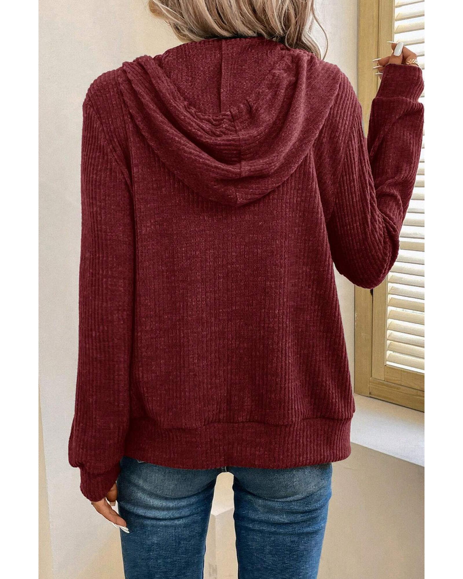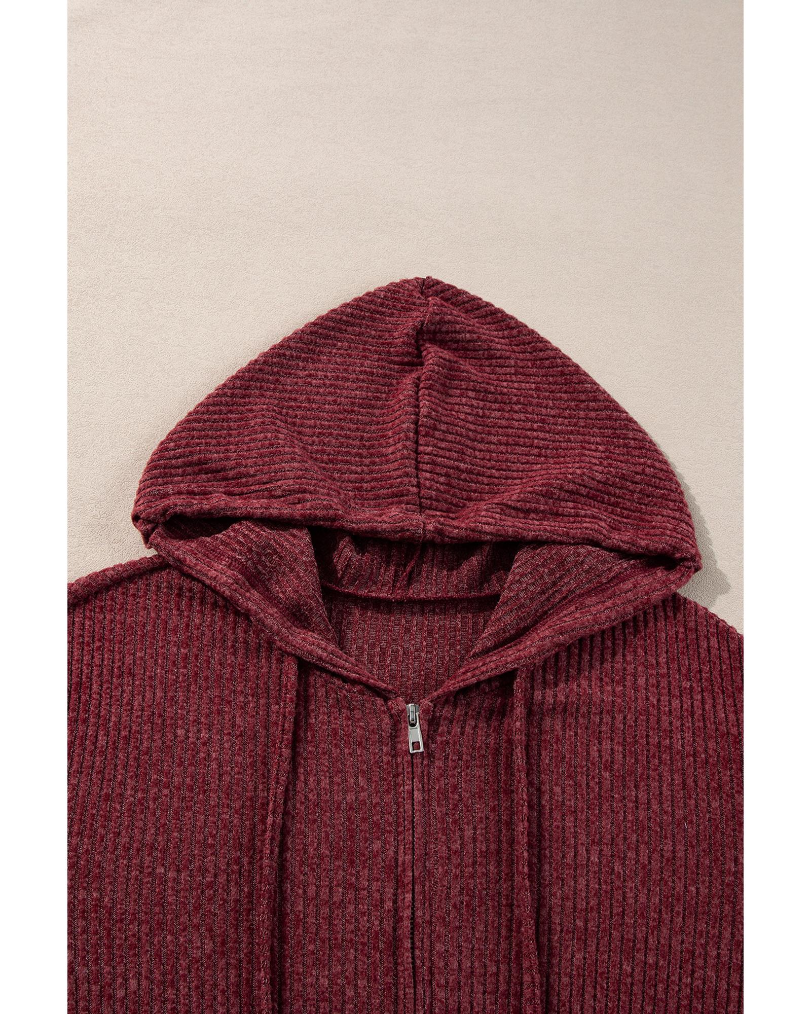 Red Dahlia Ribbed Zip Up Front Drawstring Hoodie – M