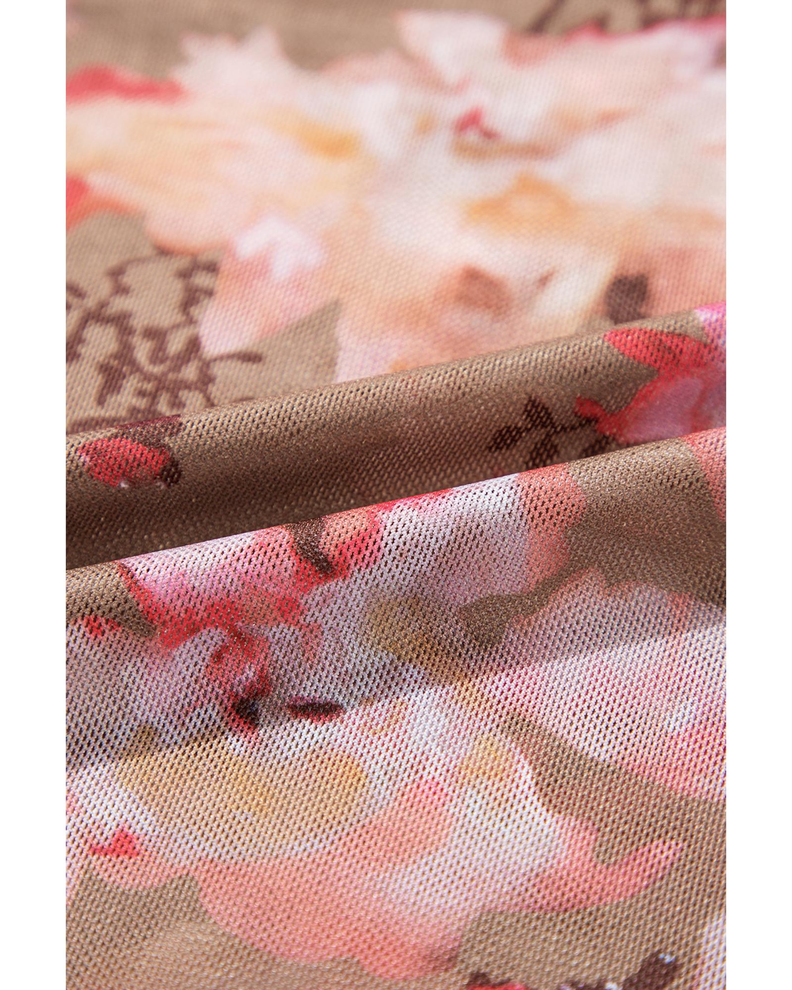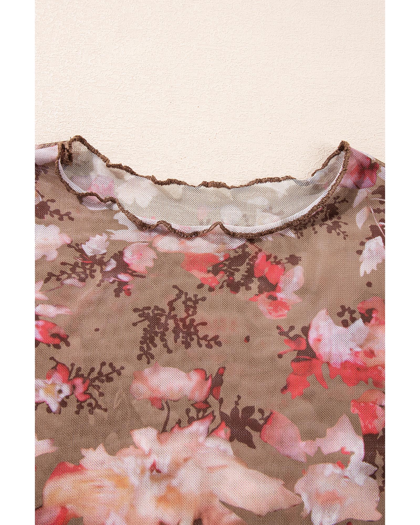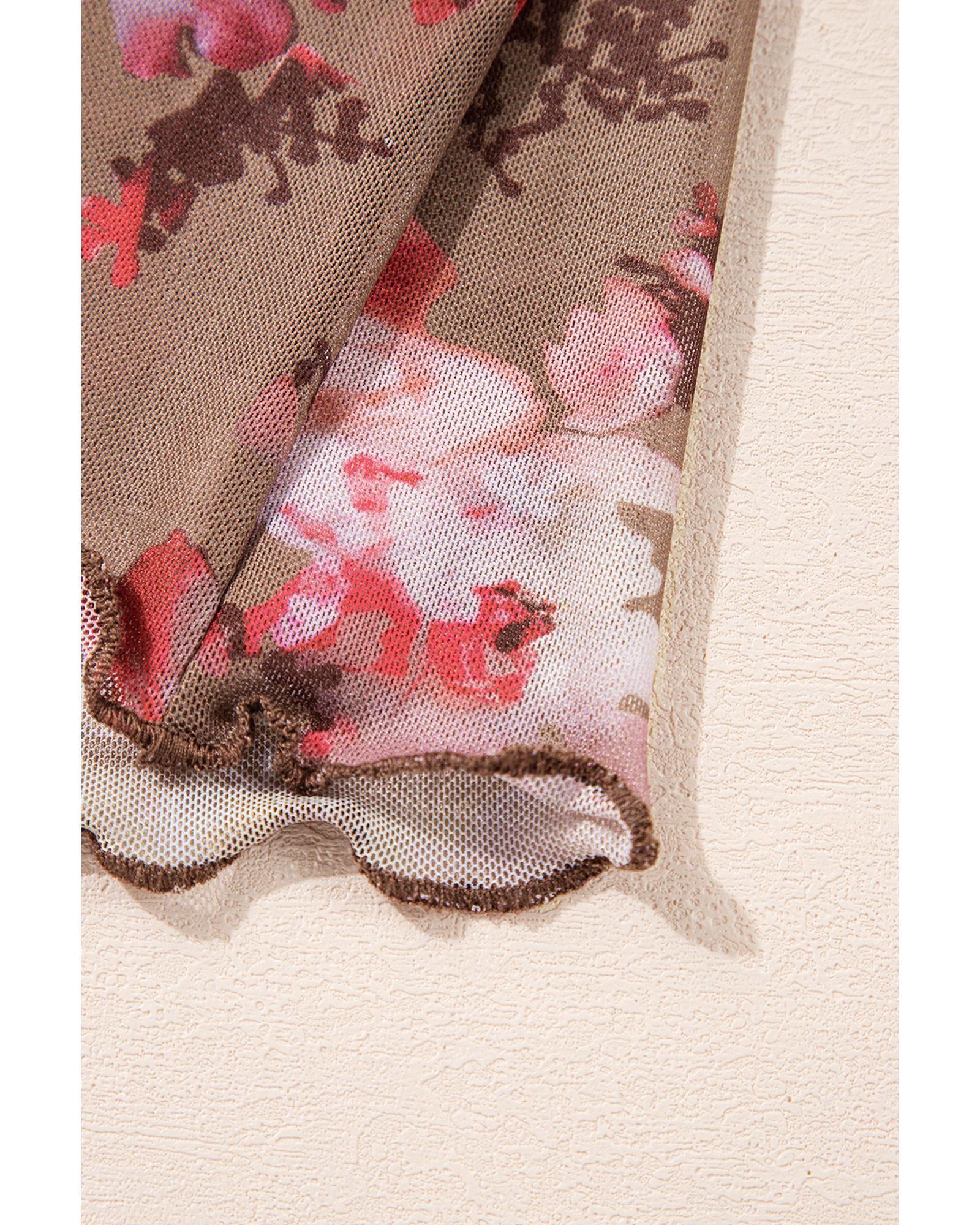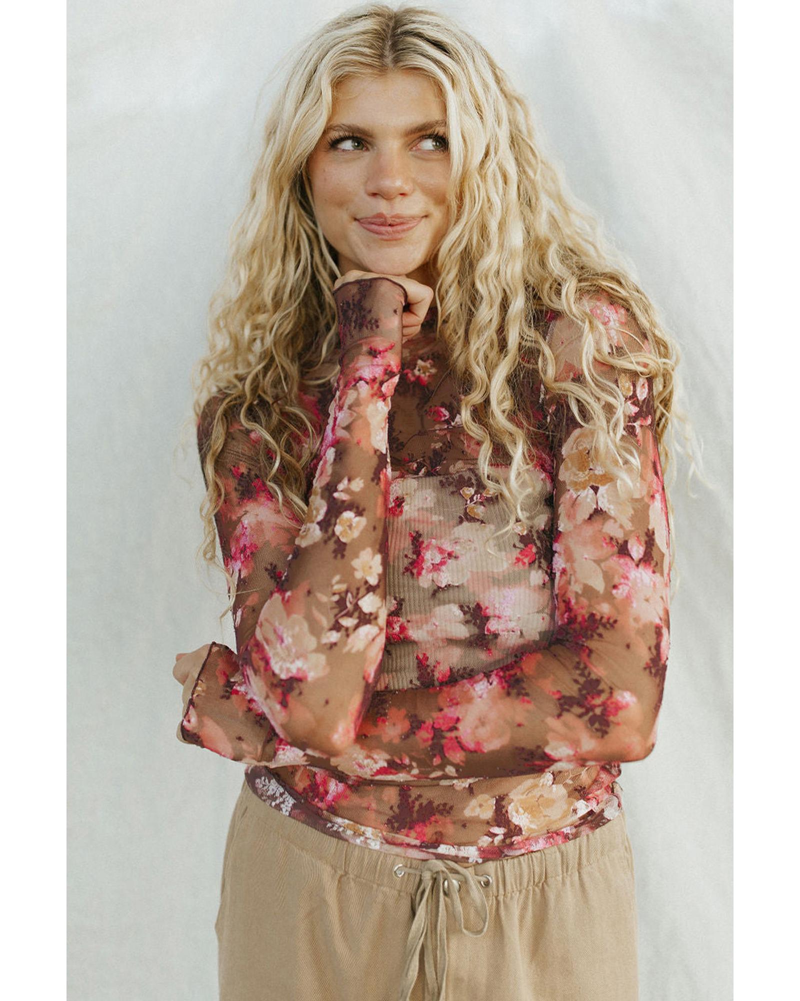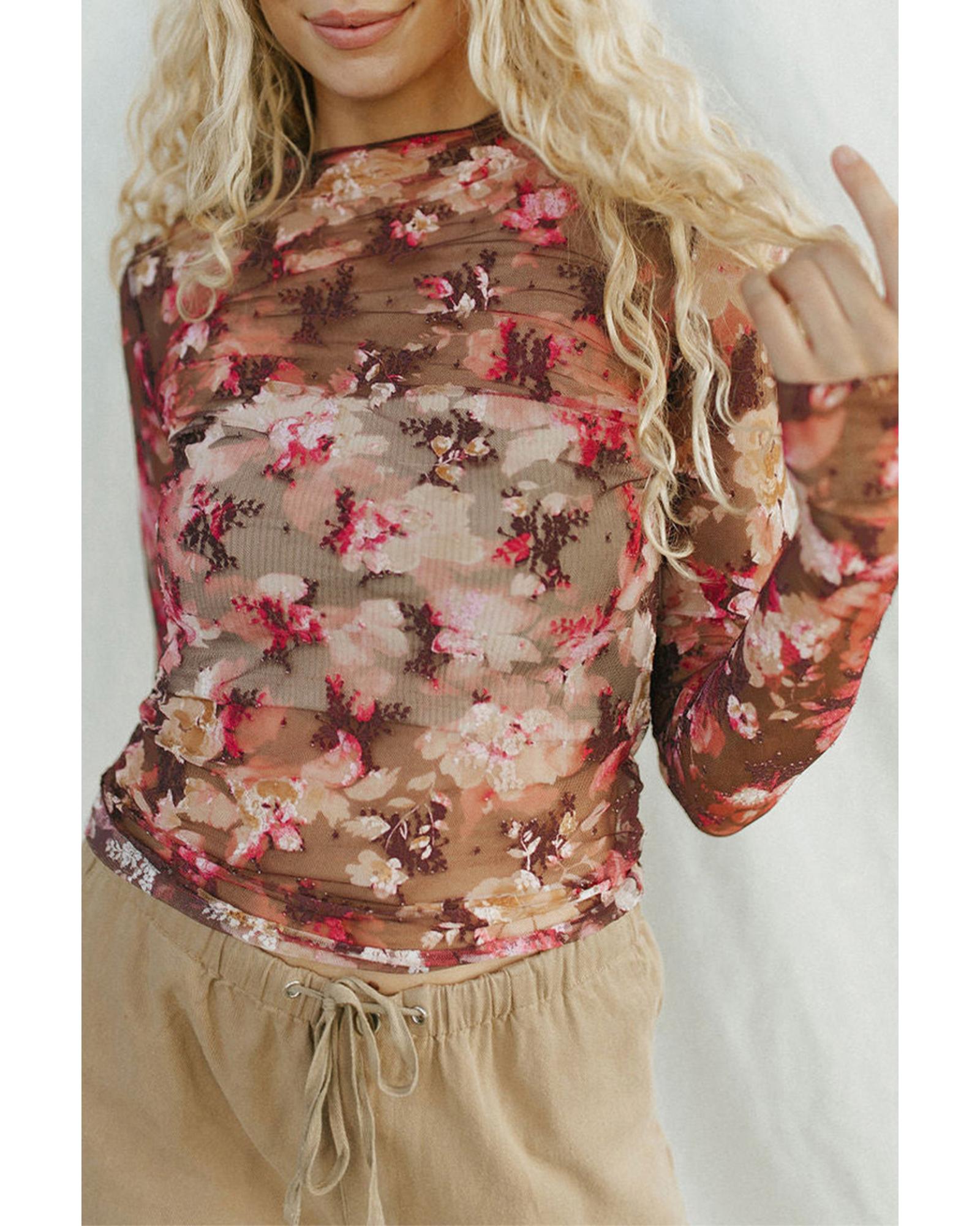 • Red floral print sheer mesh long sleeve top