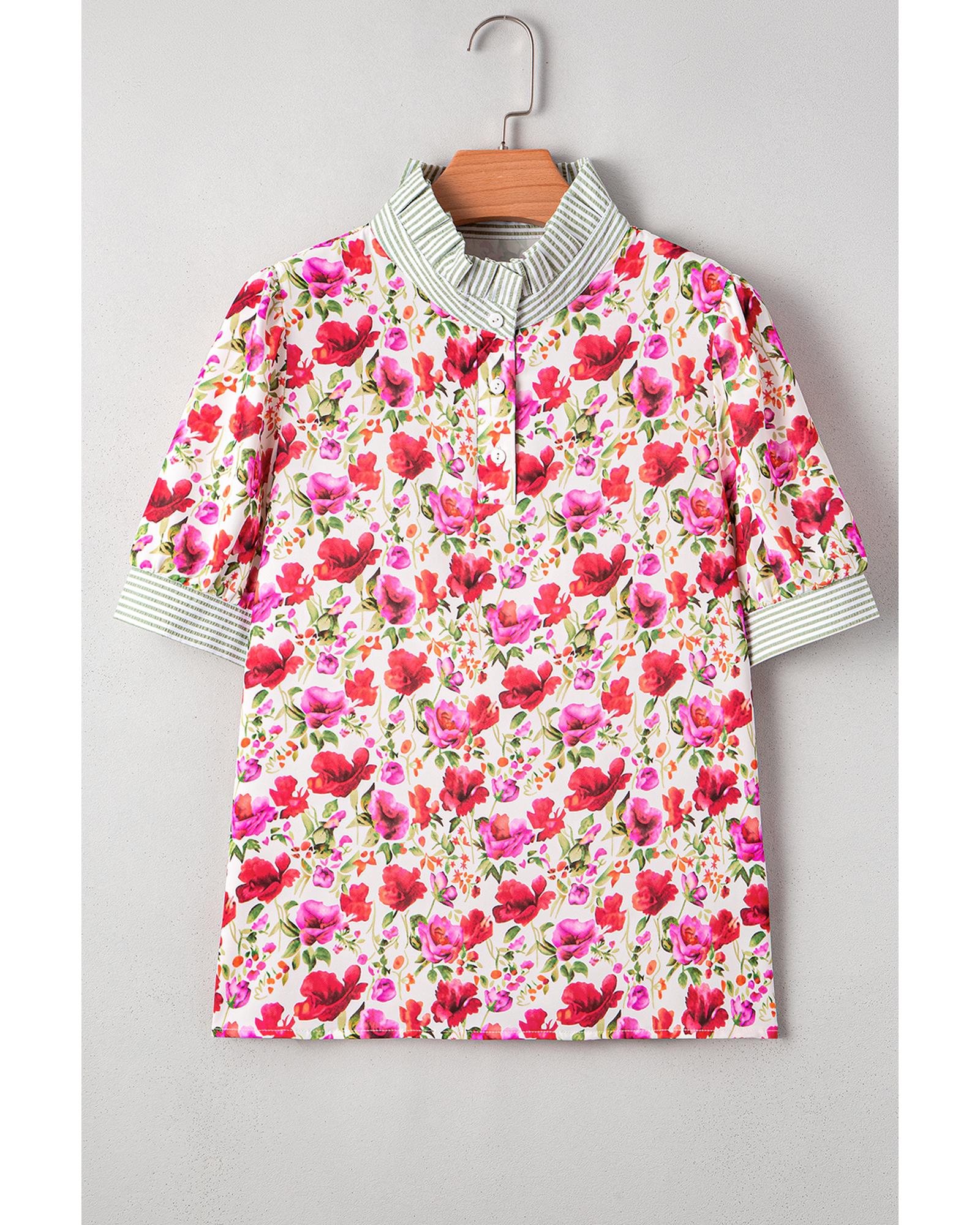 Red Floral Print Striped Patchwork Collared Short Sleeve Blouse – S