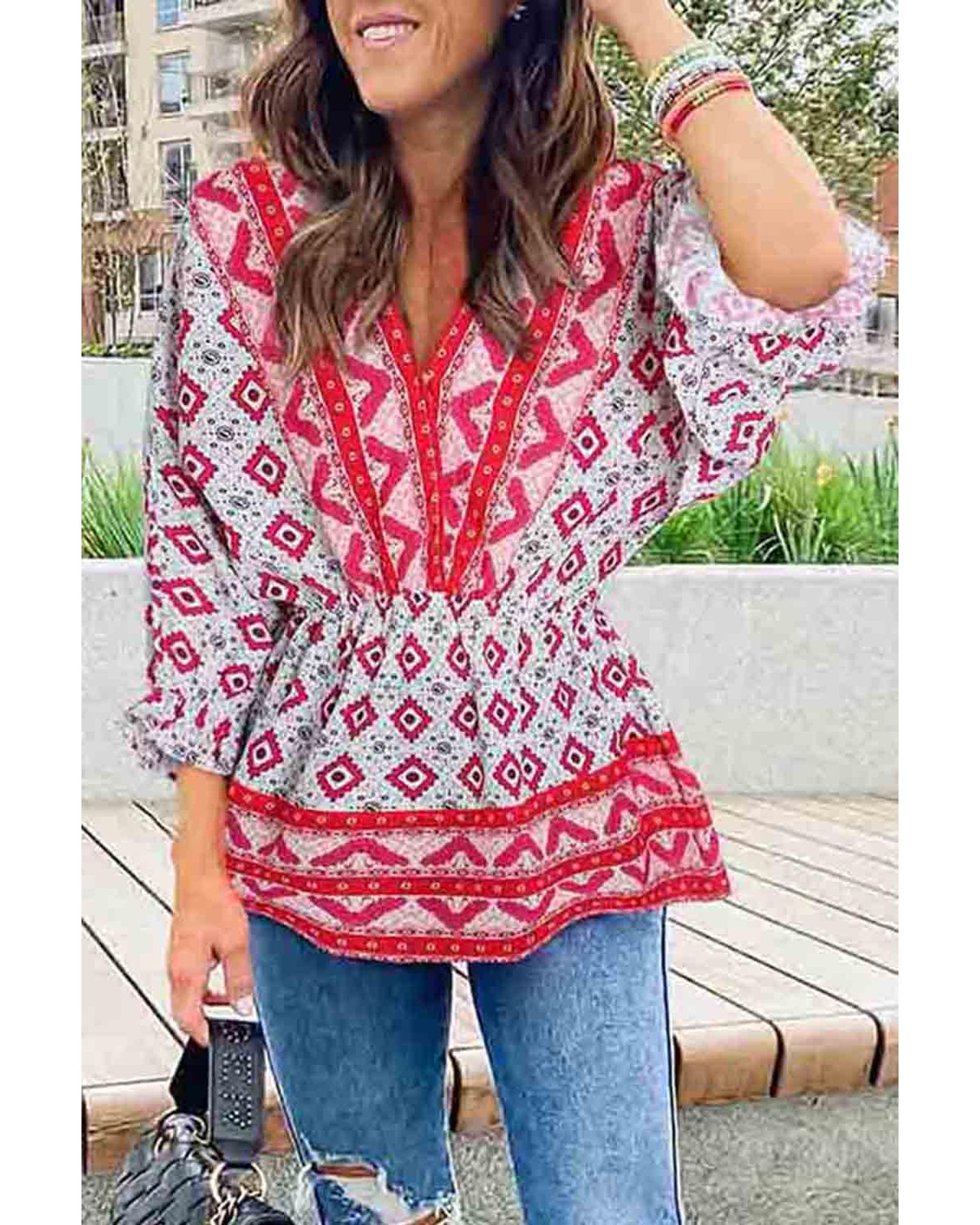 Red Geometric Print 3/4 Sleeve V-Neck Shirred Waist Flared Blouse – M