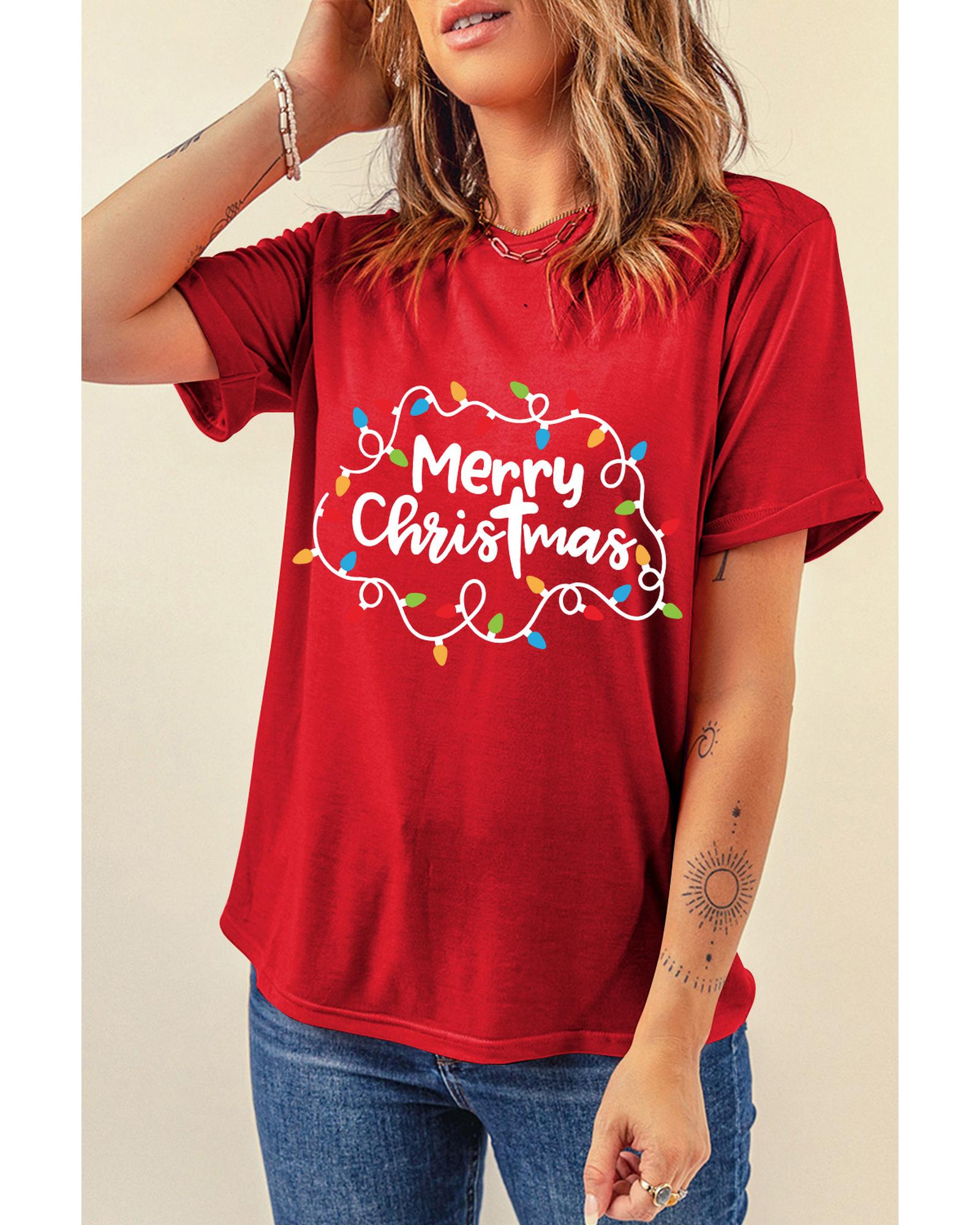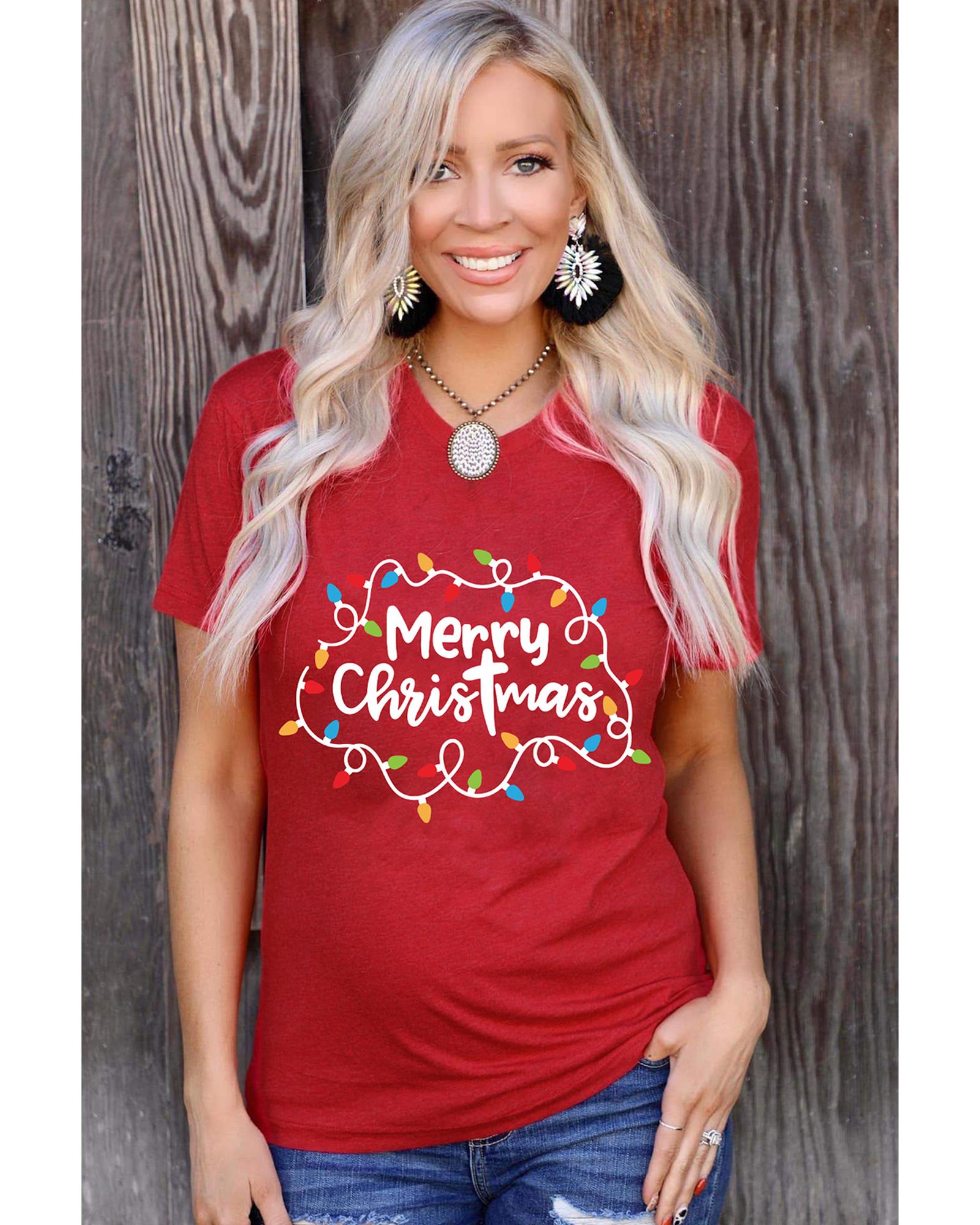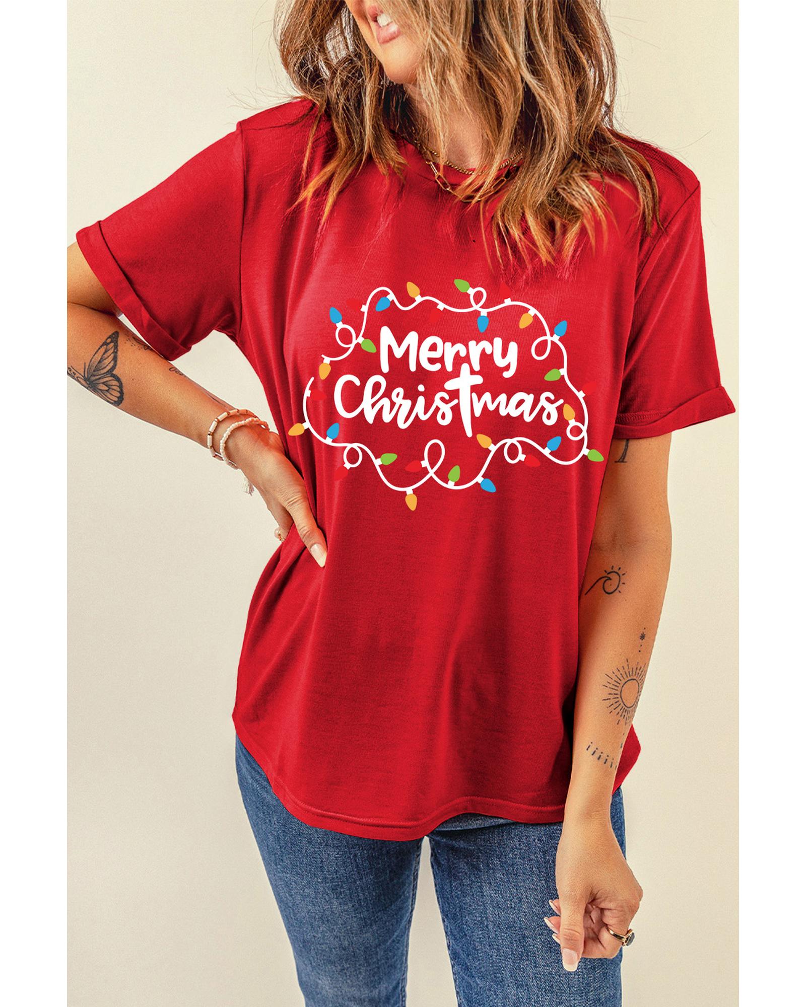 - Red Merry Christmas Lights Print Crew Neck T