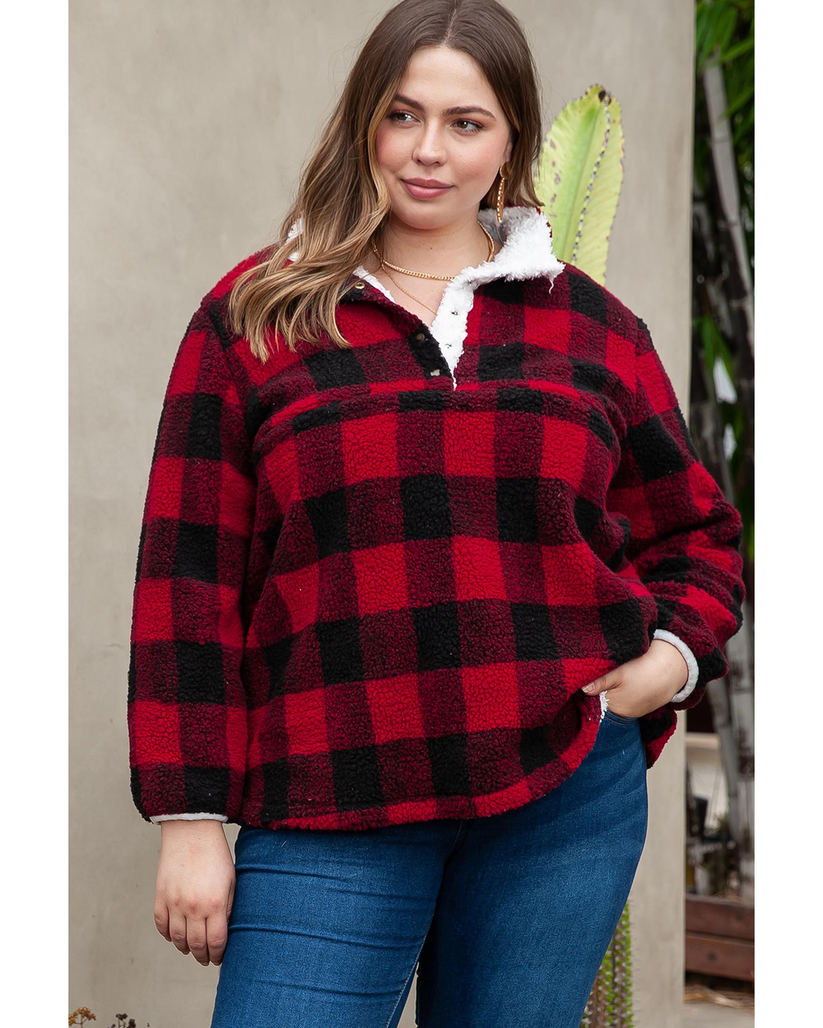 Red Plus Size Buffalo Plaid Sherpa Henley Sweatshirt – 1X