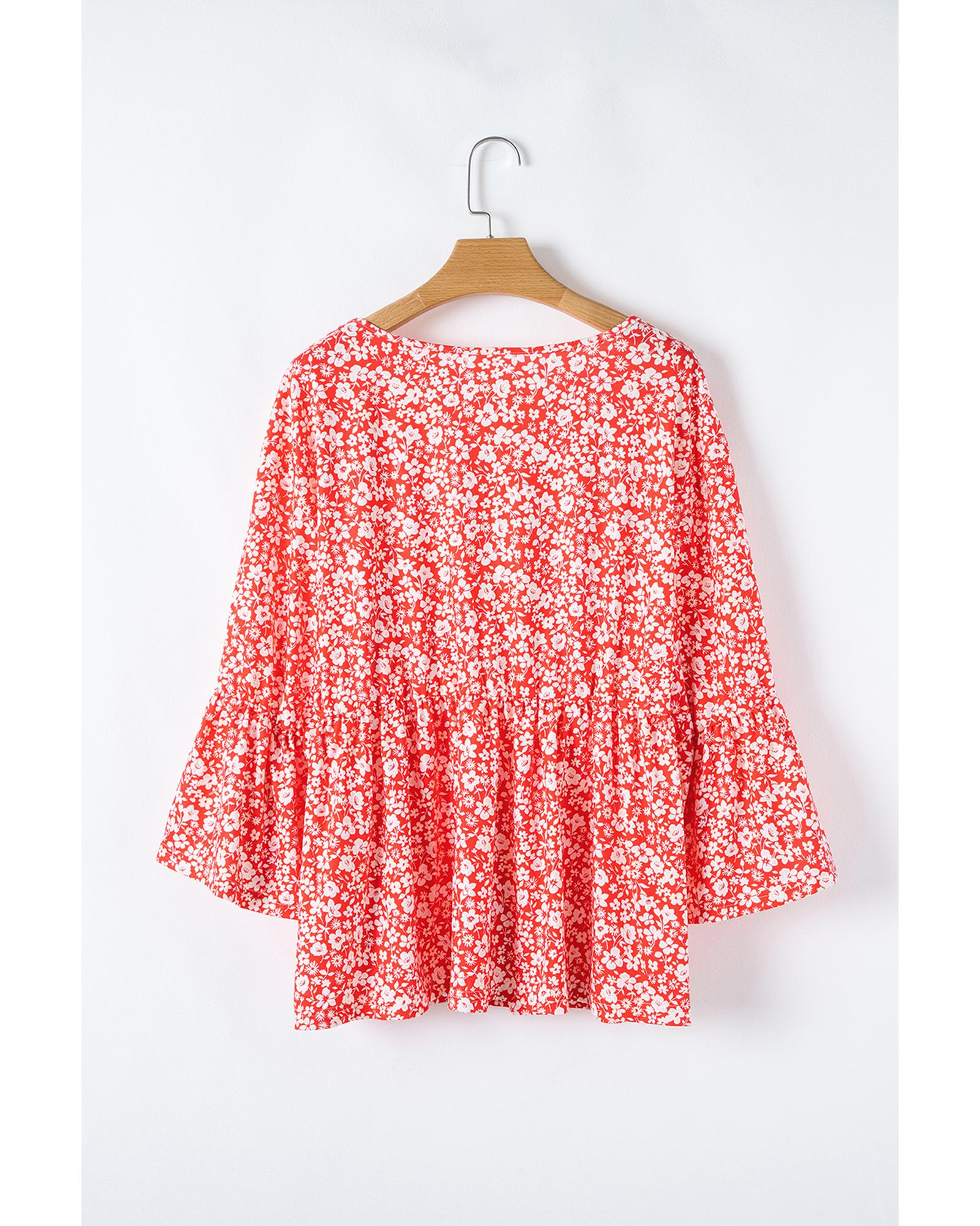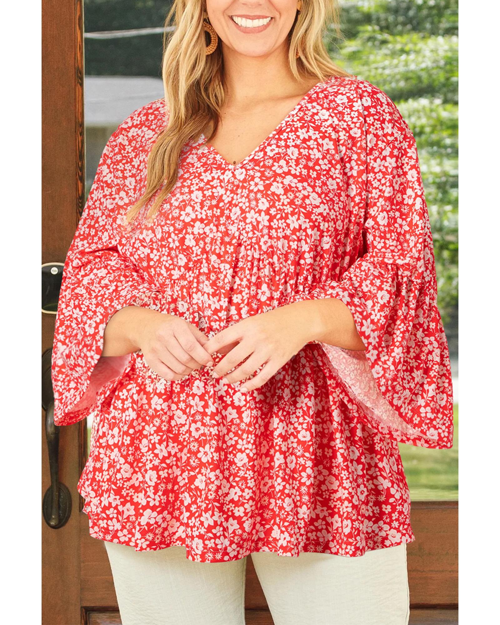 Red Plus Size Floral V Neck Flared Bracelet Sleeve Blouse – 2X