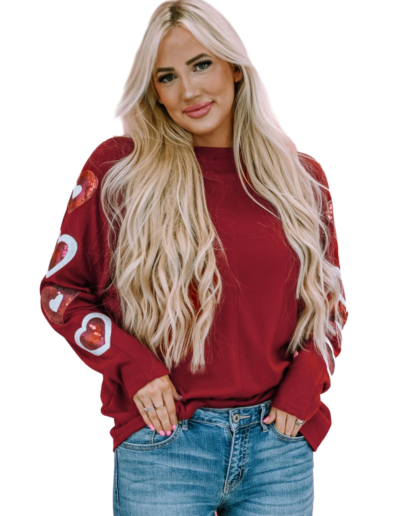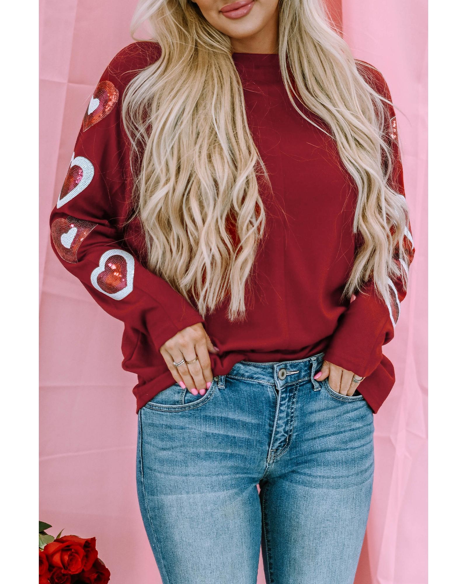 Red Sequined Heart Printed Sleeves Valentine Fashion Top – L