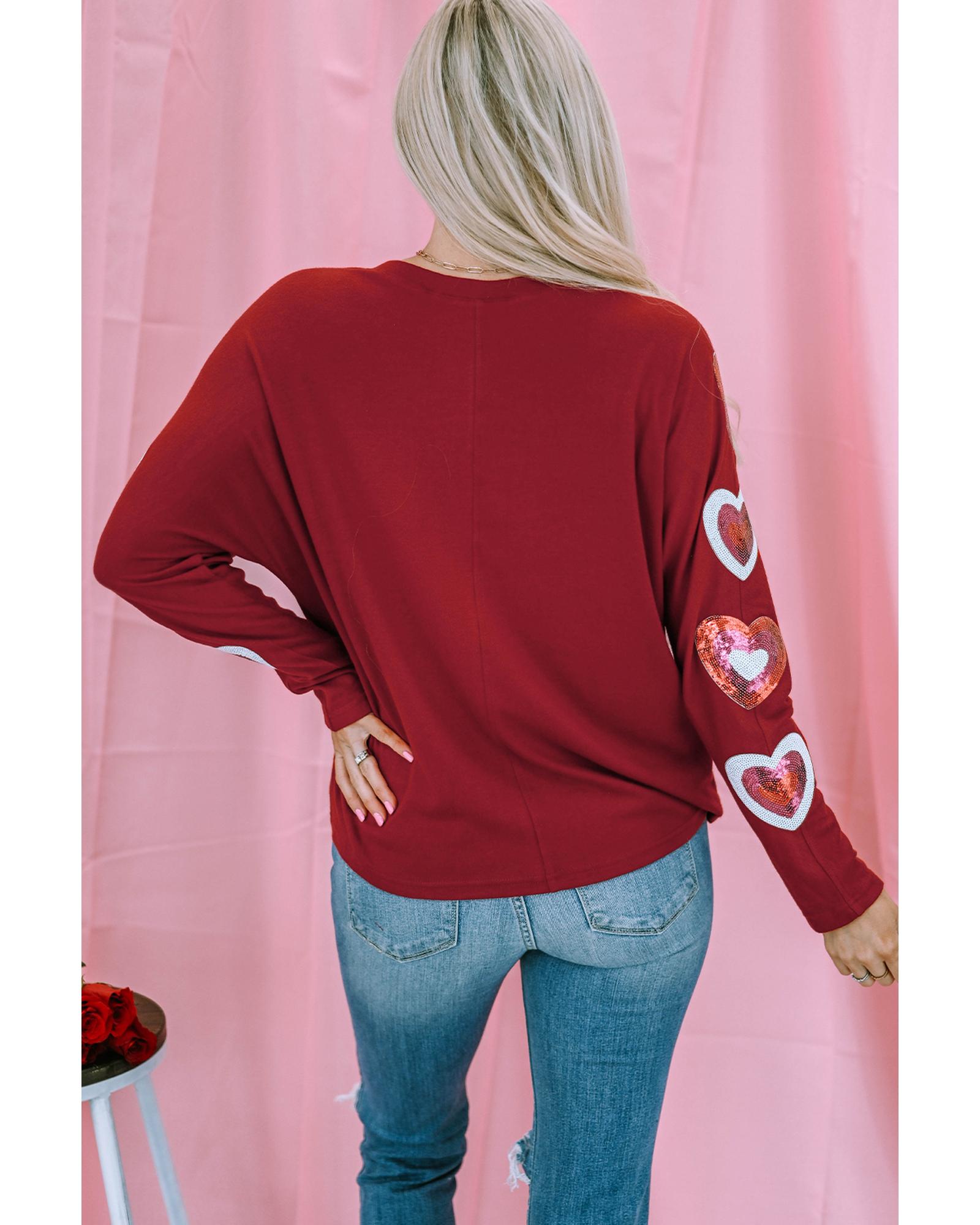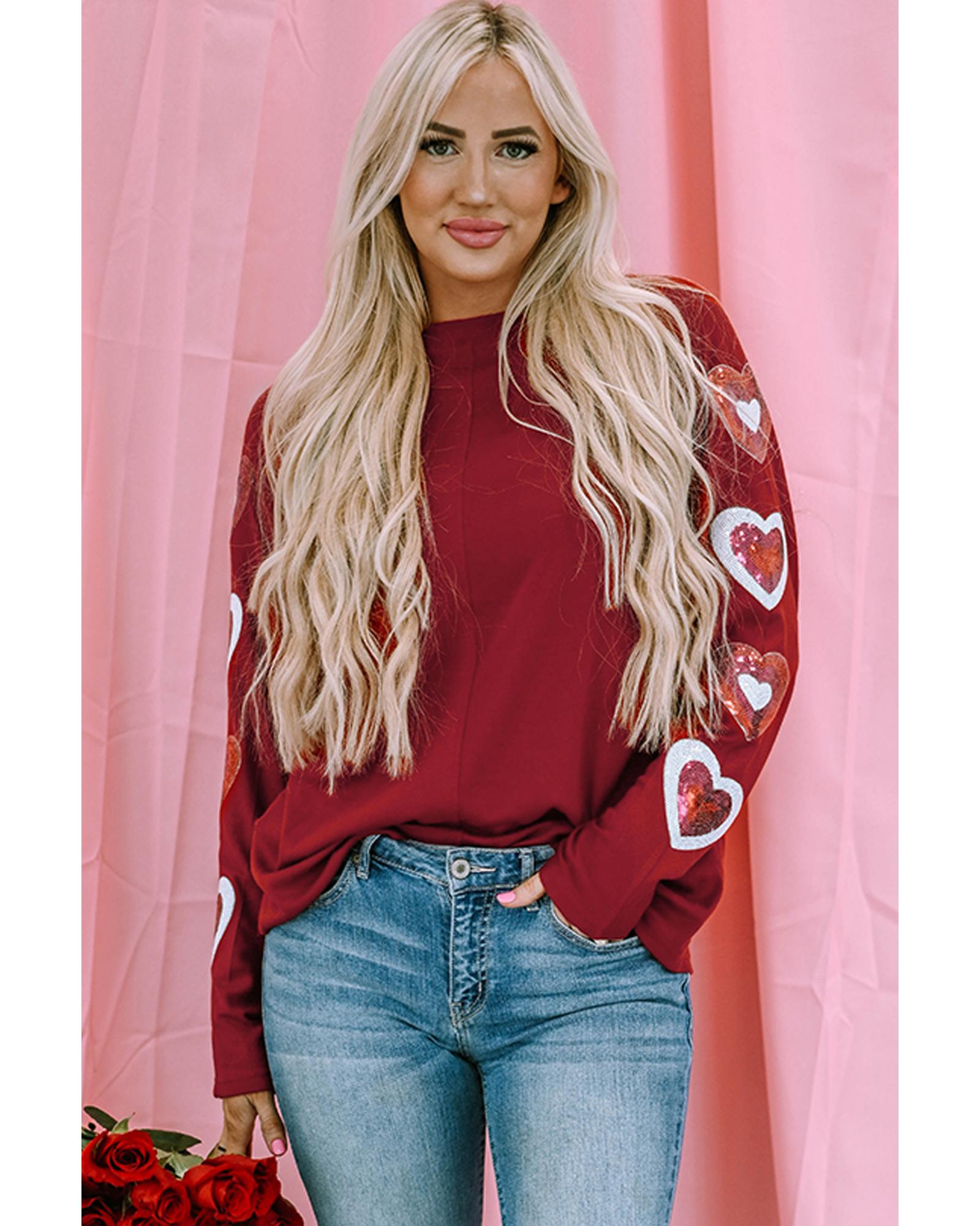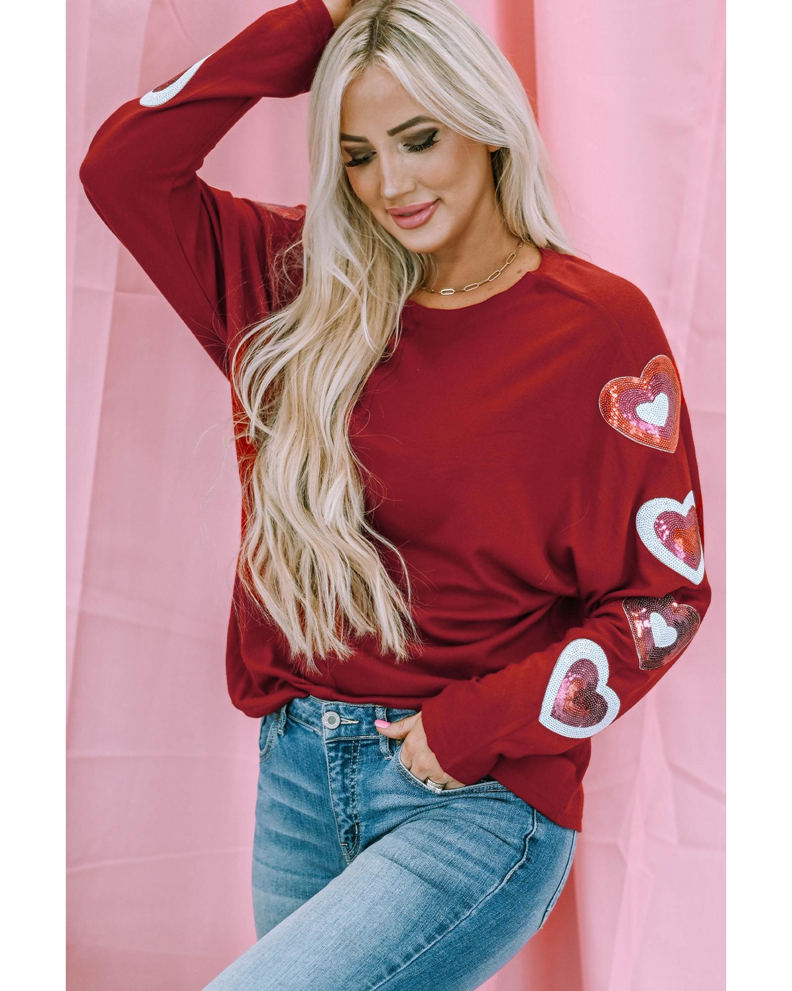 Red Sequined Heart Printed Sleeves Valentine Fashion Top – S