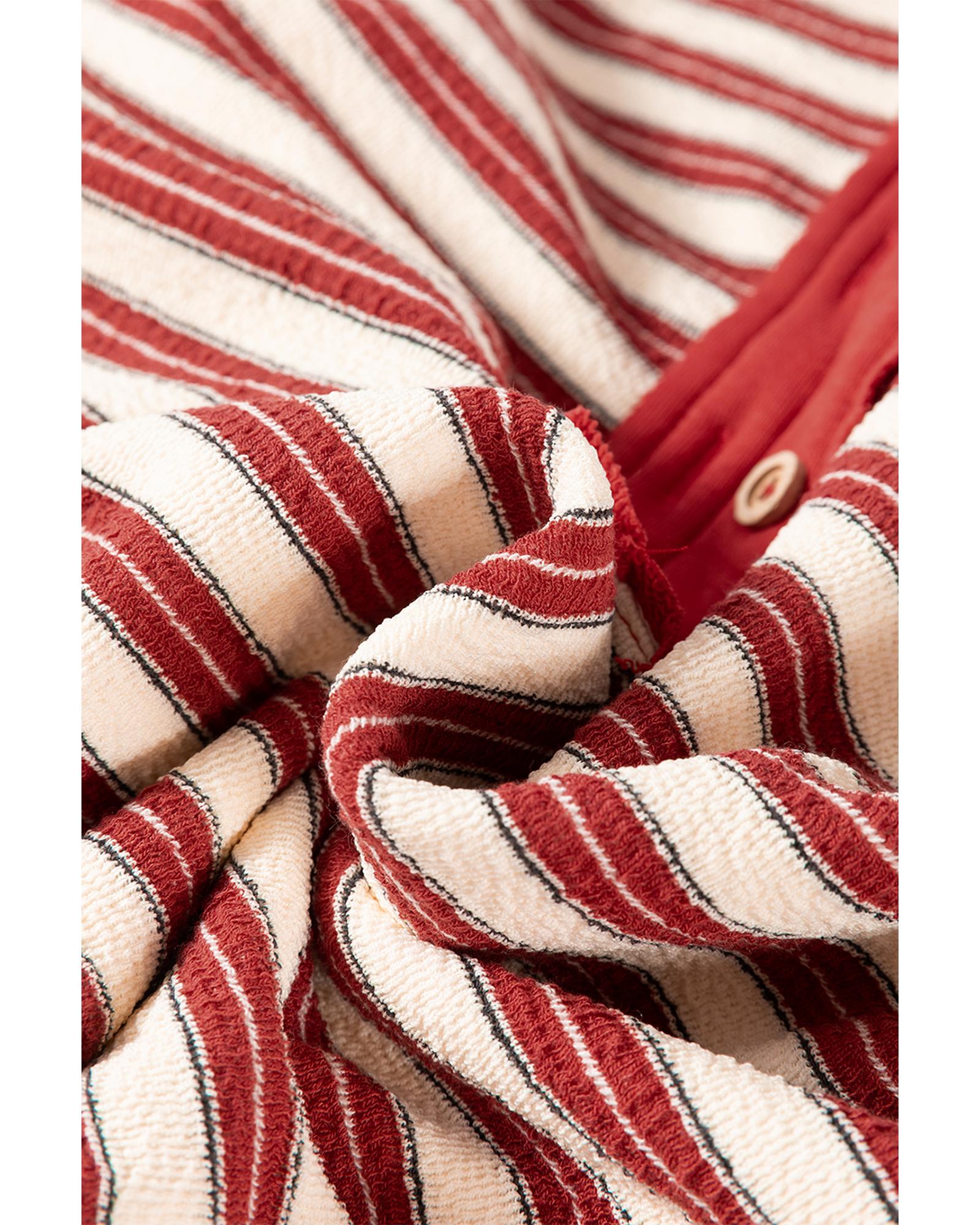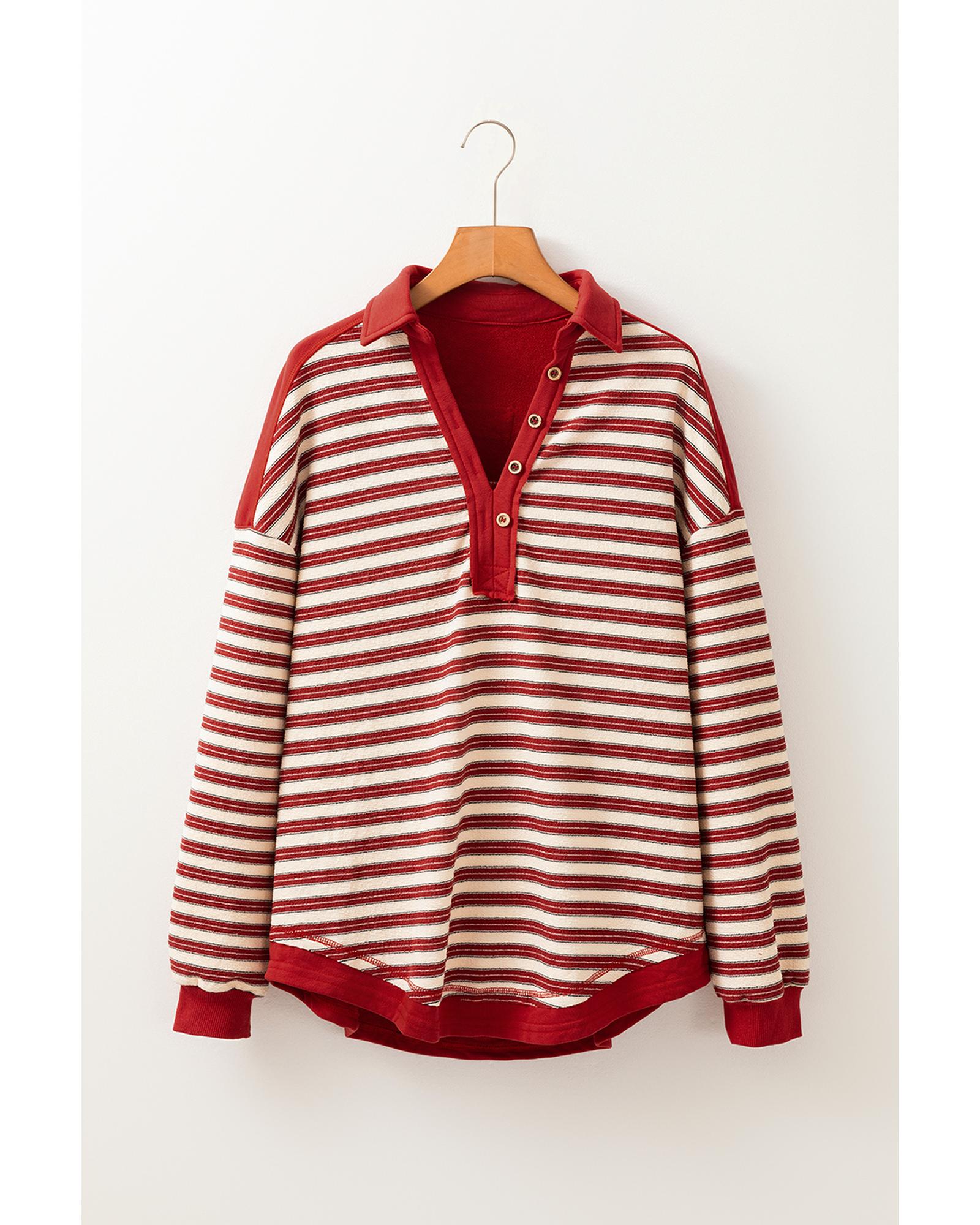 Red Stripe Buttoned V Neck Collared Drop Shoulder Top – XL