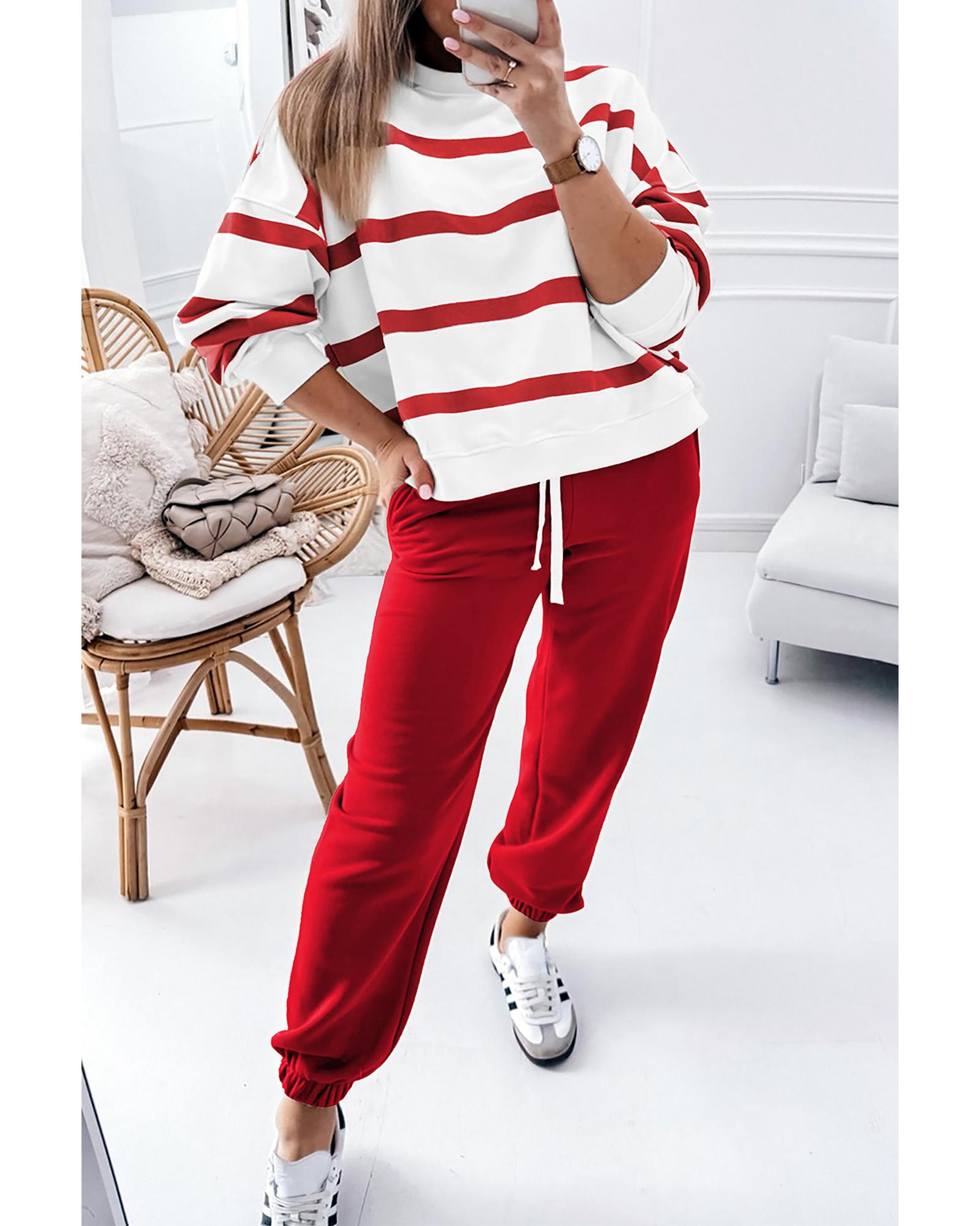 Red Stripe Drop Shoulder Pullover and Jogger Pants Set – M