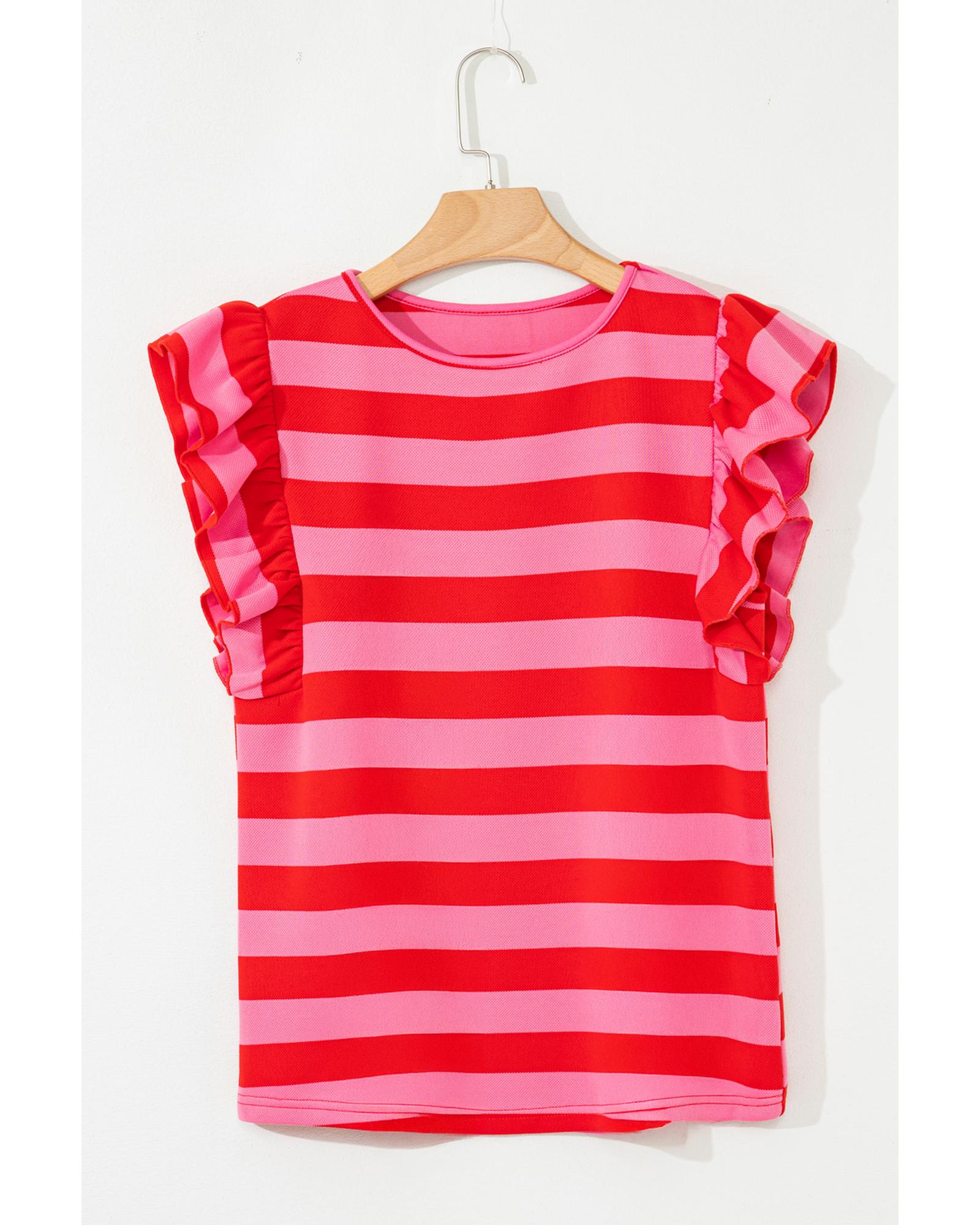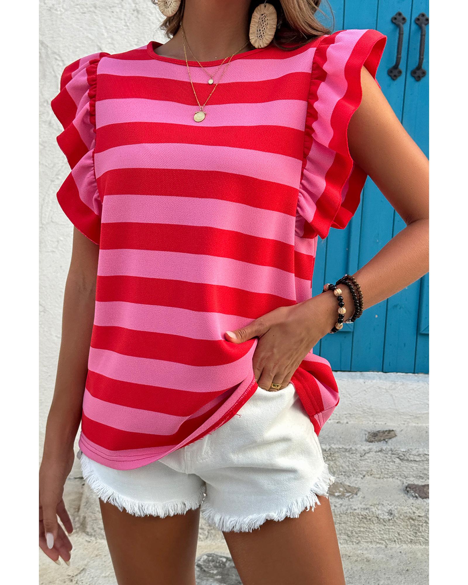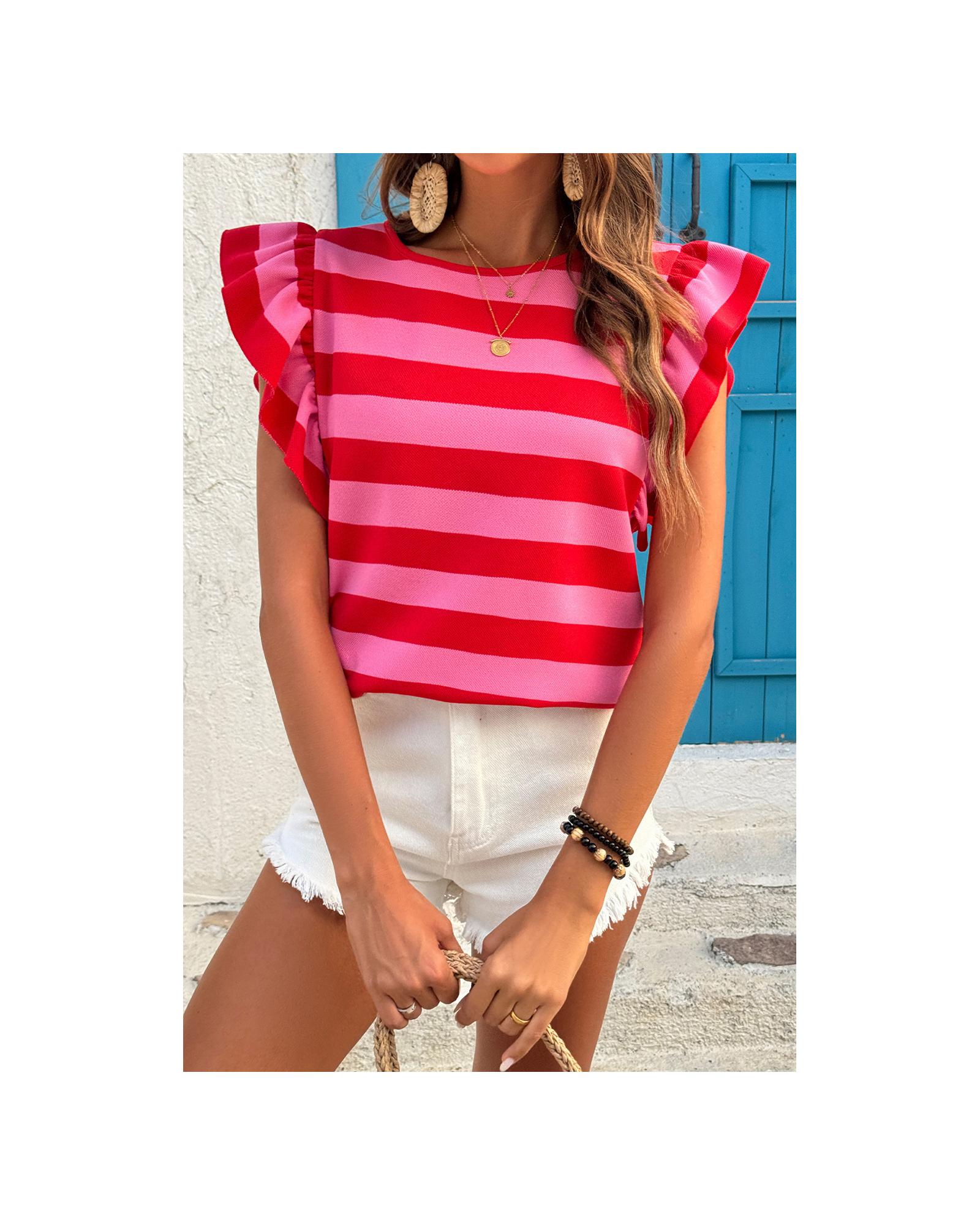 • Red Stripe Flutter Sleeve Round Neck T
