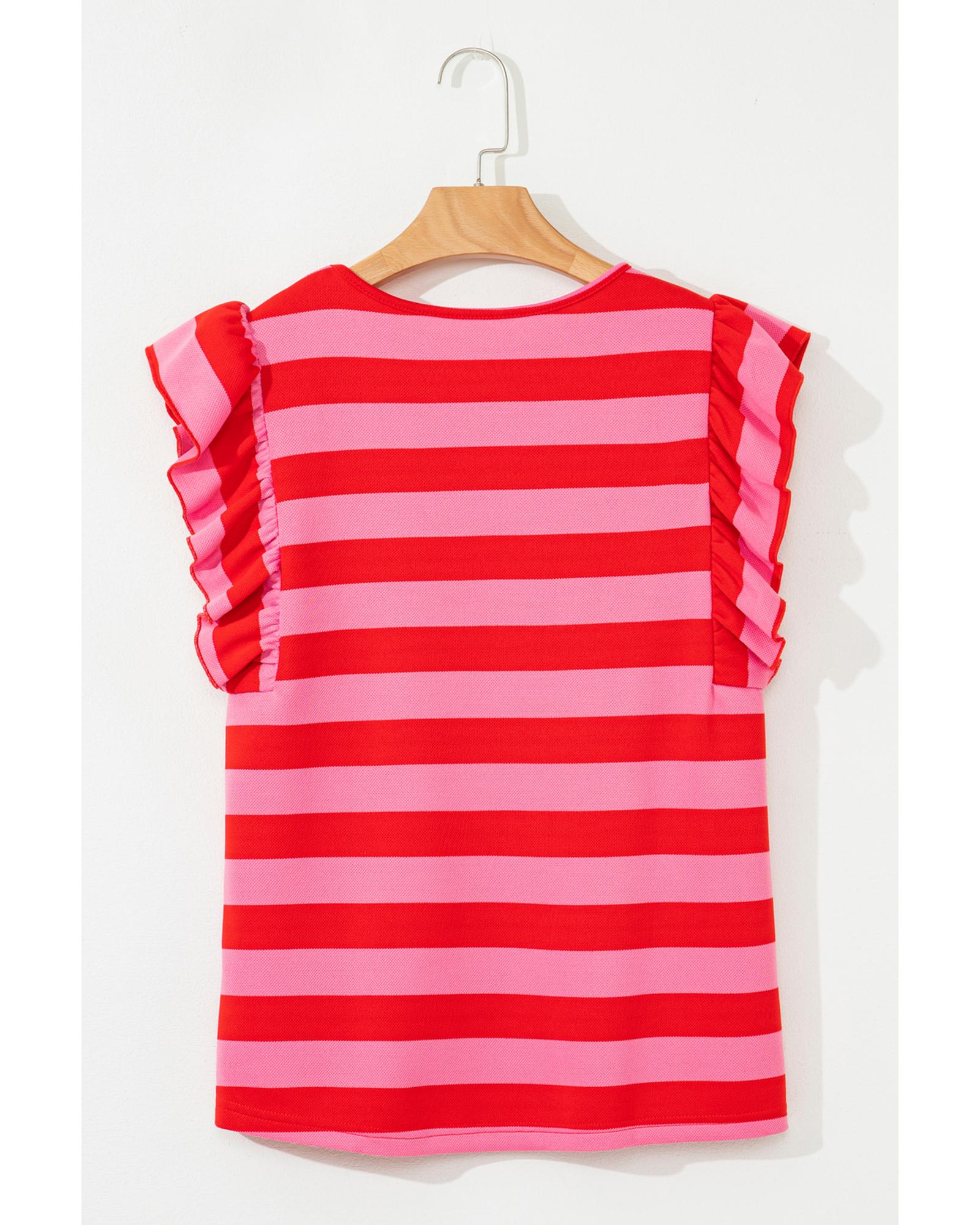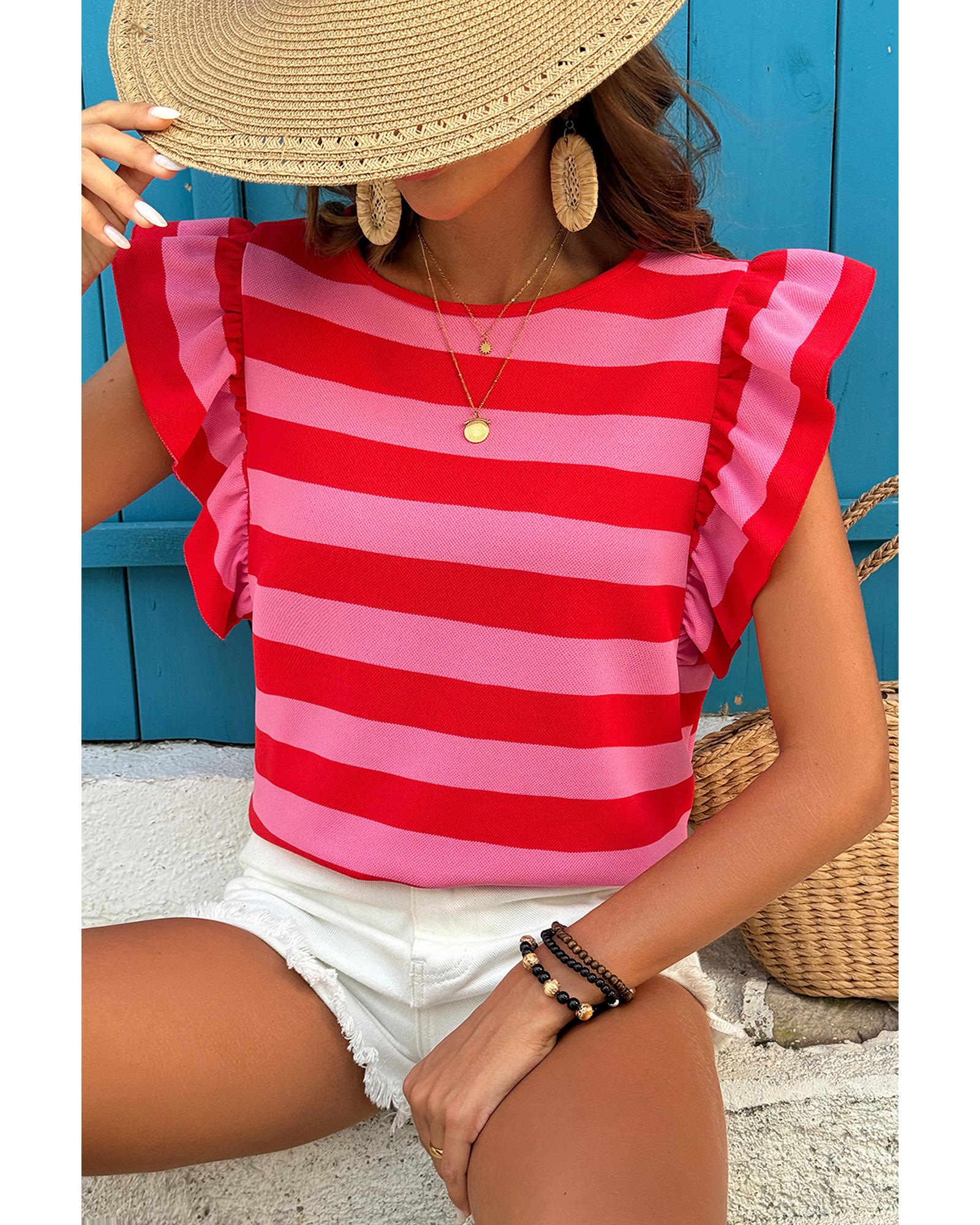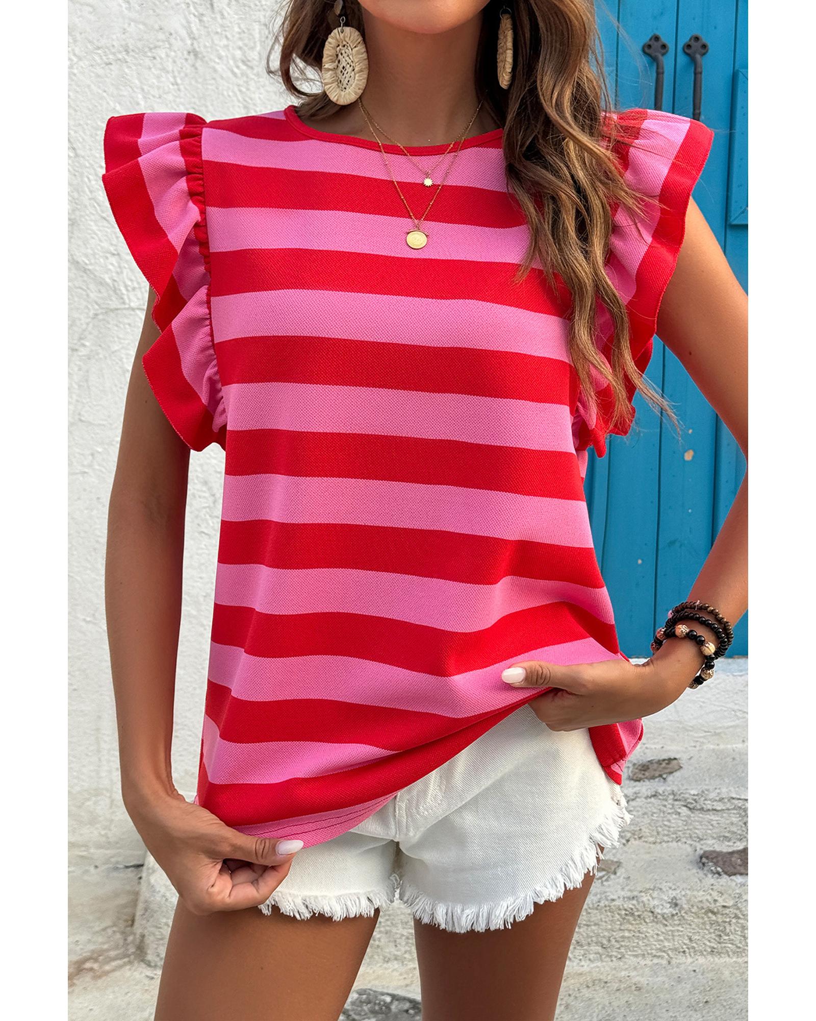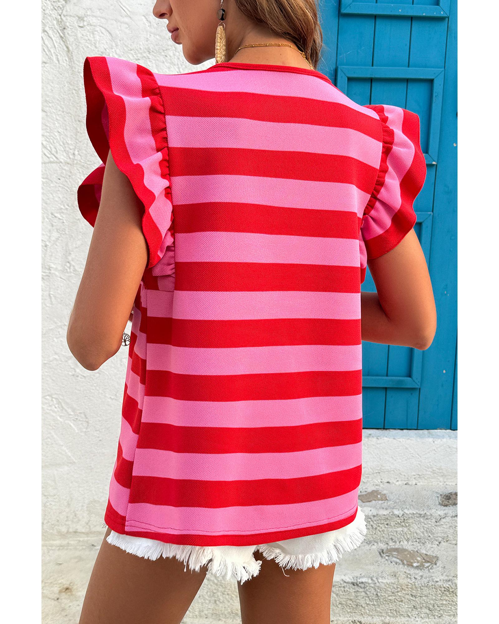 • Red Stripe Flutter Sleeve Round Neck T