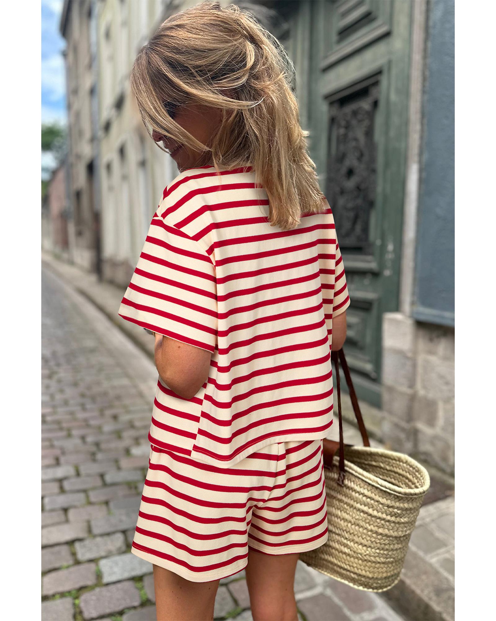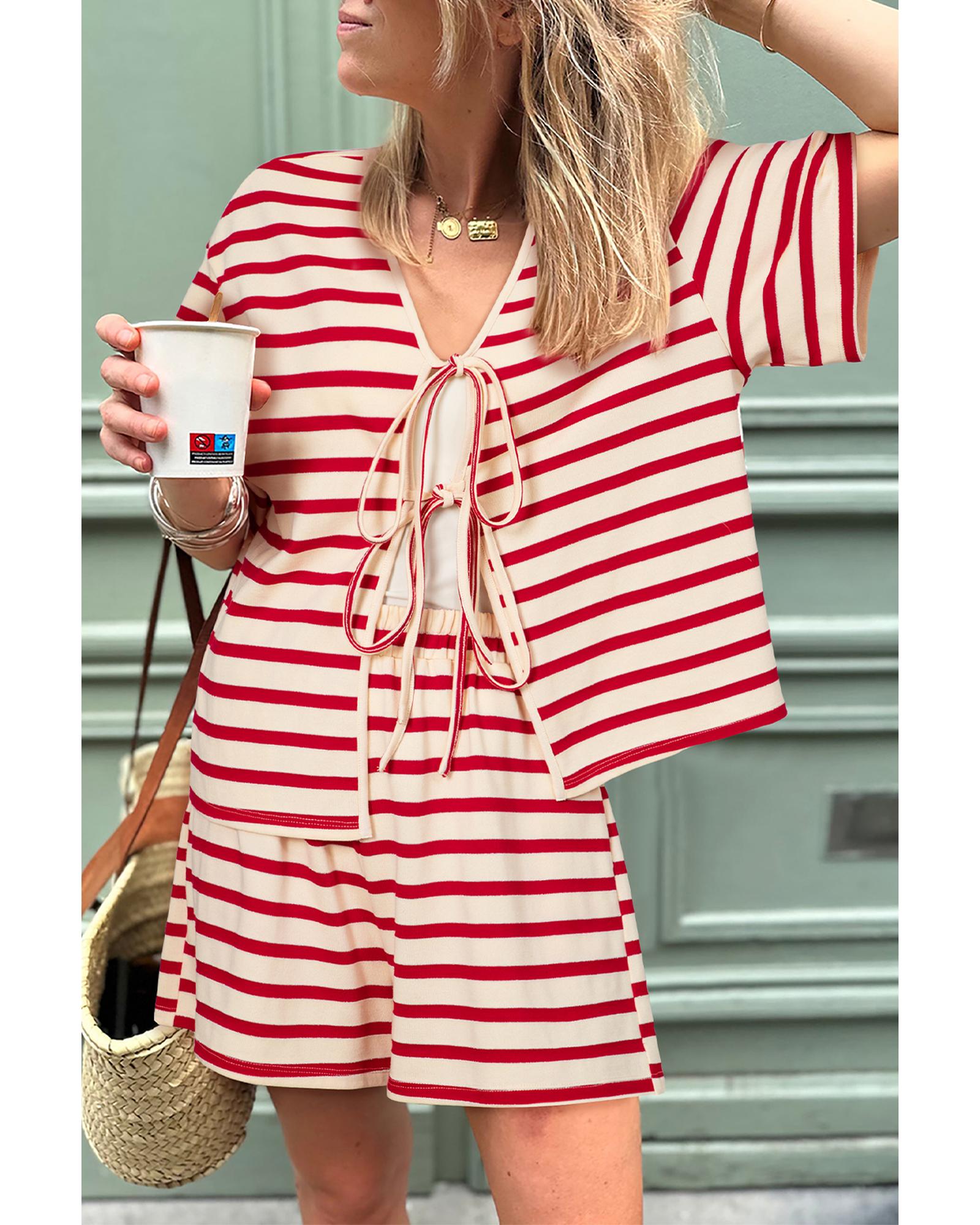 Red Stripe Lace-up Front Top and High Waist Shorts Set – XL