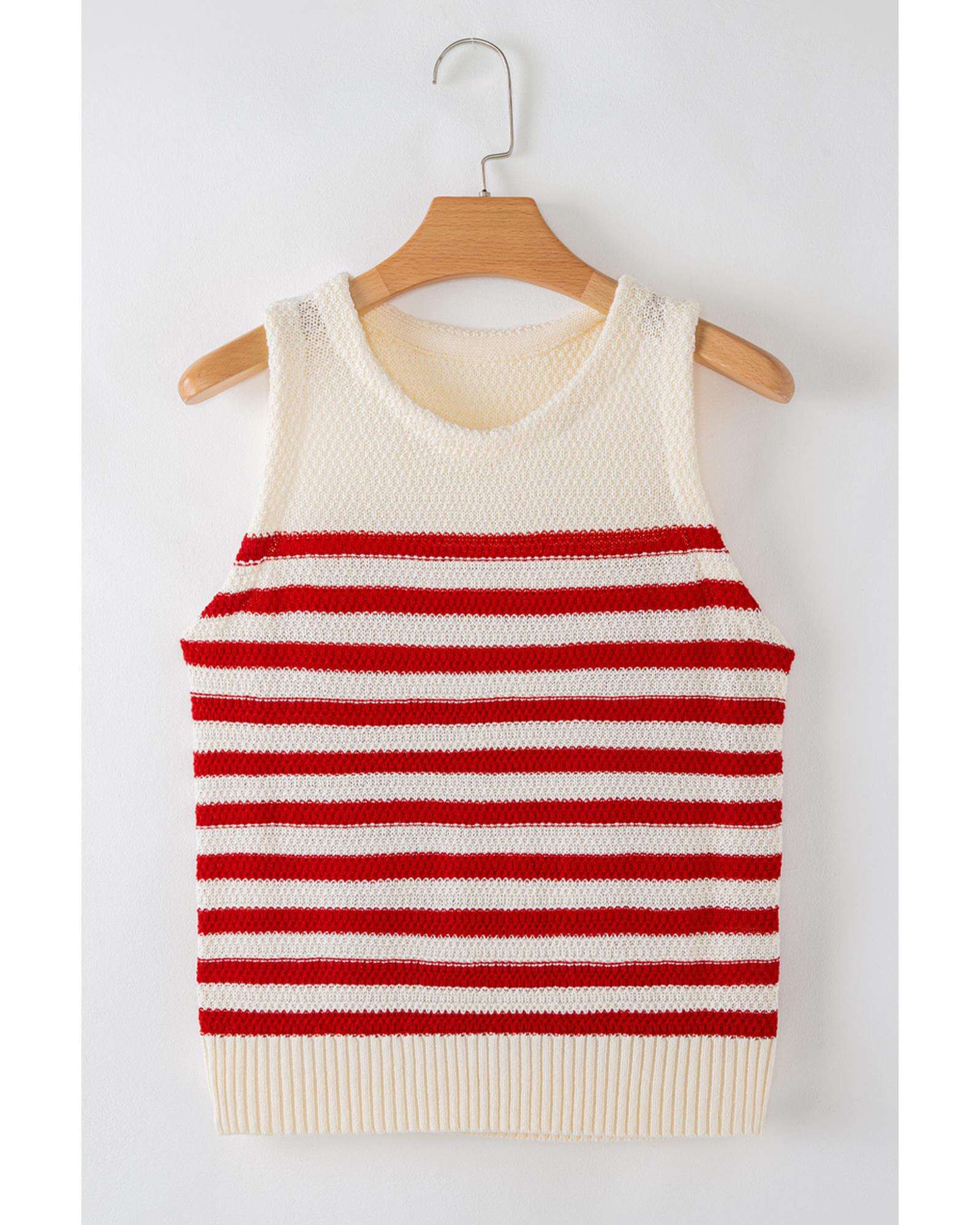 - Red Stripe Textured Knit Ribbed Hem Sweater Tank Top