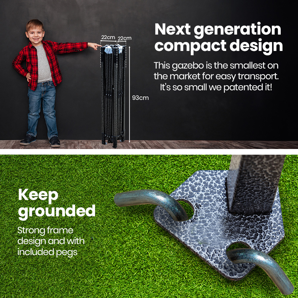 The Red Track 3x3m Gazebo (with 3 walls included) stands out with the smallest folded size on the market—just 93cm long! This ultra-compact 13kg design makes it incredibly easy for one person to carry, transport, and store, offering unmatched convenience compared to bulkier alternatives. Whether you’re short on space or always on the move, this gazebo’s design ensures portability without compromise.