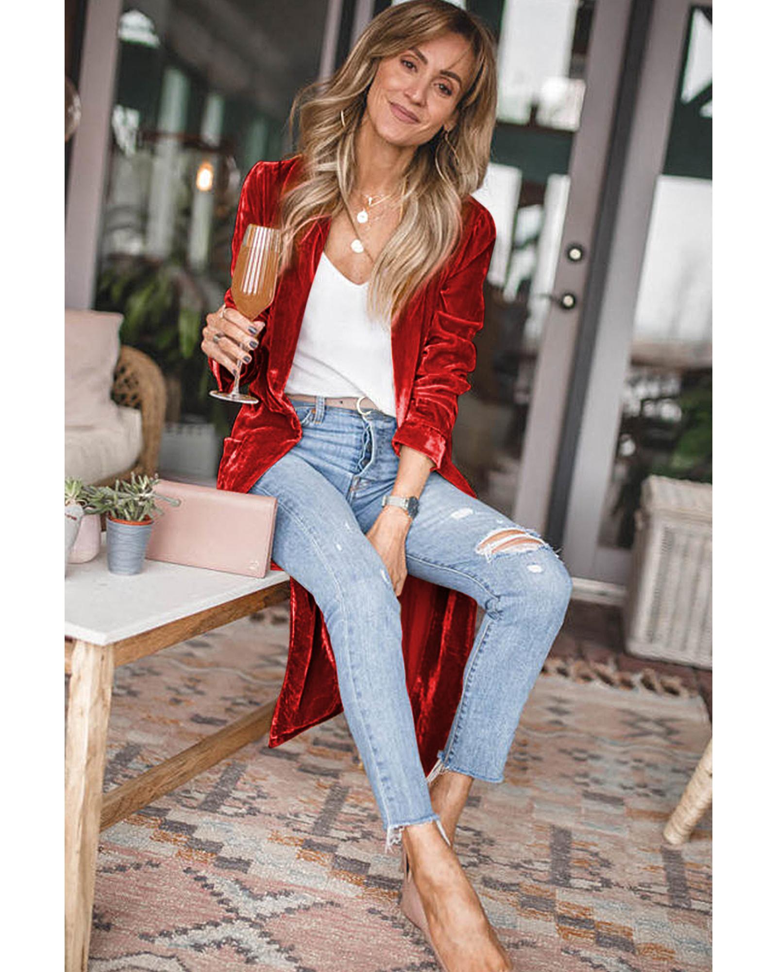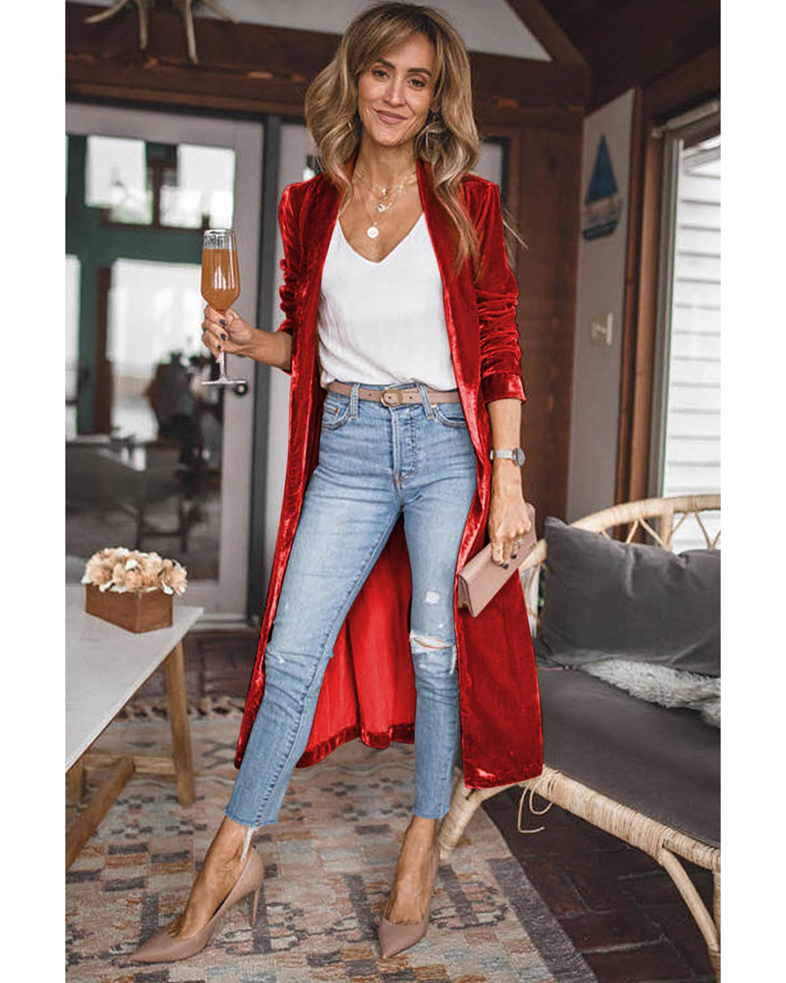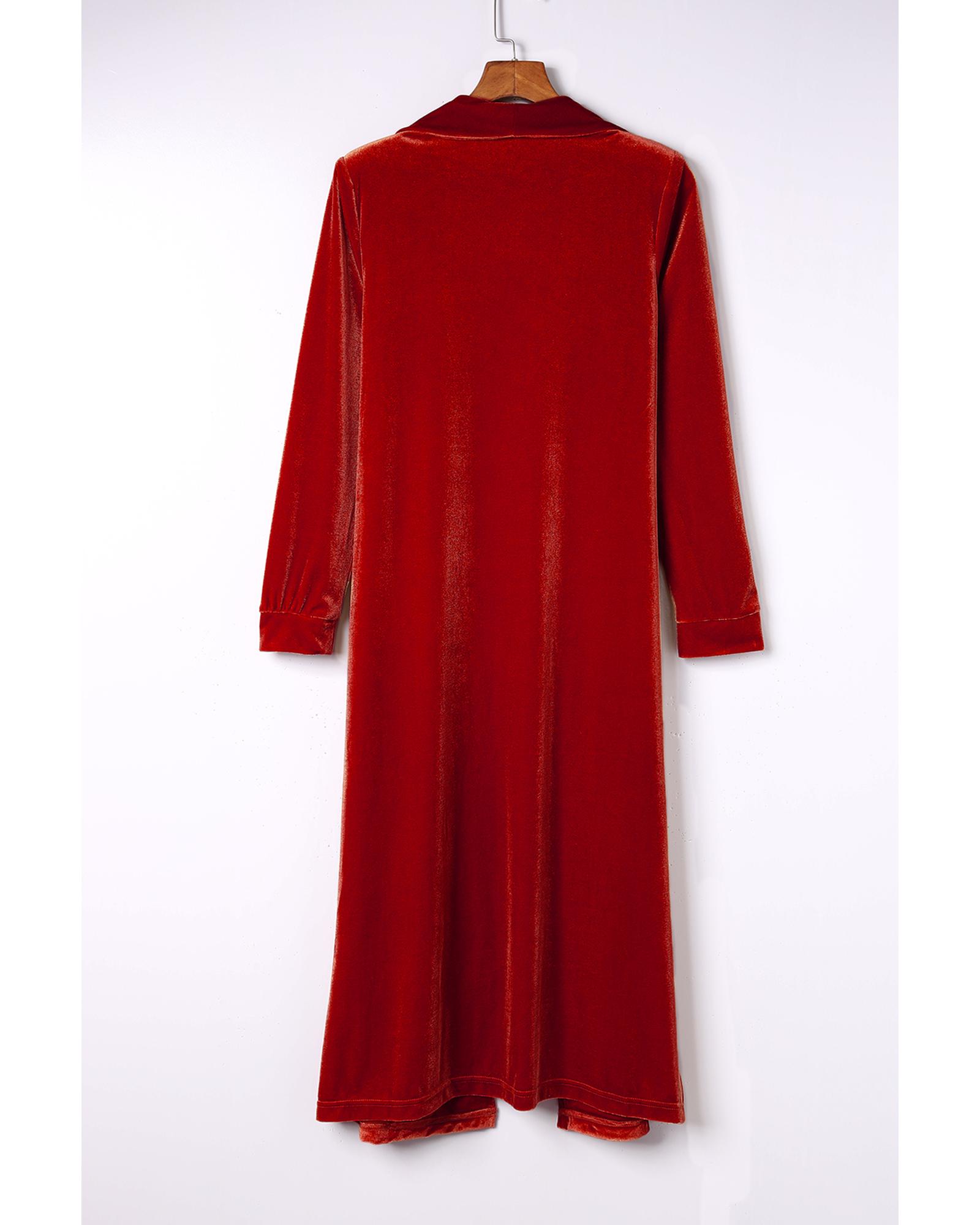Red Velvet Open Front Pocketed Long Duster – L
