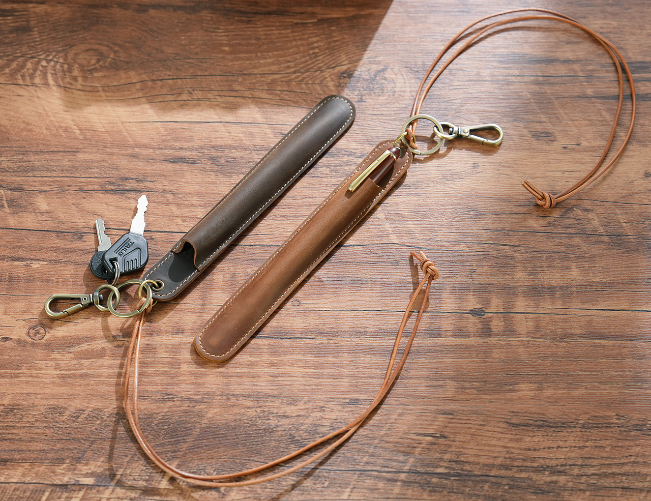Vintage Top-Grain Leather Pen Sleeve with Neck Strap