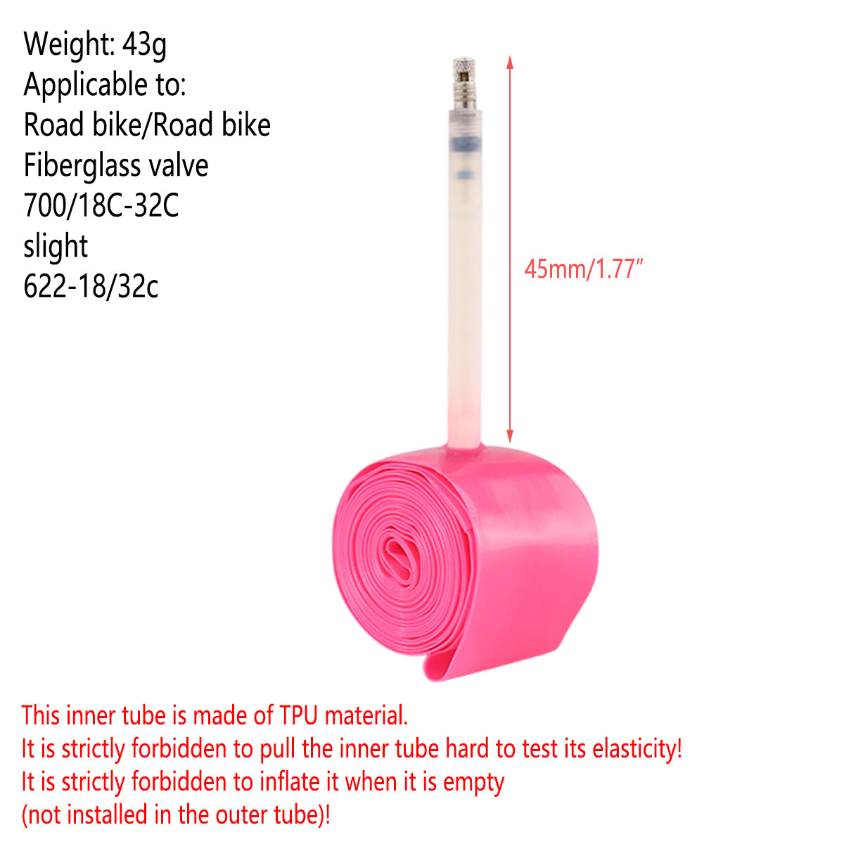 Elevate your cycling with these road and mountain bike inner tubes.Crafted from ultra – light TPU, they offer durability, flexibility, and puncture resistance for long rides.The 45mm French valve ensures easy inflation, and the vibrant pink hue adds style while enhancing visibility.Lightweight and compact, they’re ideal as spares for 700C wheels (18C – 32C), suiting road and mountain bikes.