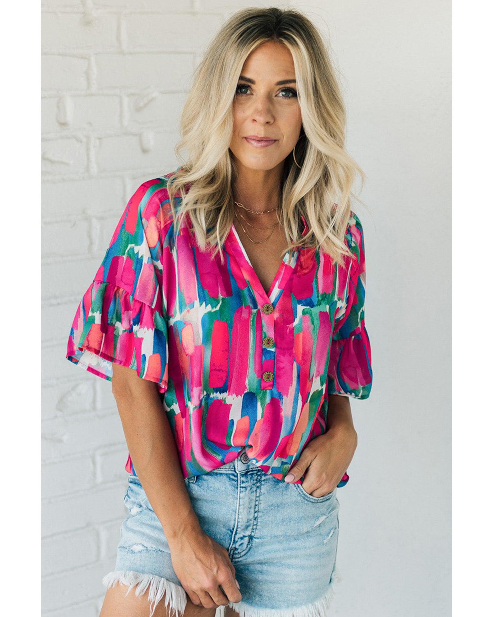 Rose Abstract Brushwork Print Buttoned V Neck Blouse – S