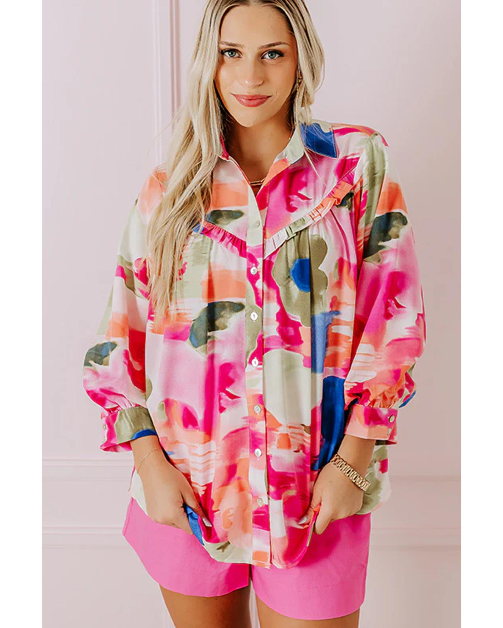 Rose Abstract Print Ruffled Puff Sleeve Shirt – L