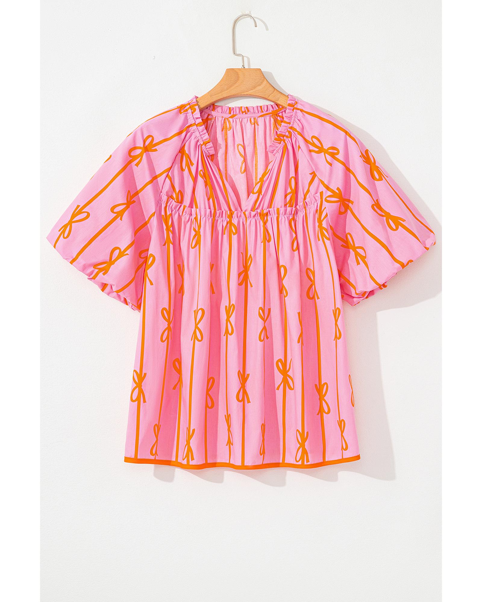 Rose Bowknot Print Shirred V Neck Puff Sleeve Plus Size Blouse – 1X