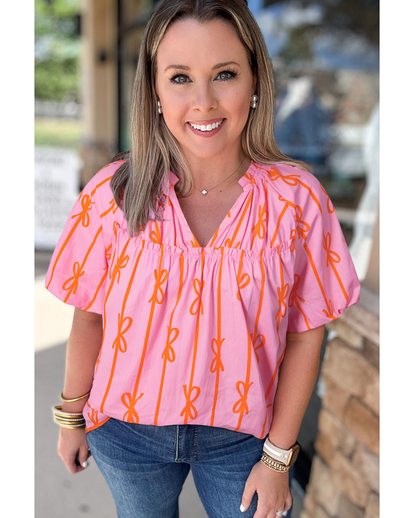 Rose Bowknot Print Shirred V Neck Puff Sleeve Plus Size Blouse – 2X