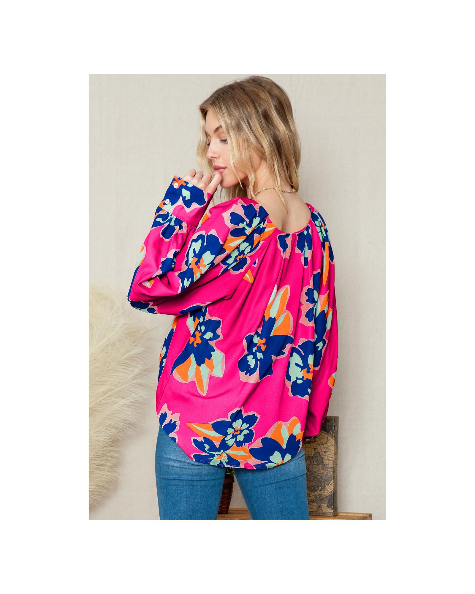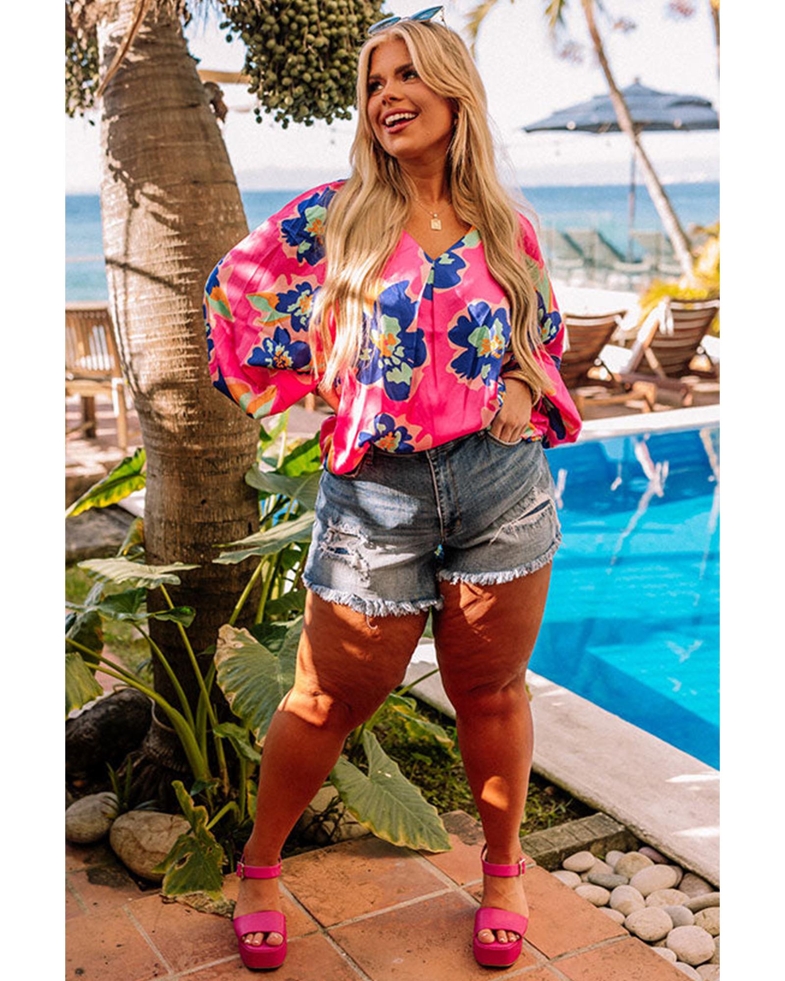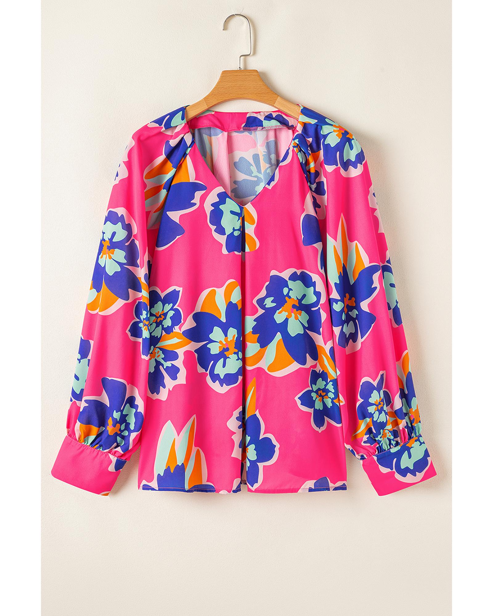 Rose Floral Pattern V Neck Balloon Sleeve Plus Size Blouse – 3X