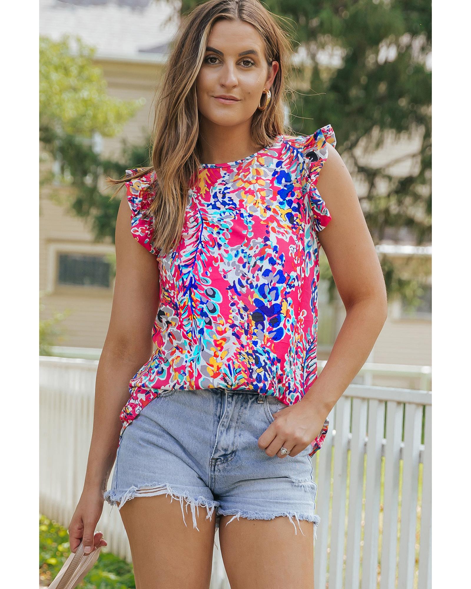 - Gorgeous tank top featuring a blooming floral print and flattering ruffle sleeves