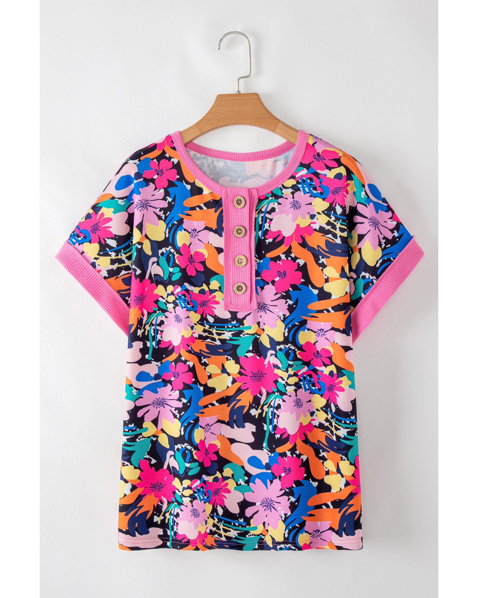 Rose Floral Short Sleeve Contrast Edge Plus Size Henley Top – 1X