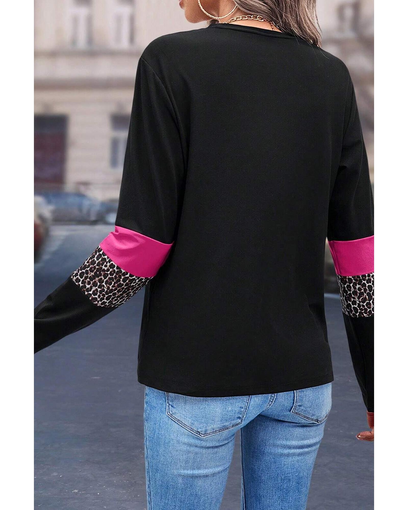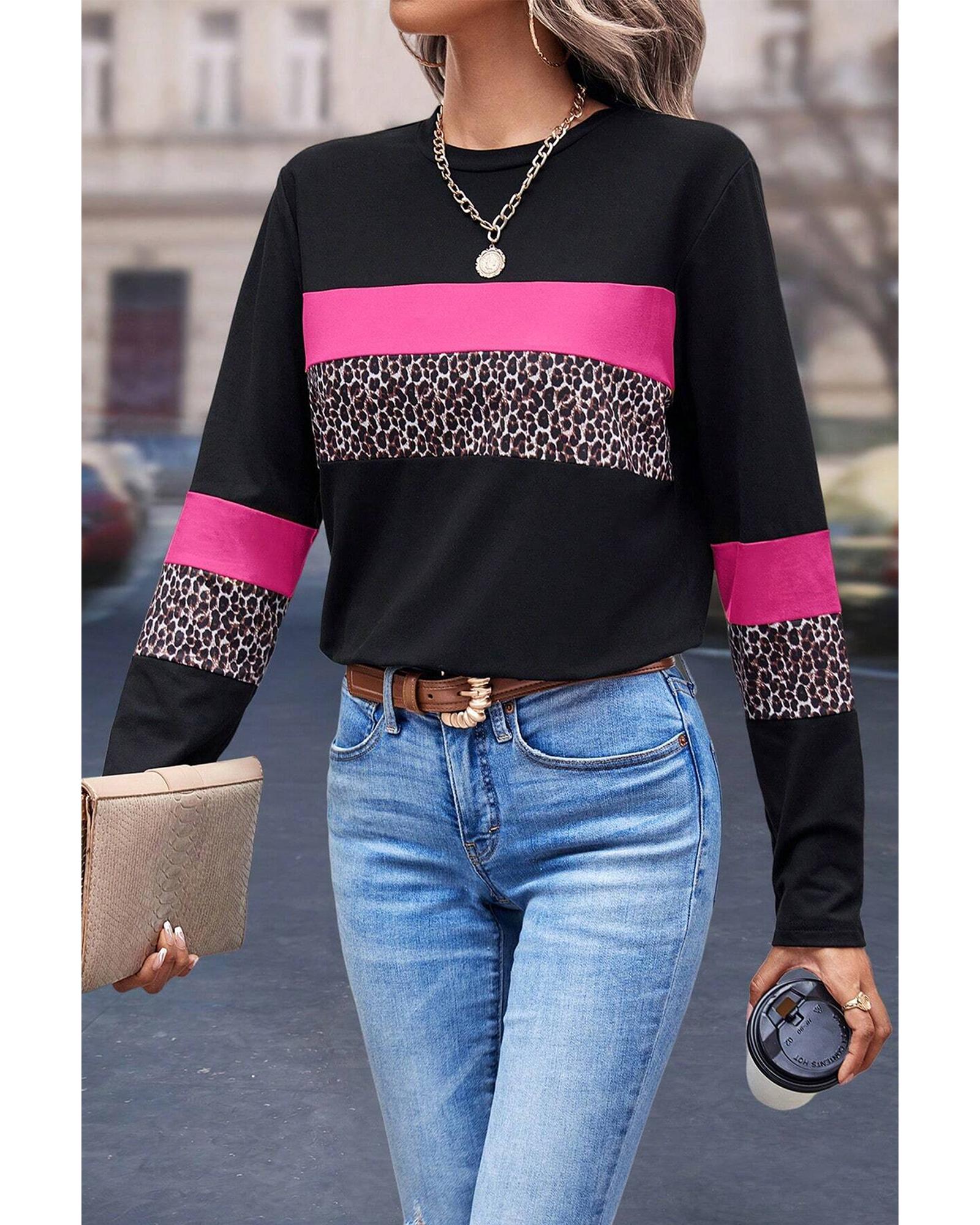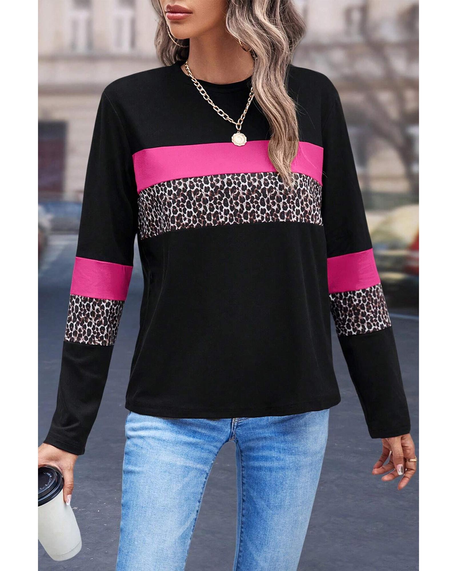 - Rose Leopard Colorblock Patchwork Crew Neck Long Sleeve Tee