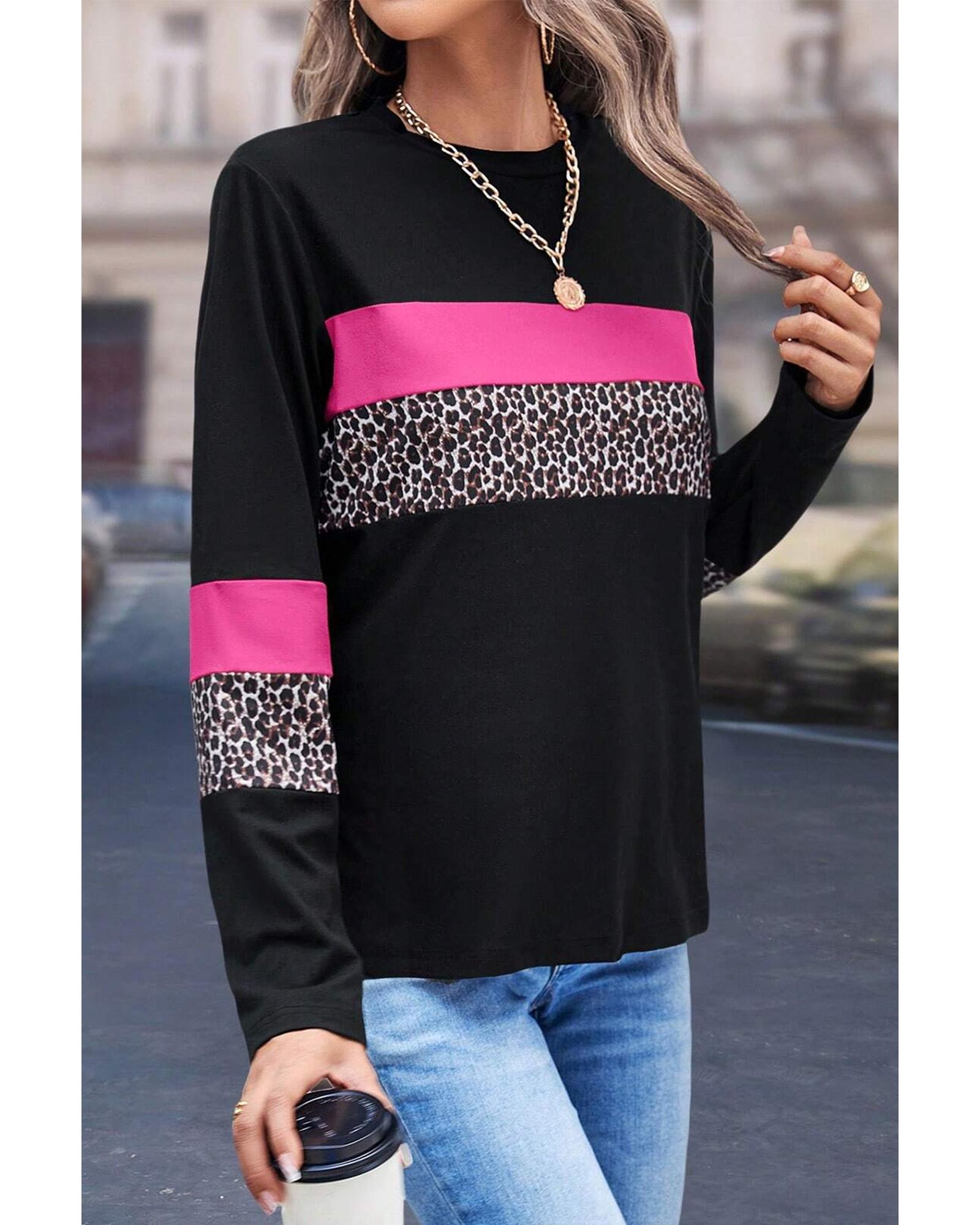 - Rose Leopard Colorblock Patchwork Crew Neck Long Sleeve Tee