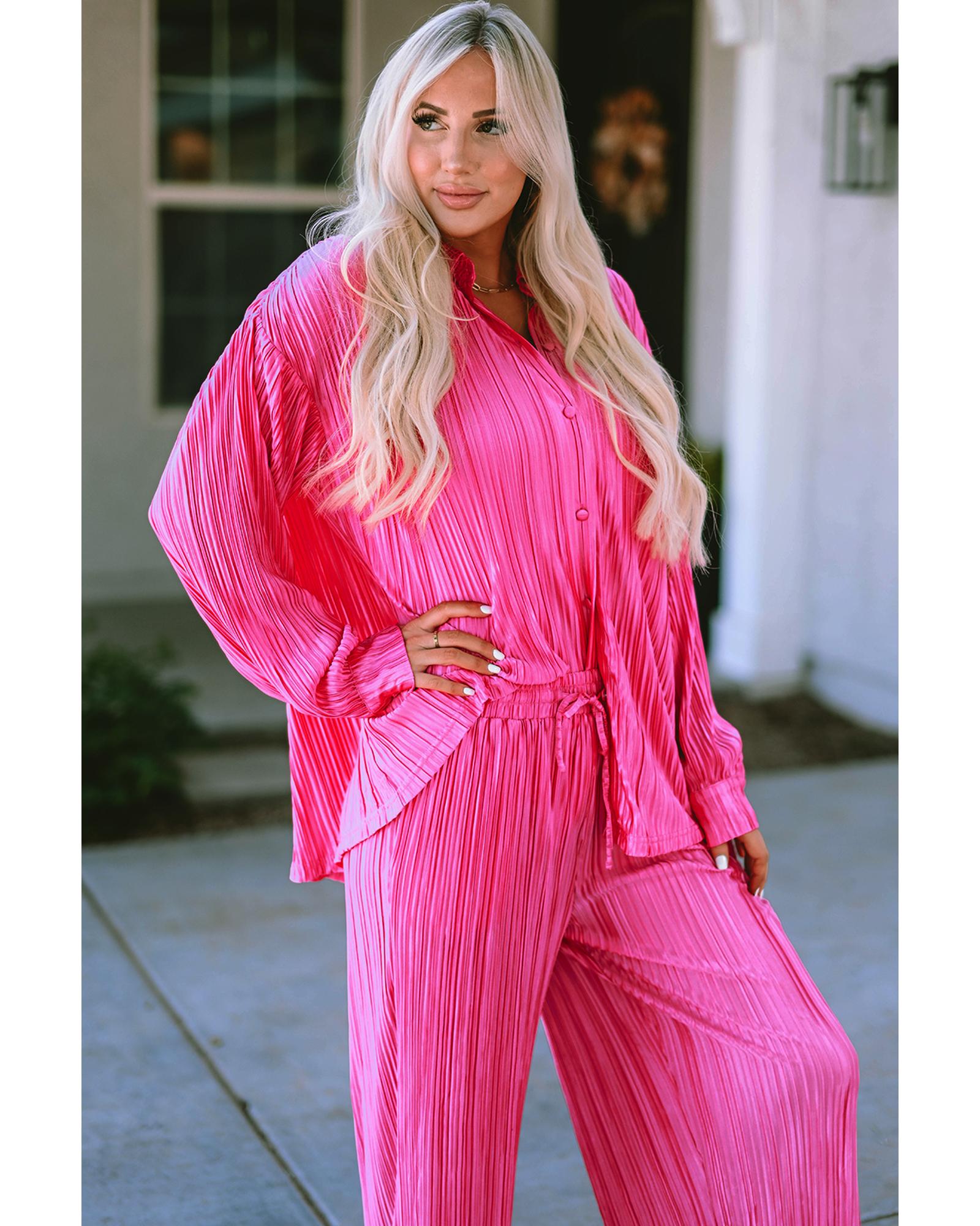 Rose Pleated Long Sleeve Shirt and Wide-Leg Pants Set – XL