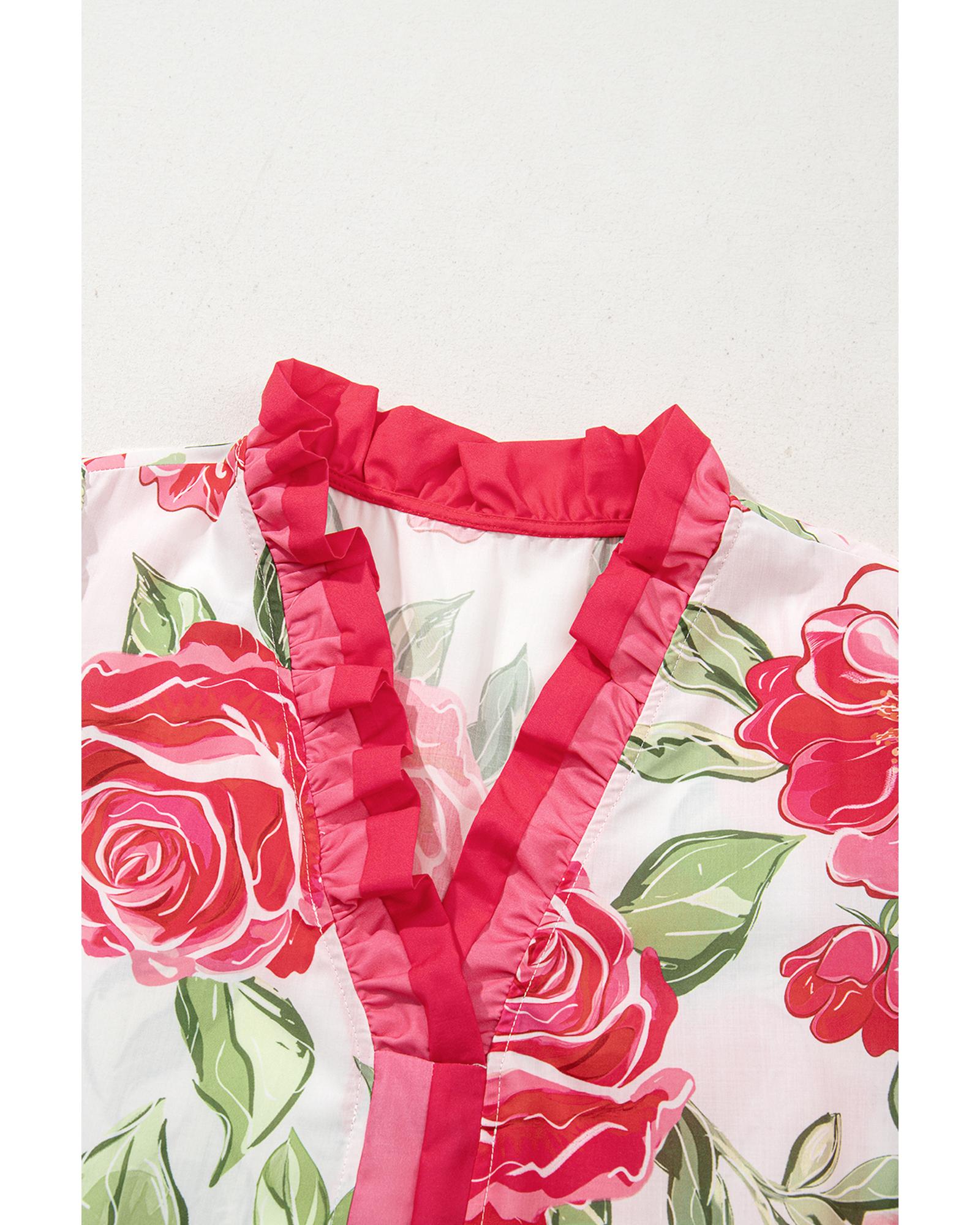 Rose Plus Size Floral Print Frilled Stripes Detail Short Sleeve Blouse – 3X