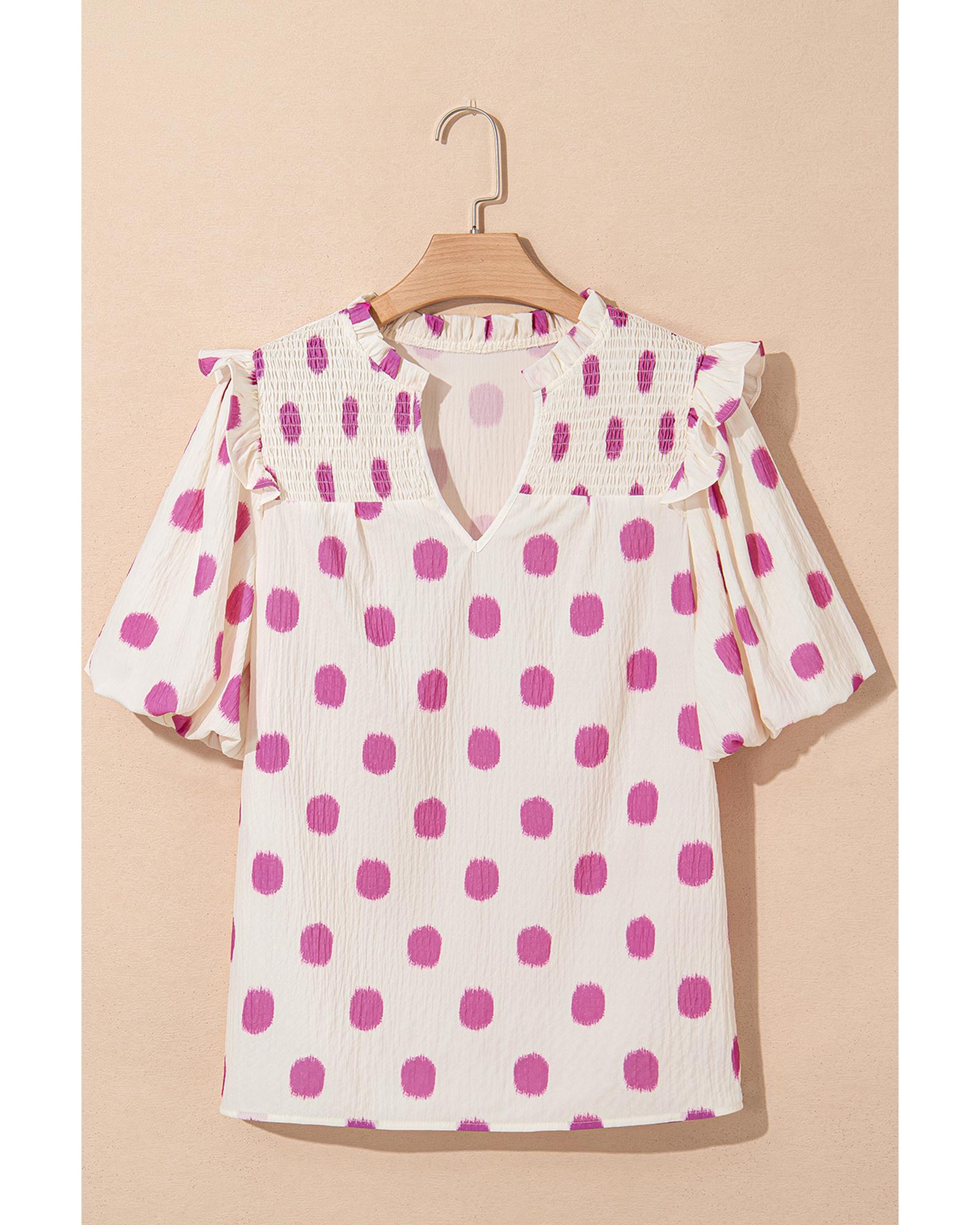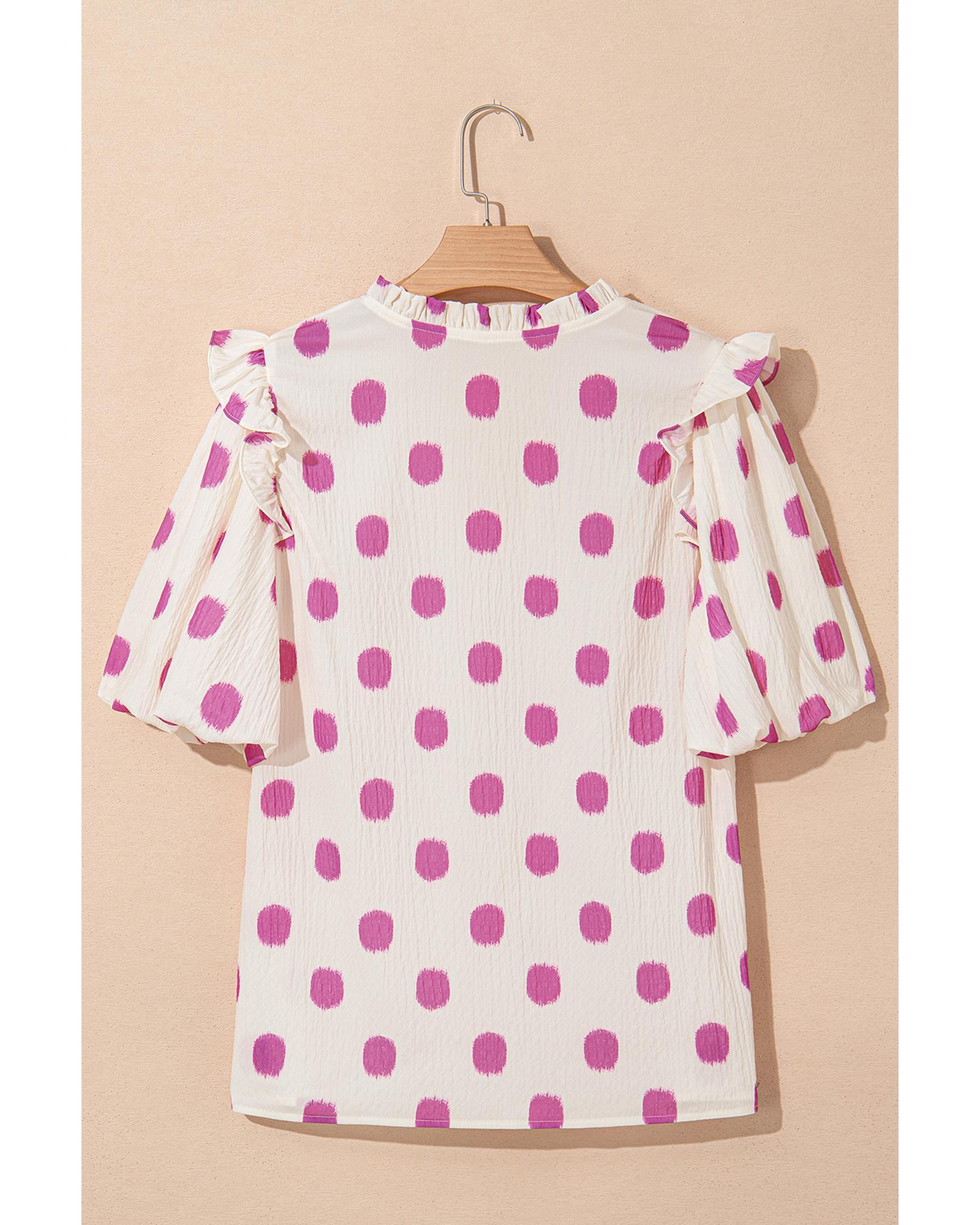 Rose Polka Dot Print Shirred Yoke Notched Neck Balloon Sleeve Blouse – XL