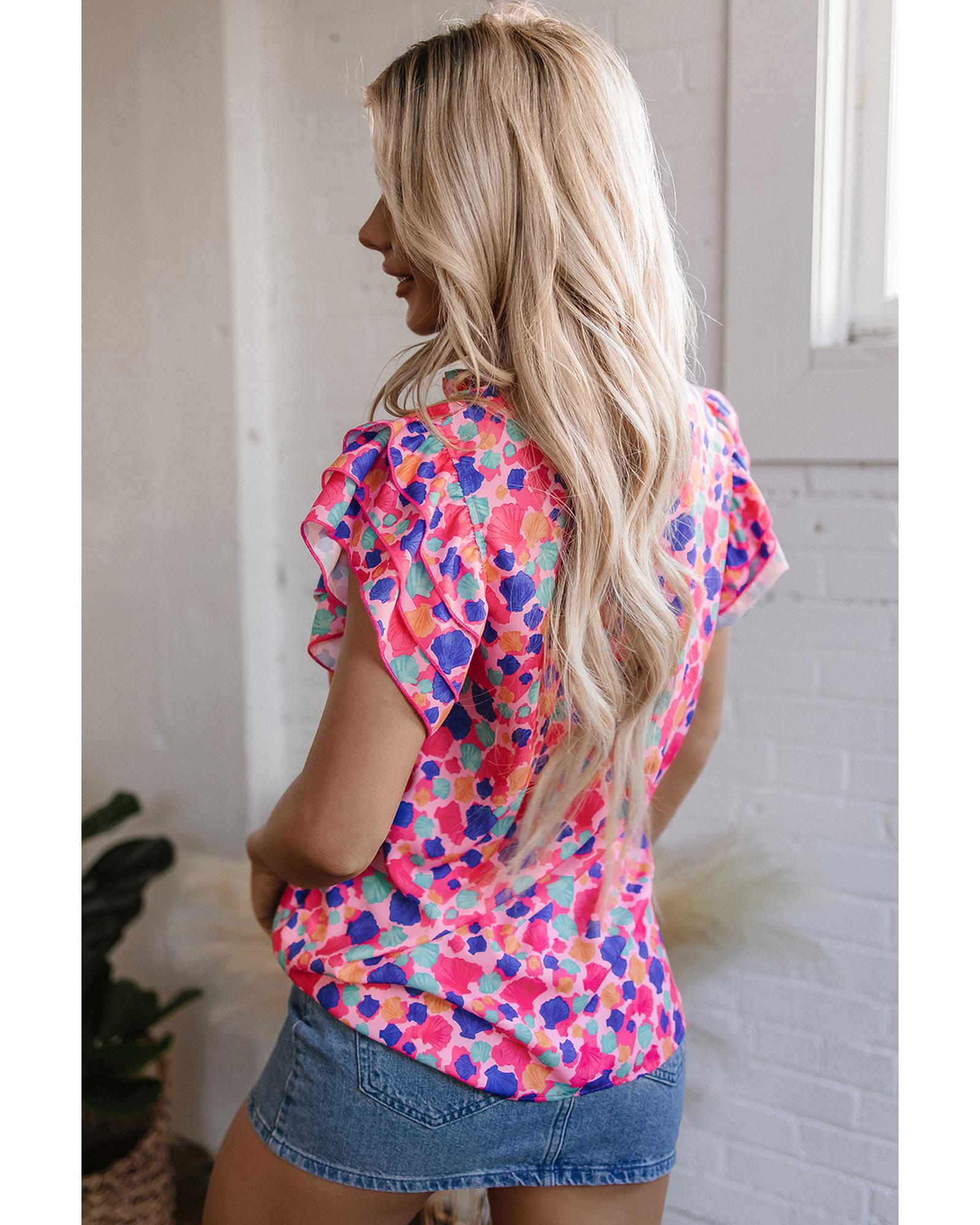 Rose Red Abstract Print Ruffled Sleeve V Neck Blouse – XL