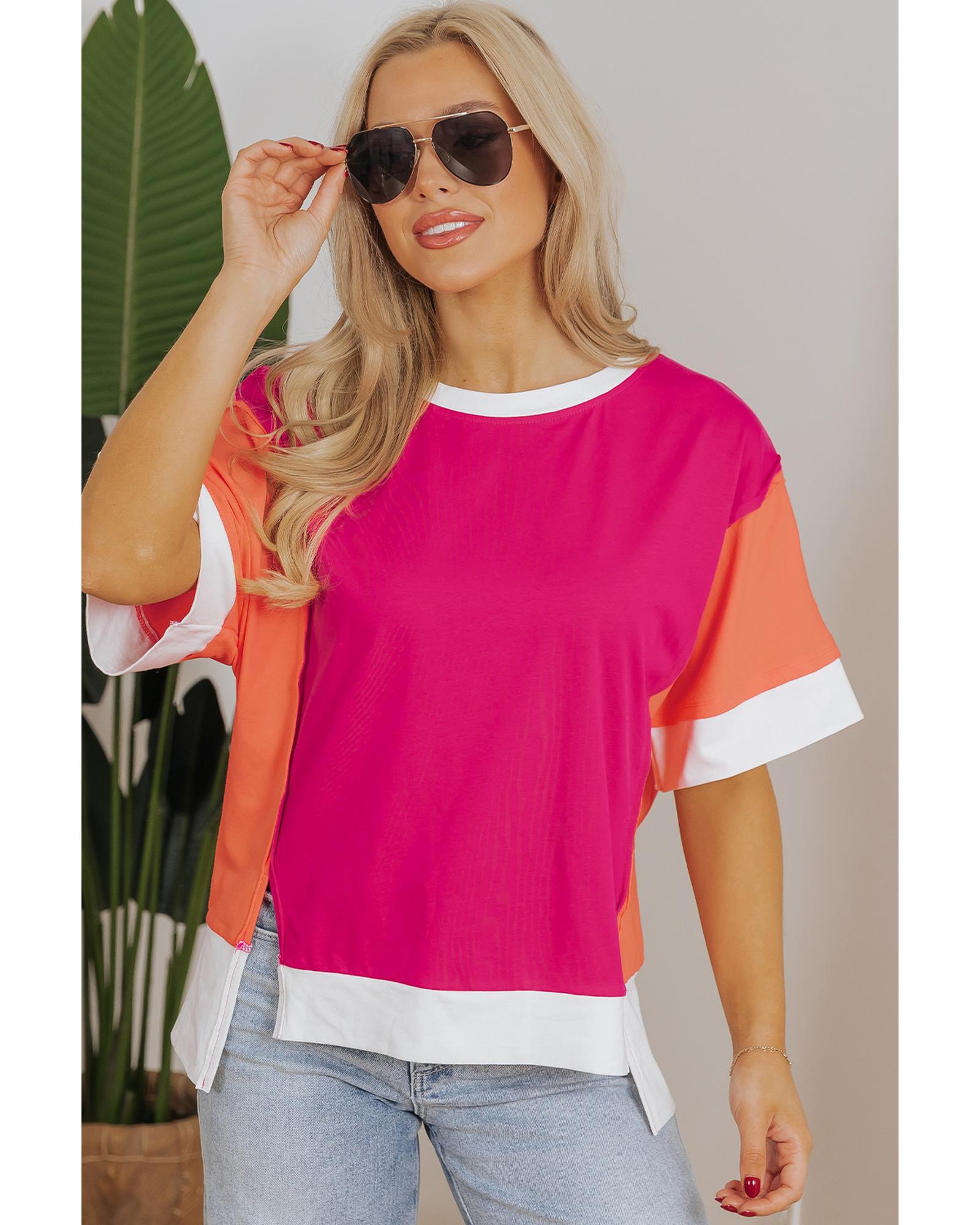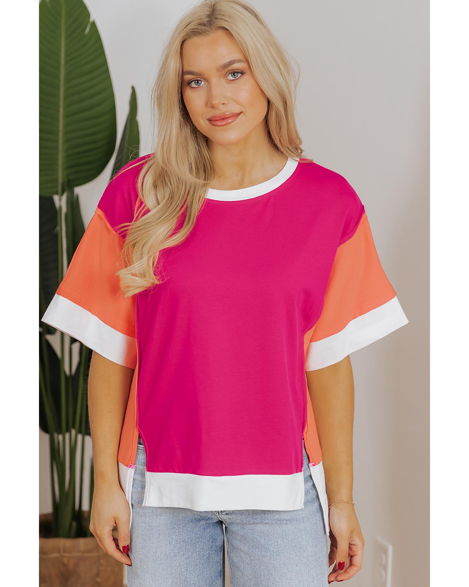 Rose Red Color Block Patchwork Side Slits Loose Fit T Shirt – M