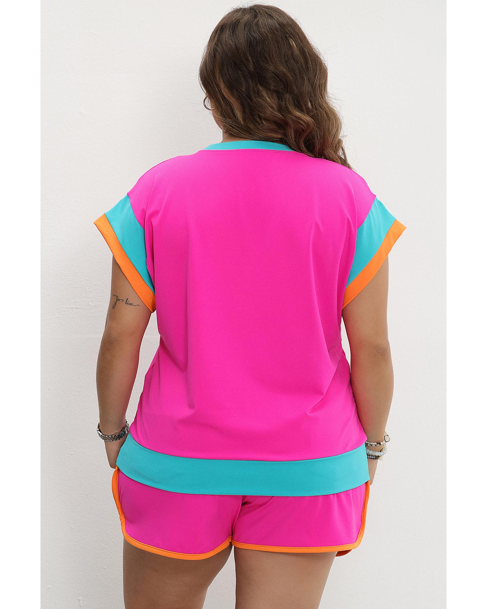 Rose Red Colorblock Patchwork Cap Sleeve Top Plus Size Shorts Set - 1X