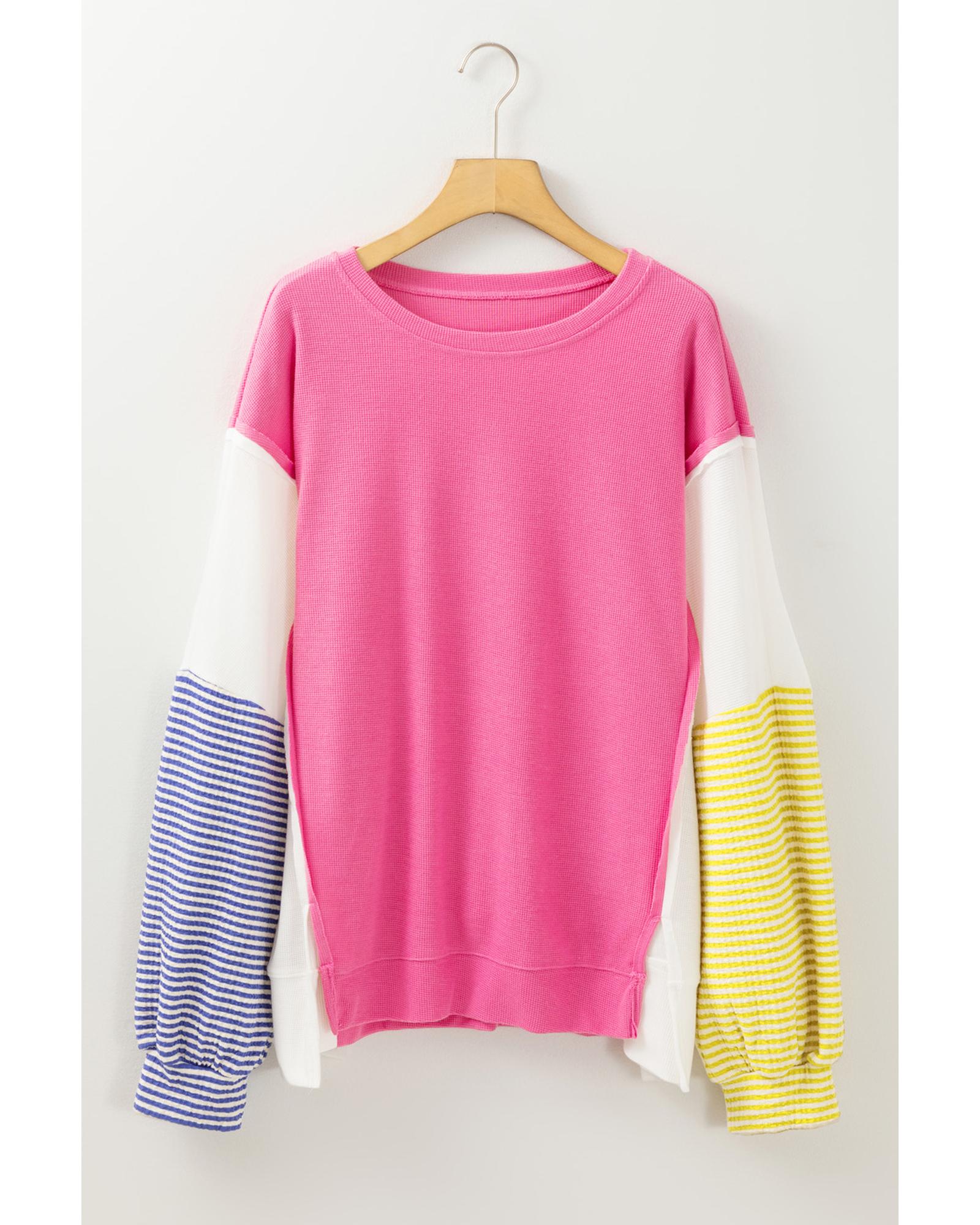 Rose Red Colorblock Patchwork Striped Puff Sleeve Plus Size Top with Slits – 4X