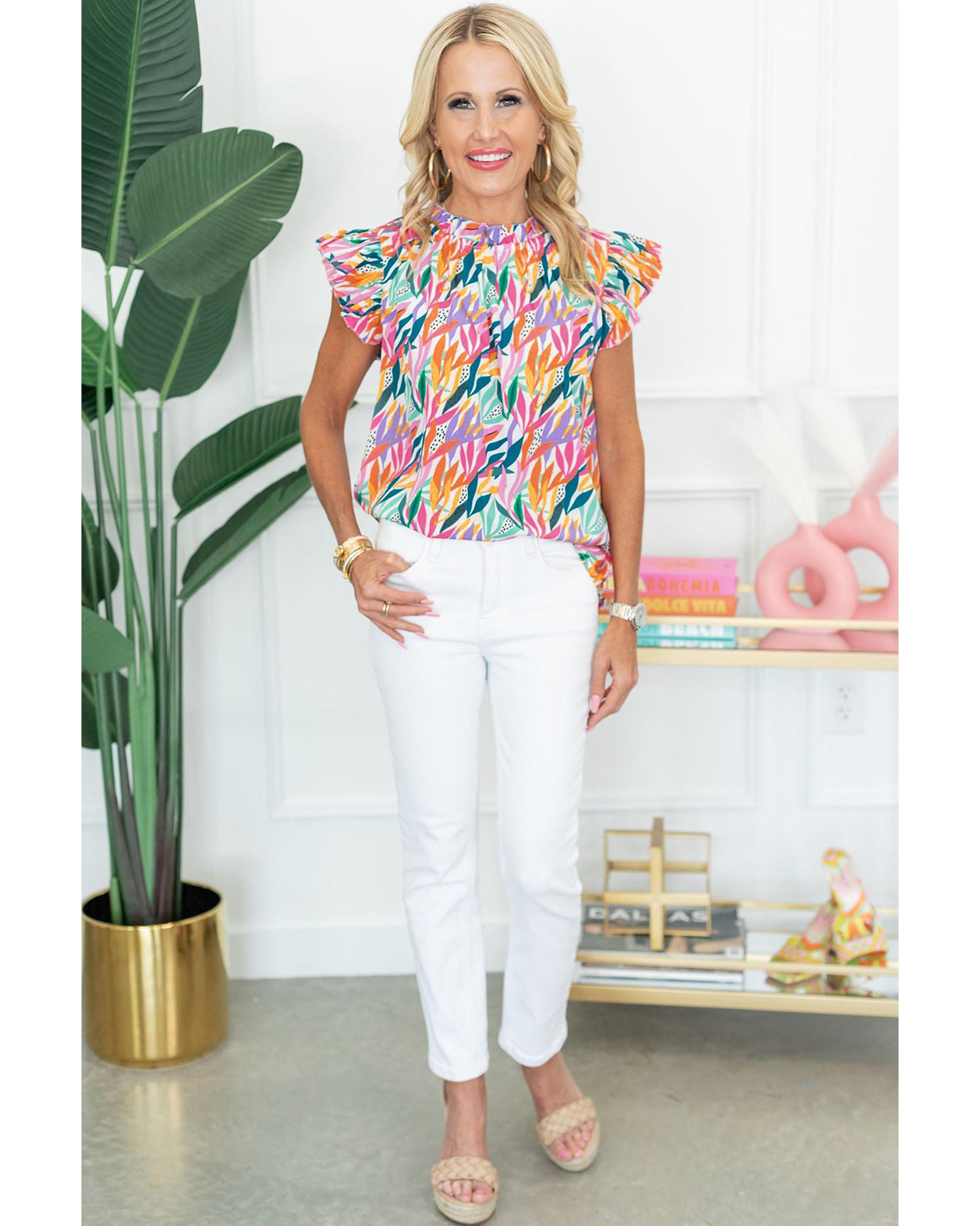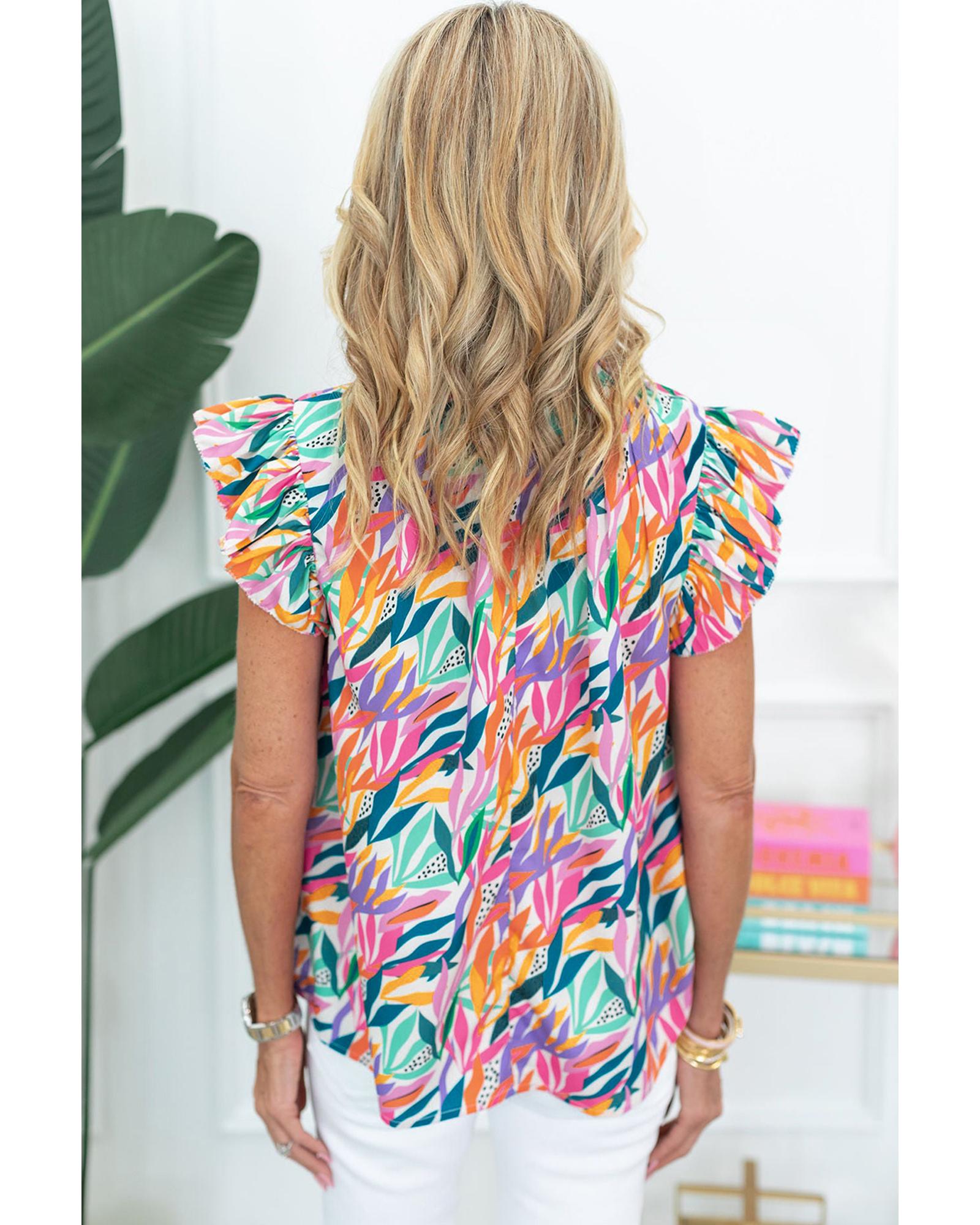 Rose Red Floral Print Ruffled Flutter Sleeve Blouse – L