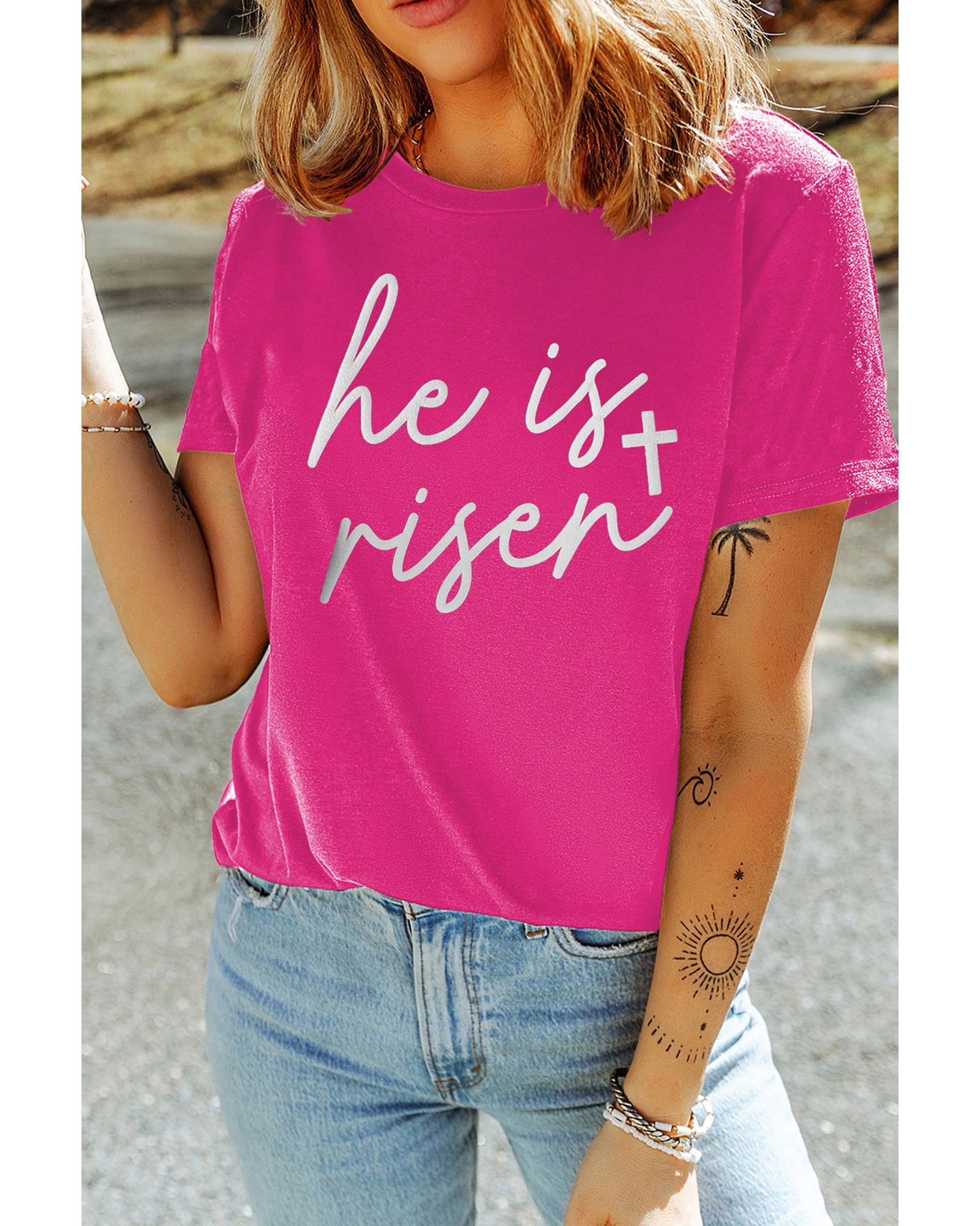 - Rose Red Glitter He is Risen Cross Printed Crewneck Tee