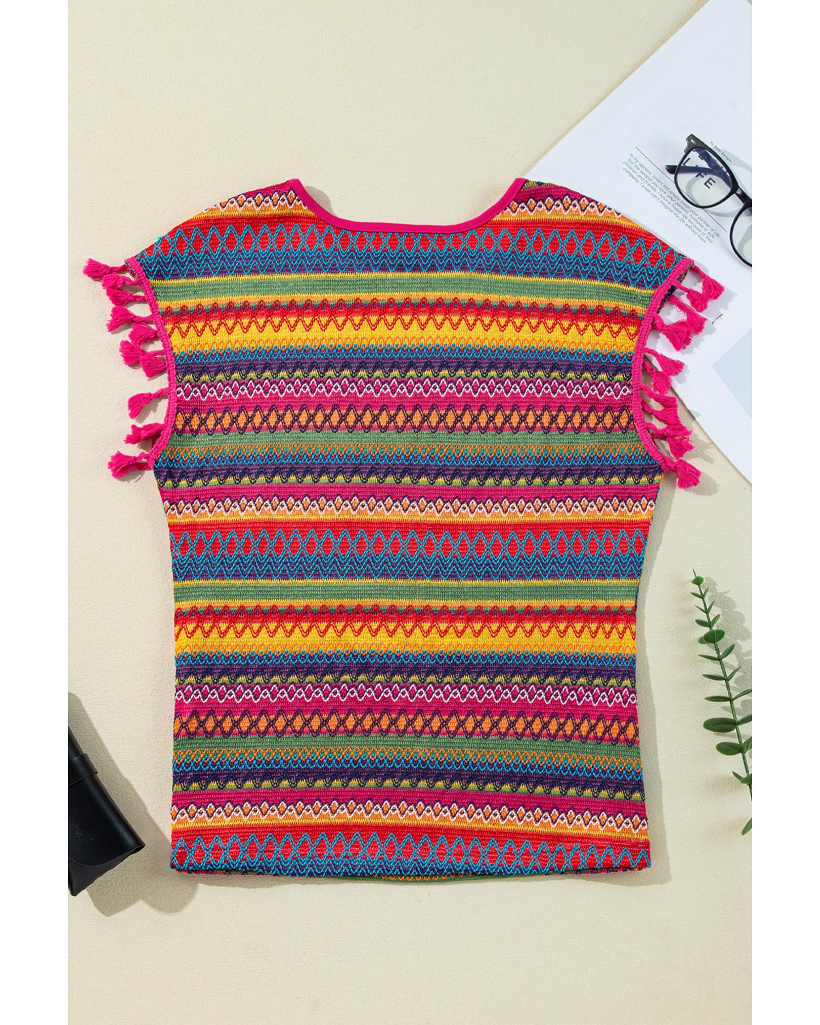 Rose Red Jacquard Textured Tasseled Cap Sleeve Top – L