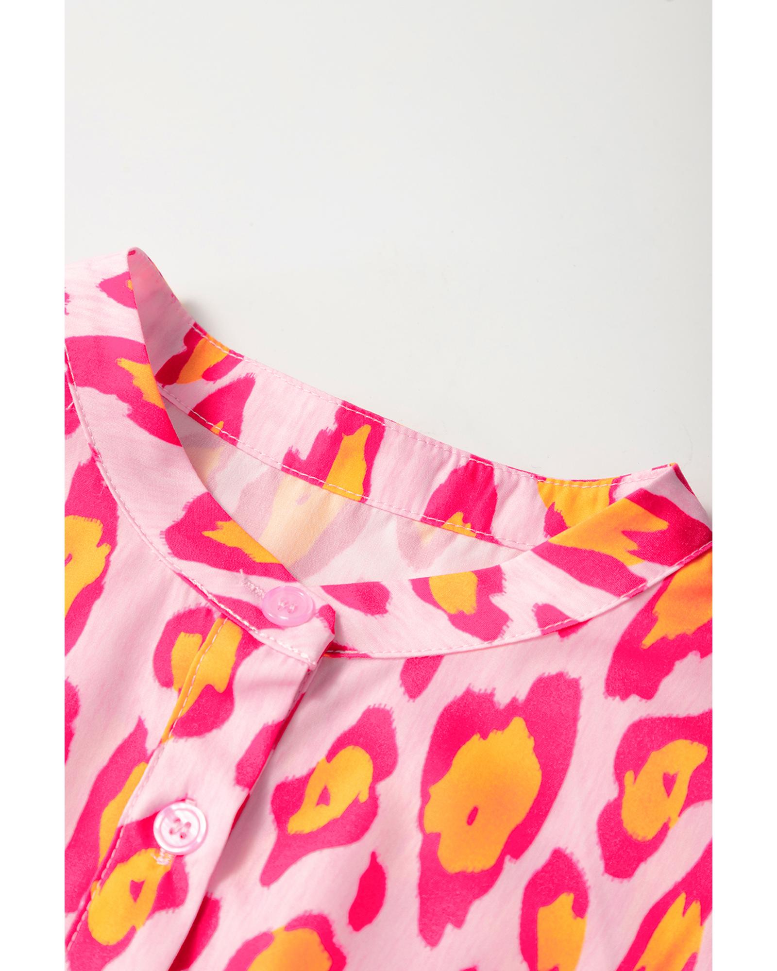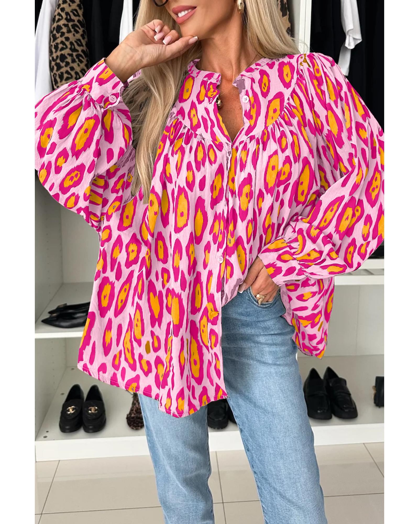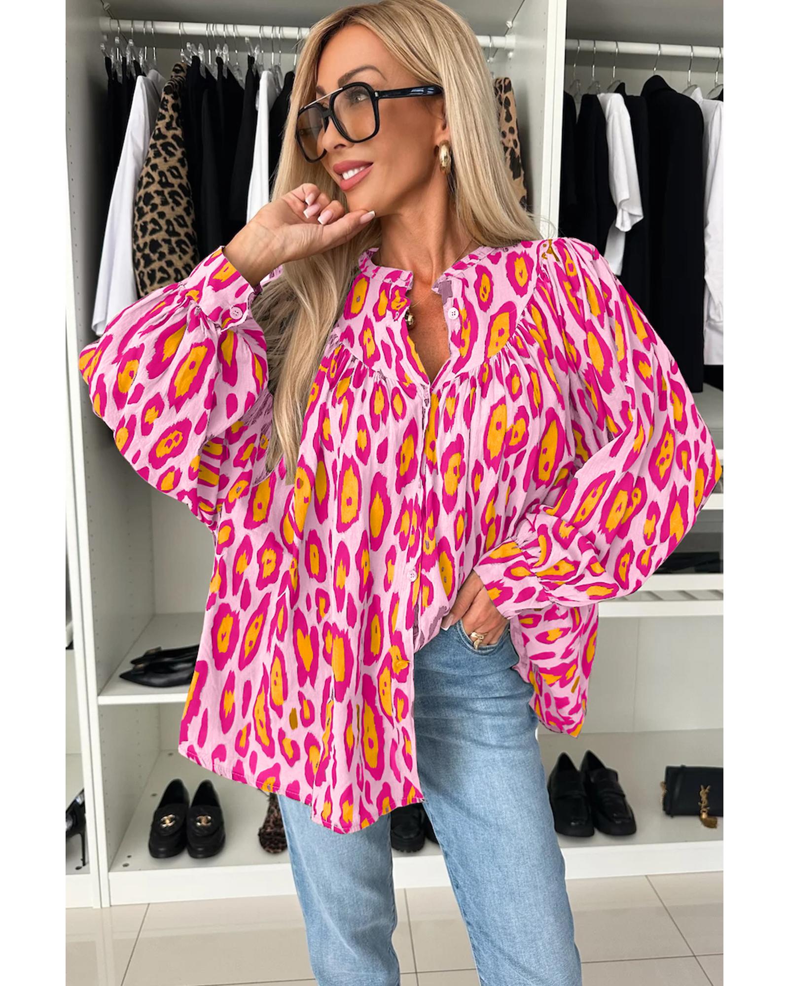 Rose Red Oversized Leopard Print Balloon Sleeve Casual Shirt – XL
