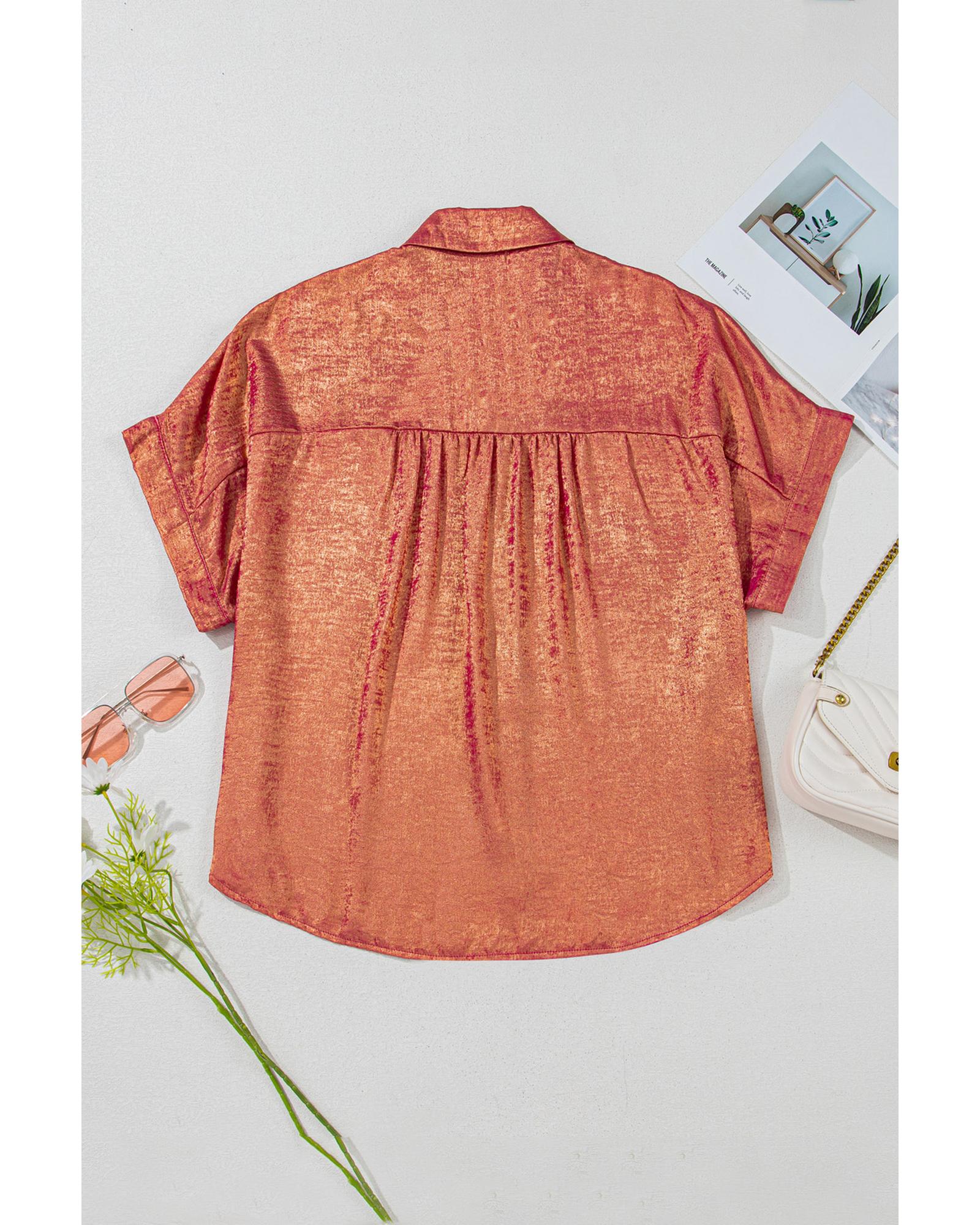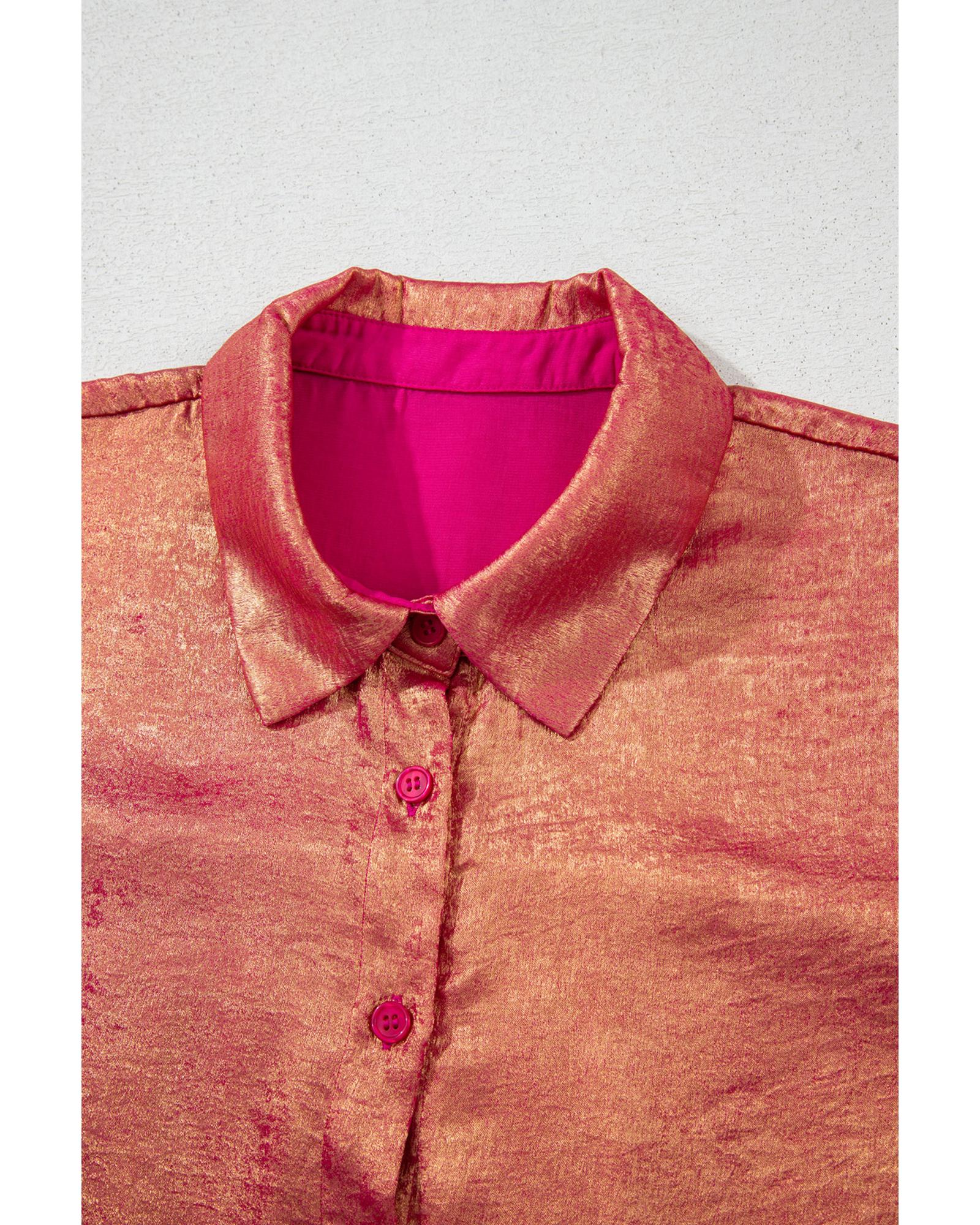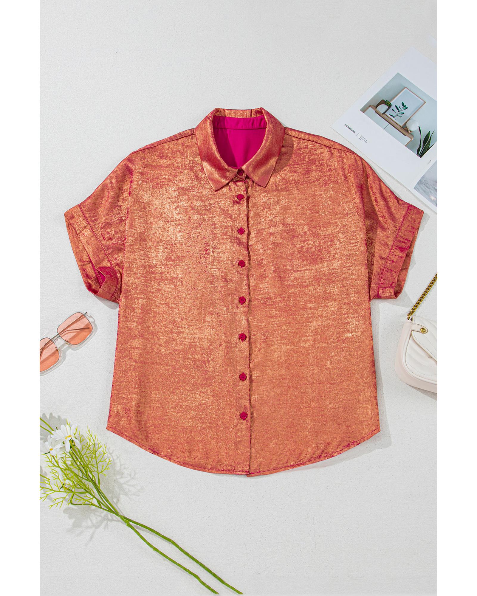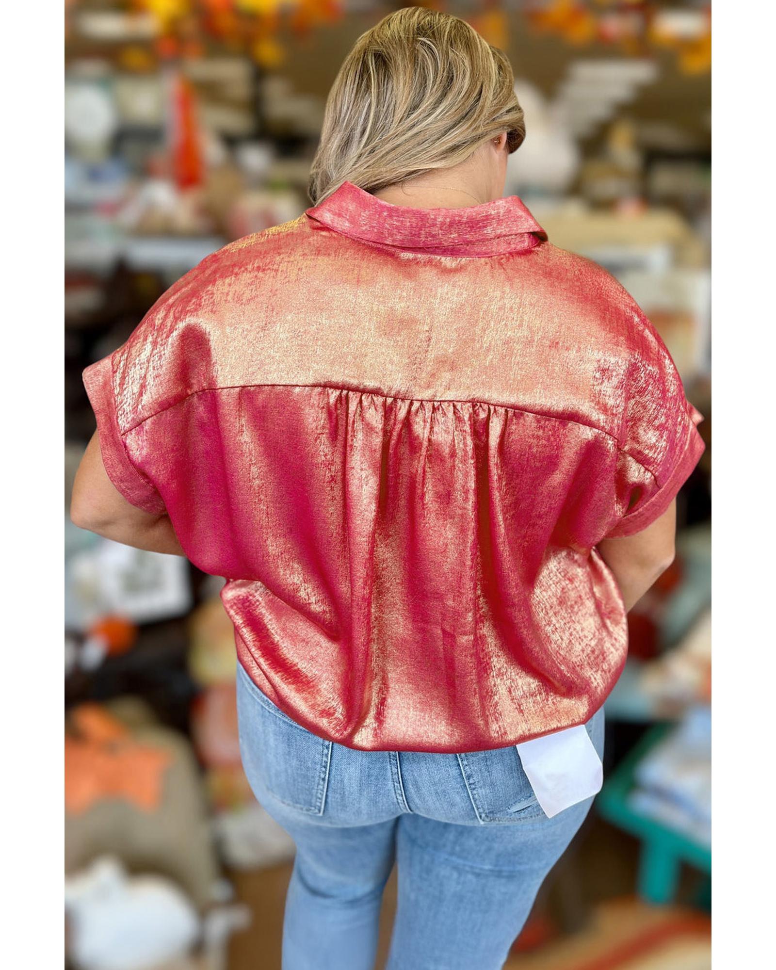 - Rose Red Plus Size Metallic Sheen Short Sleeve Button Up Shirt